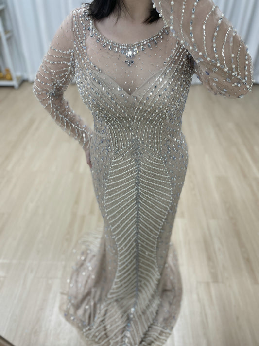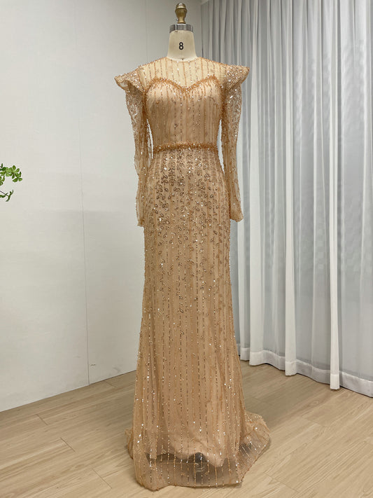 Champagne Long Sleeve Beaded Mermaid Evening Gown - Elegant Formal Dress MC20099