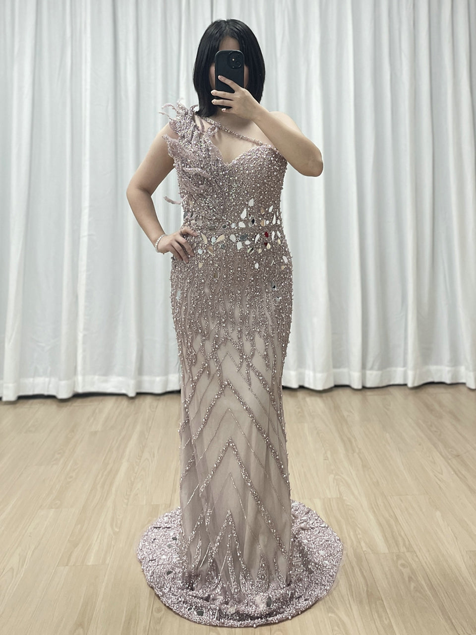 Sparkling Pink Evening Gown with One-Shoulder Asymmetrical Neckline MY30155