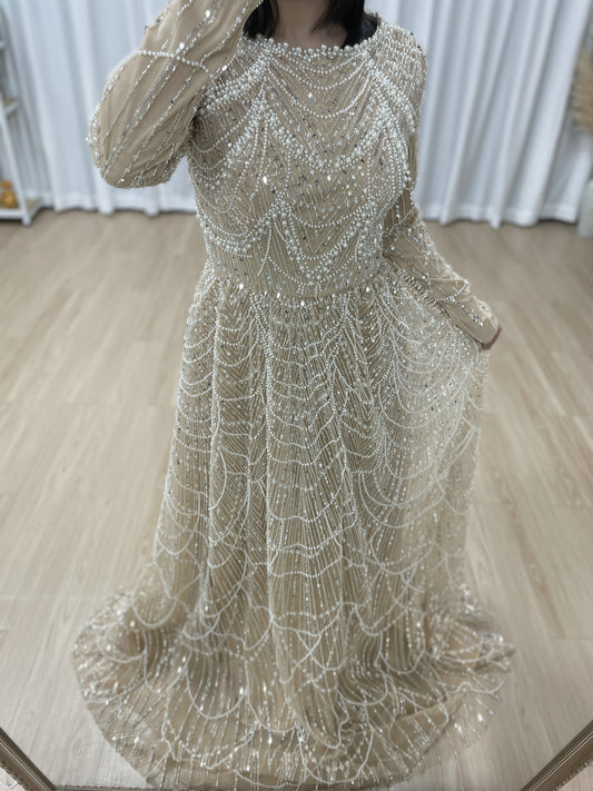 Modest Gold Sequin Pearl A-Line Prom Dress with Long Sleeves MY30183