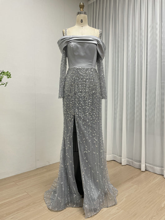 Silver Grey Off-the-Shoulder Beaded Evening Gown with Long Sleeves and Slit MY30202-2