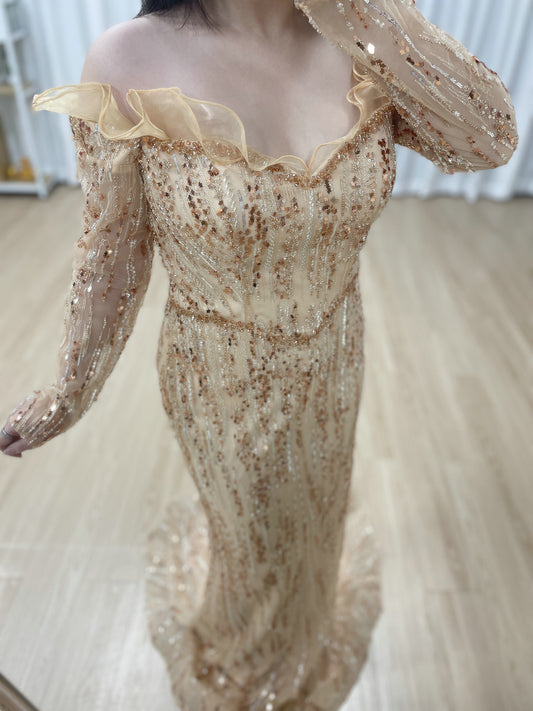 Shimmering Champagne Off-the-Shoulder Evening Gown with Ruffle Trim Beaded MY30220