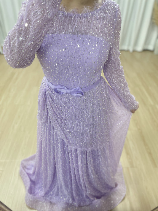 Lilac Sparkle Modest Beading lace Evening Gown with Draped Skirt & Bow Belt MY30221