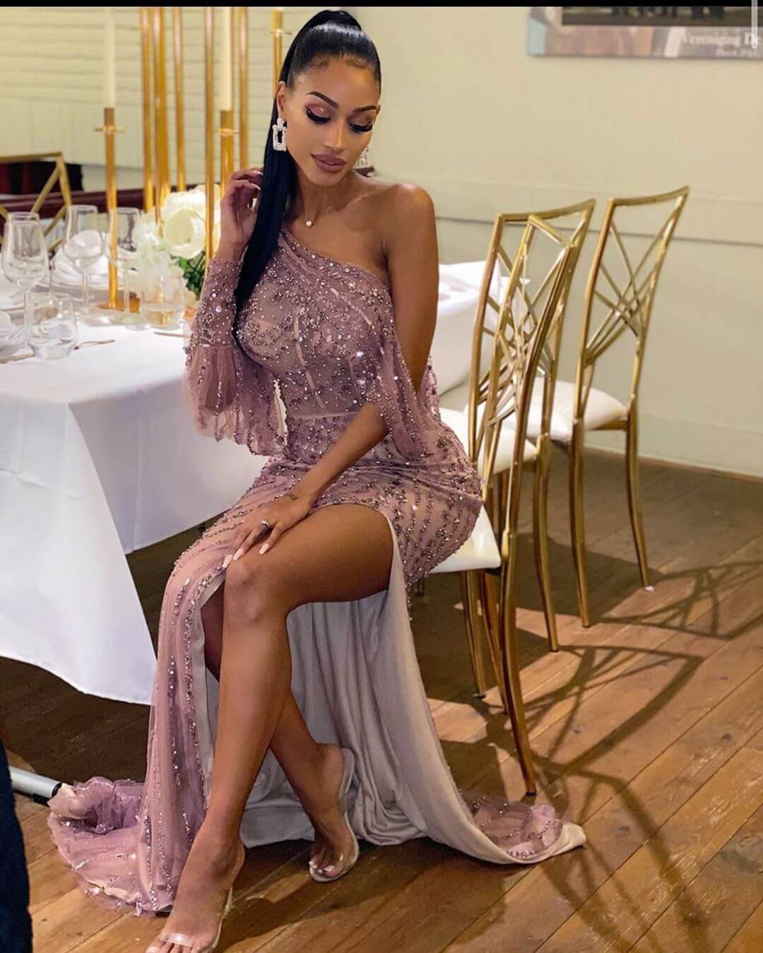 Sparkling Pink Evening Gown with One-Shoulder Asymmetrical Neckline MY30155