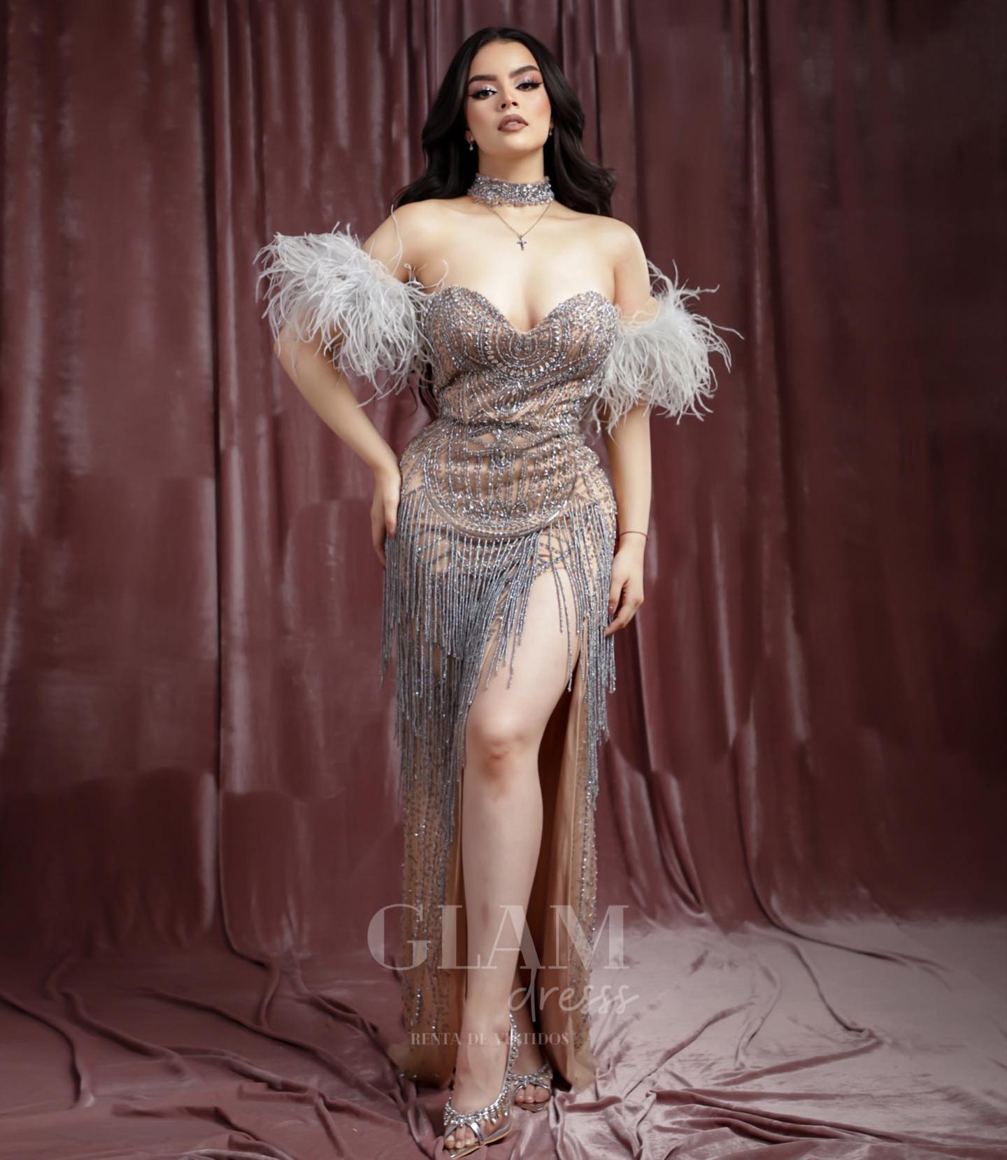 Light Blue Feather Cape Evening Dress with High Slit and Beads MY30206