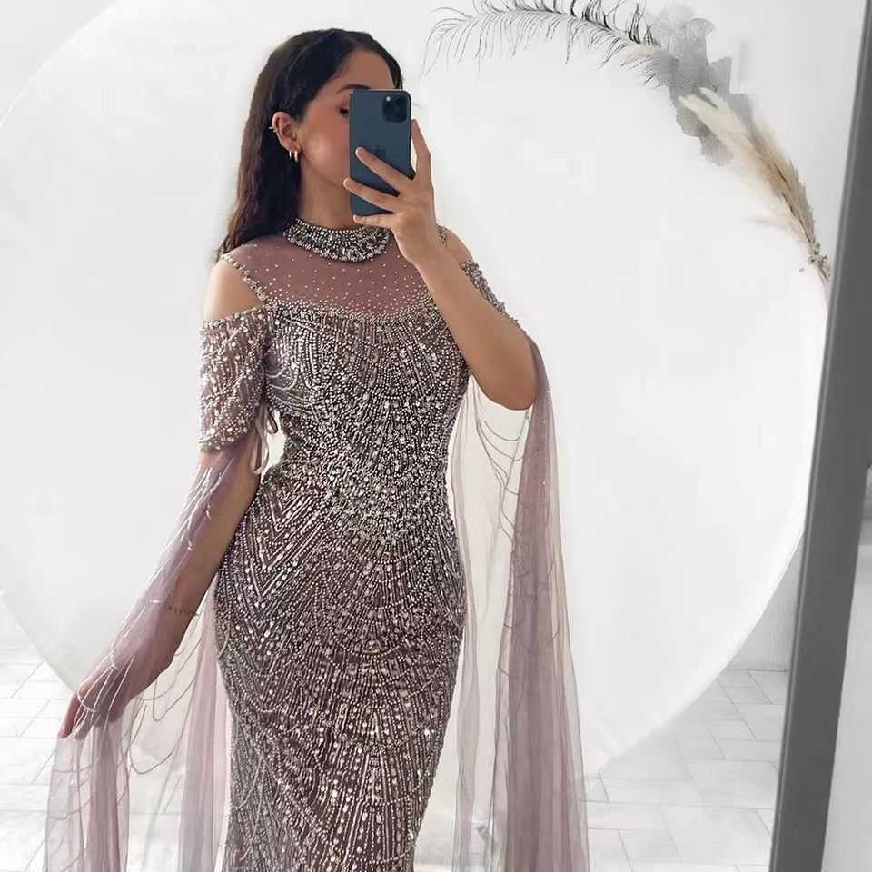 Silver Gray Halter Neck Beaded Gown with Peplum Sheer Cape MY30207