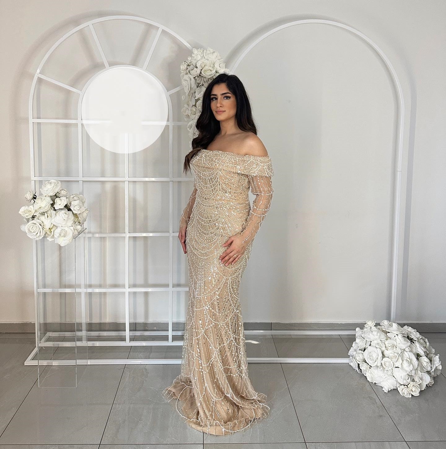 Luxury Champagne High Neck Beaded Evening Gown Crystal Long Sleeve Formal Dress MC20107