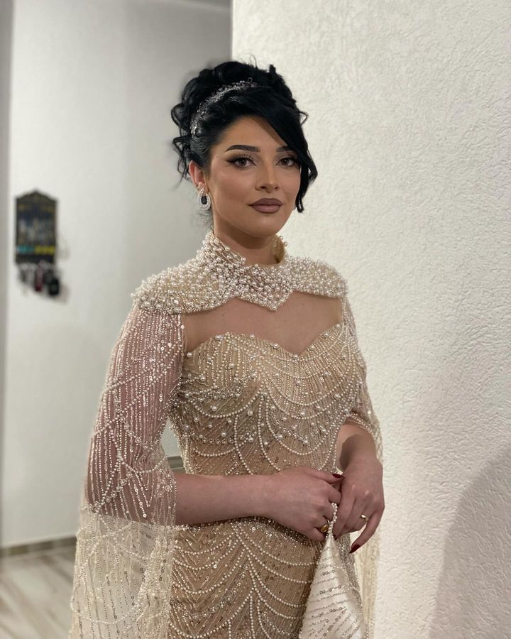 Luxury Pearl Beaded Champagne Gown with Satin Train Cape MY30205