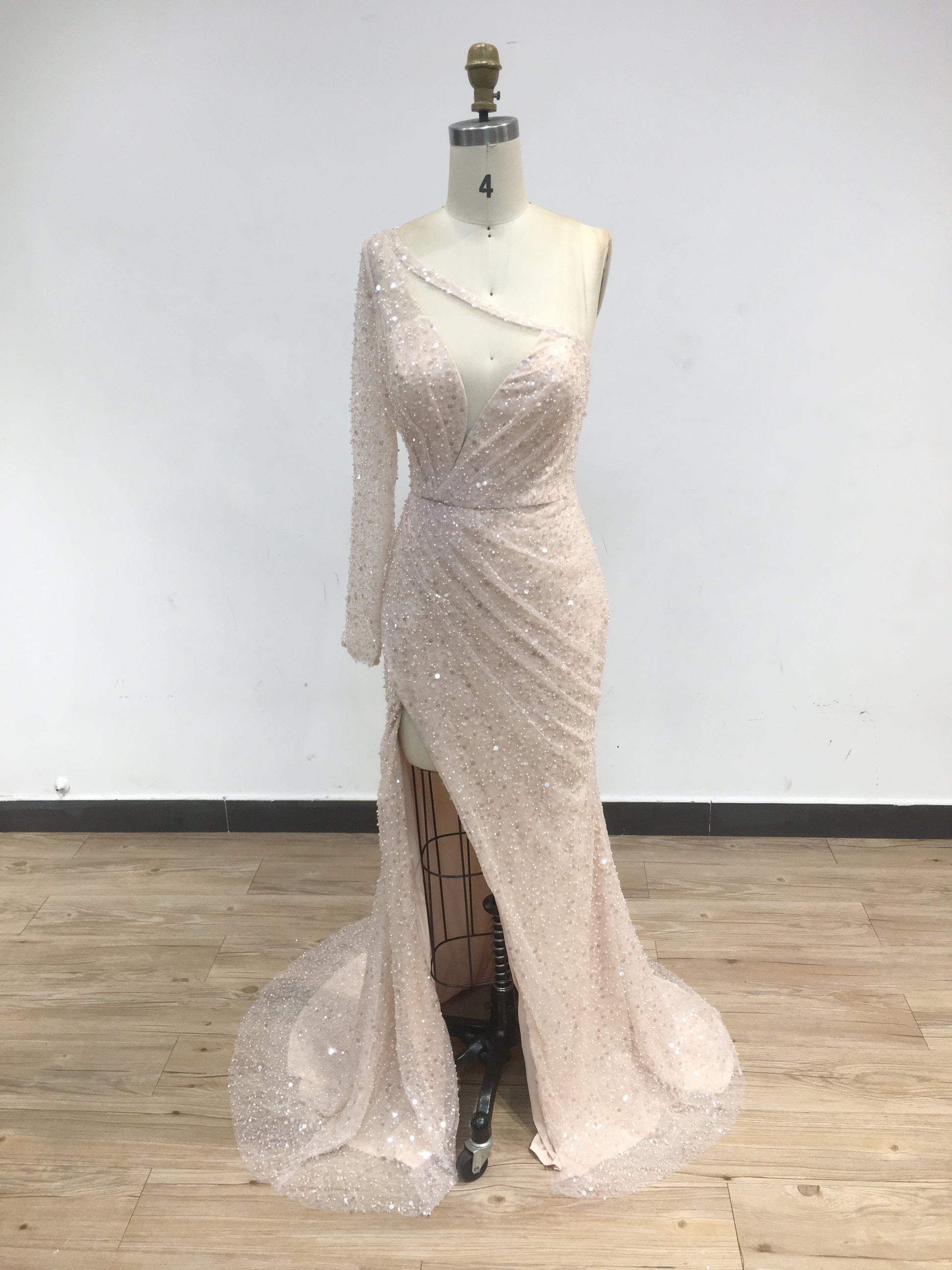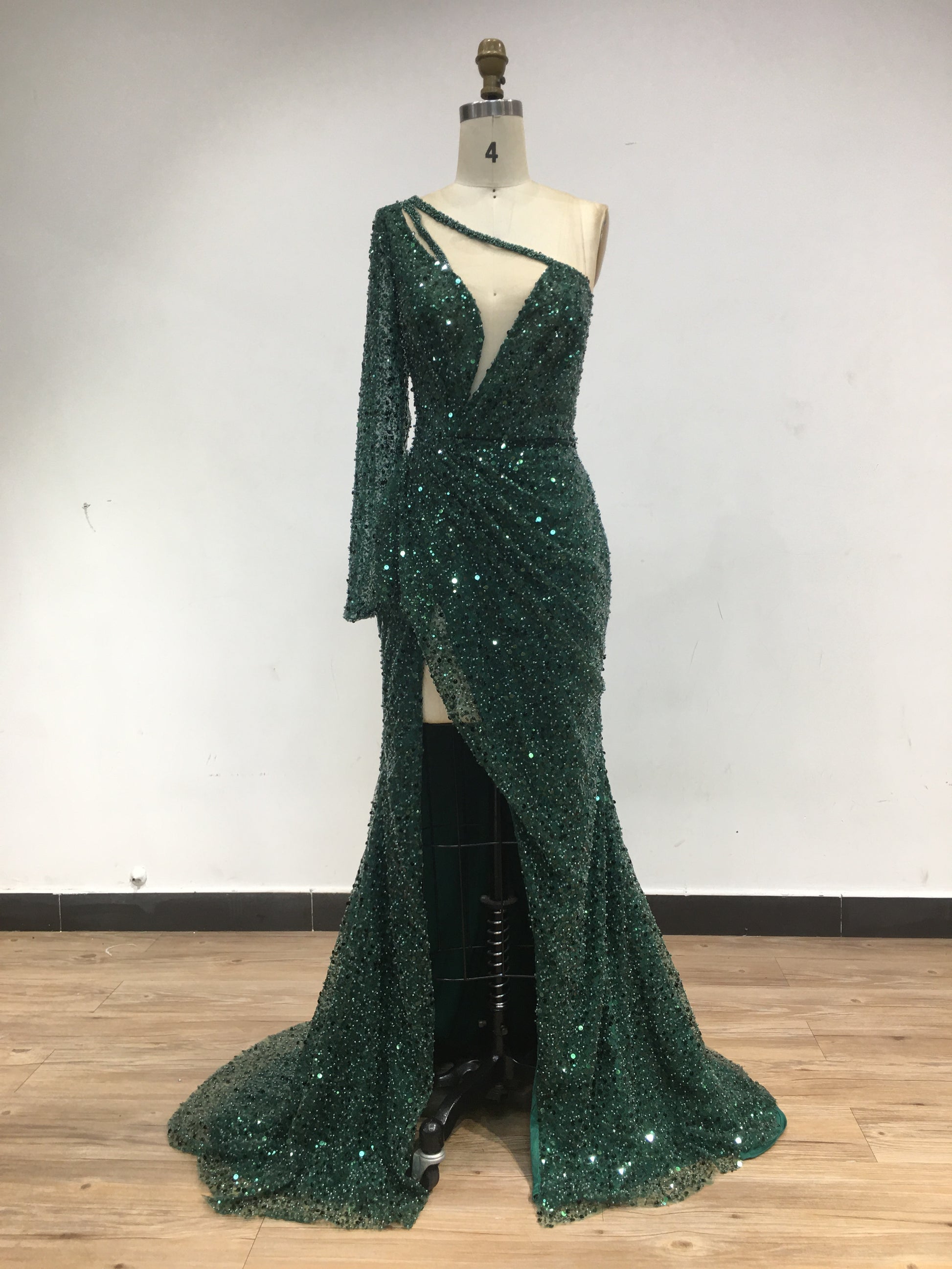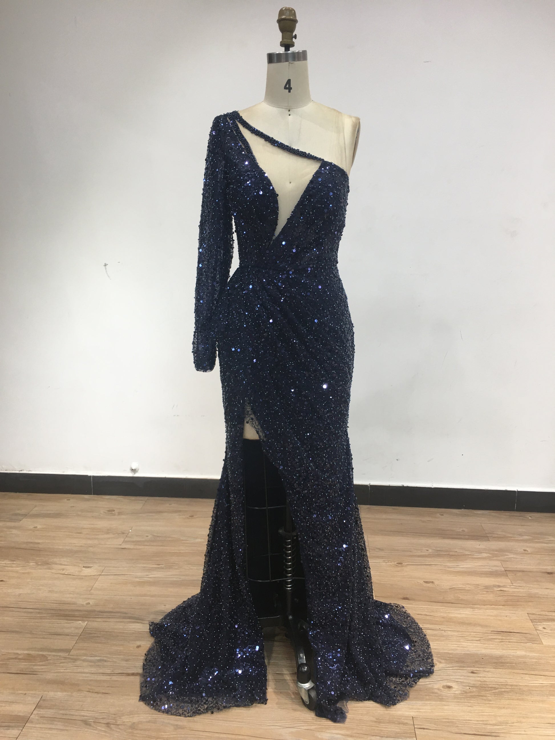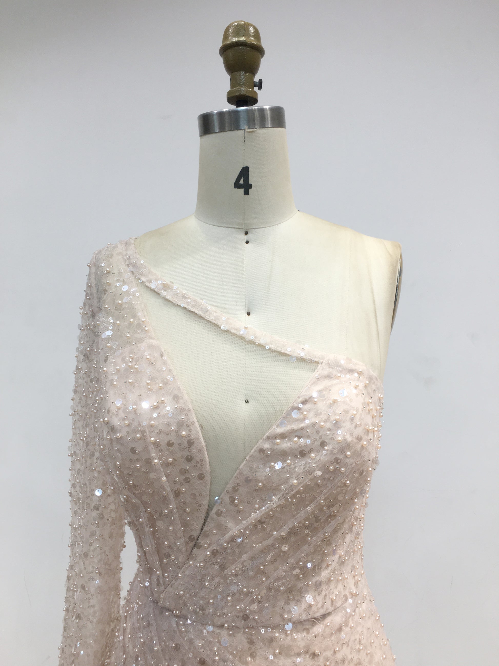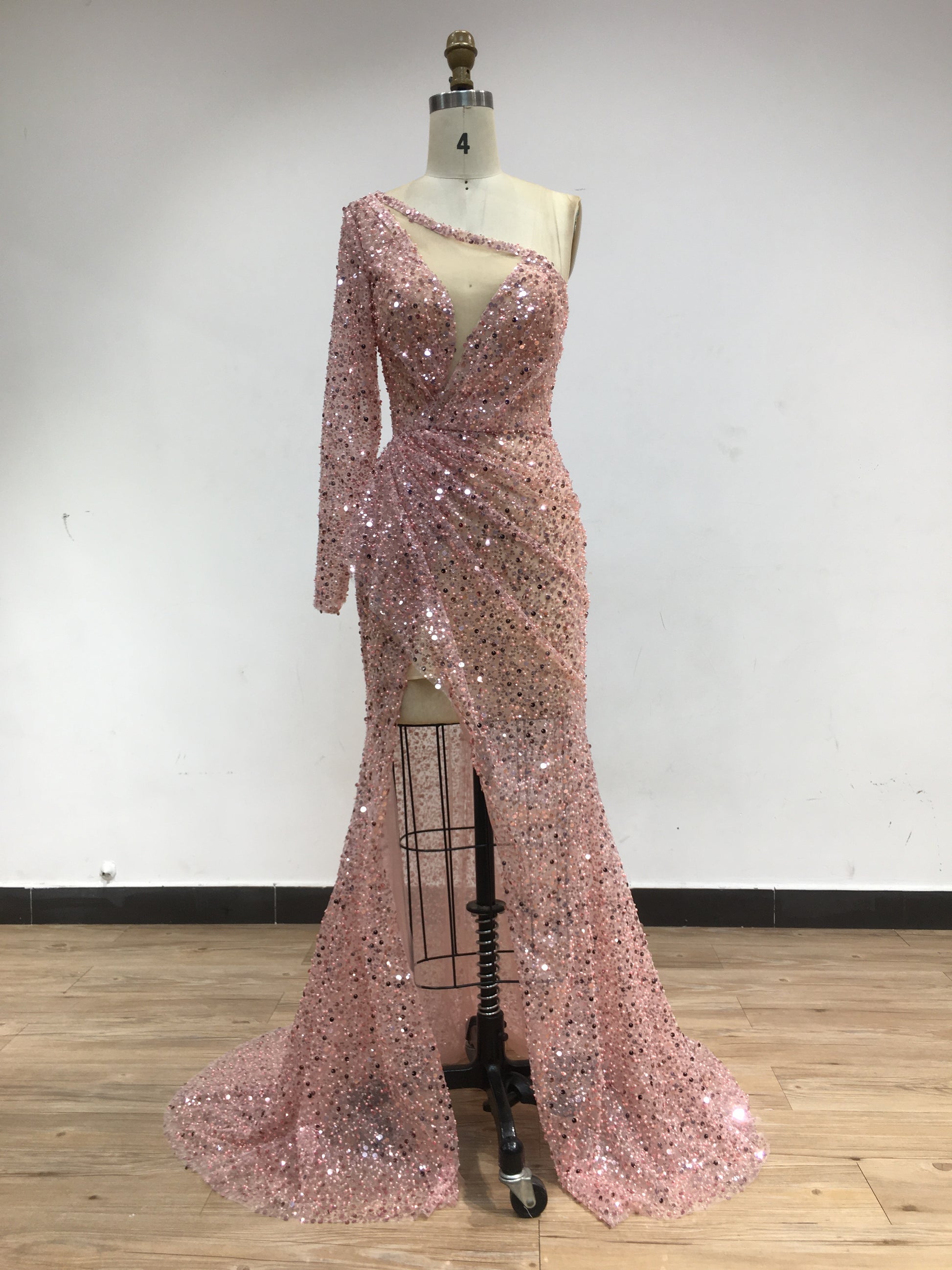 Beautiful One Shoulder Sheer High Split Long Sleeve Party Dress DDS031D
