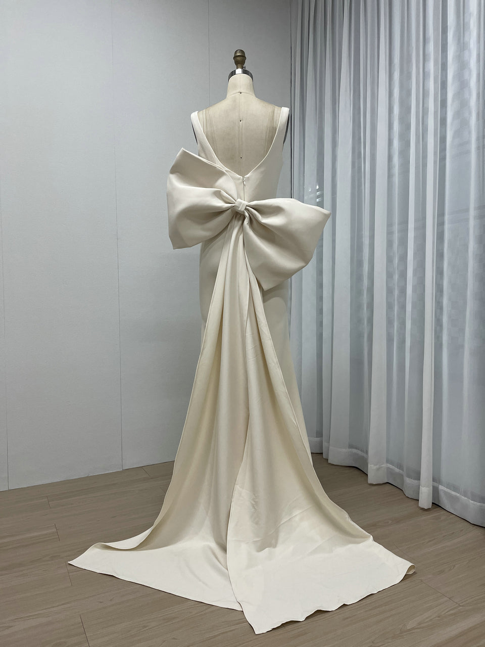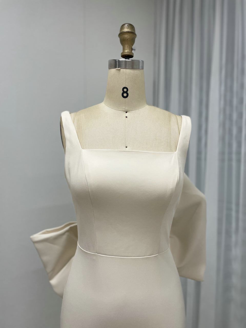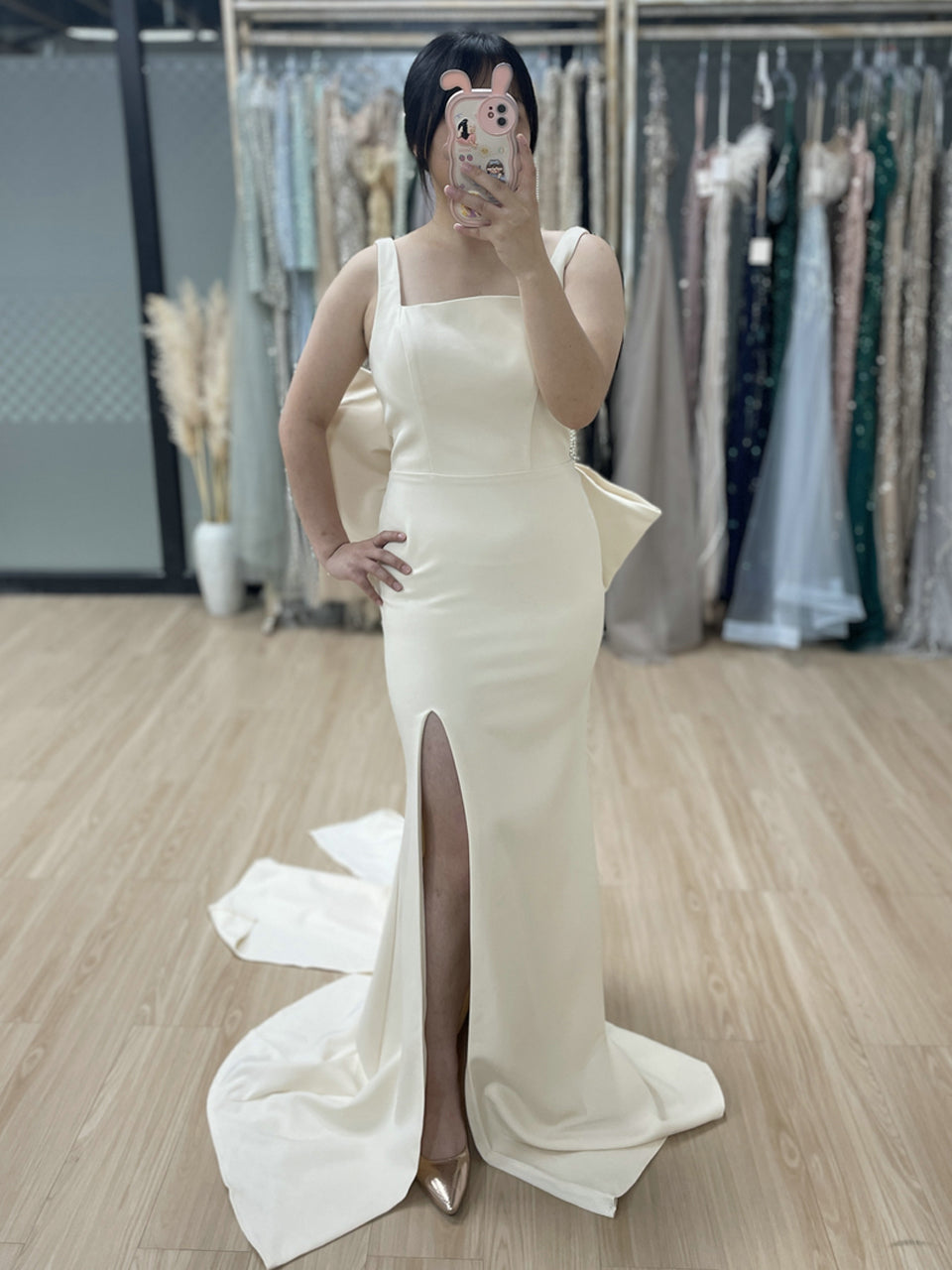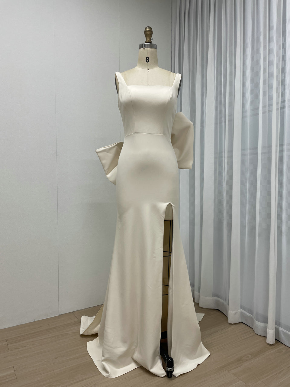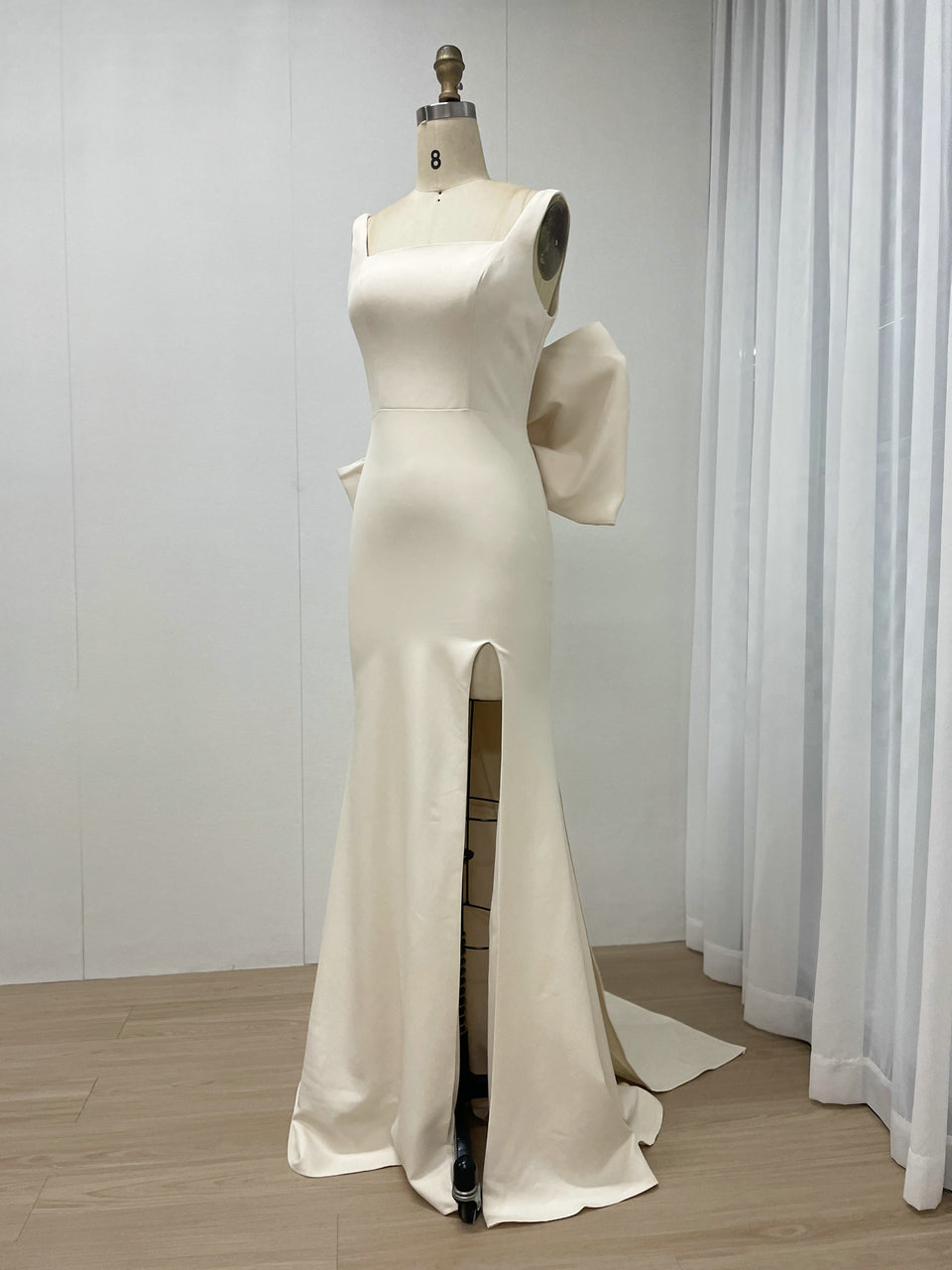 Beige Satin Mermaid Evening Dress Square Neck Bow Accent Slit Gown MY30132