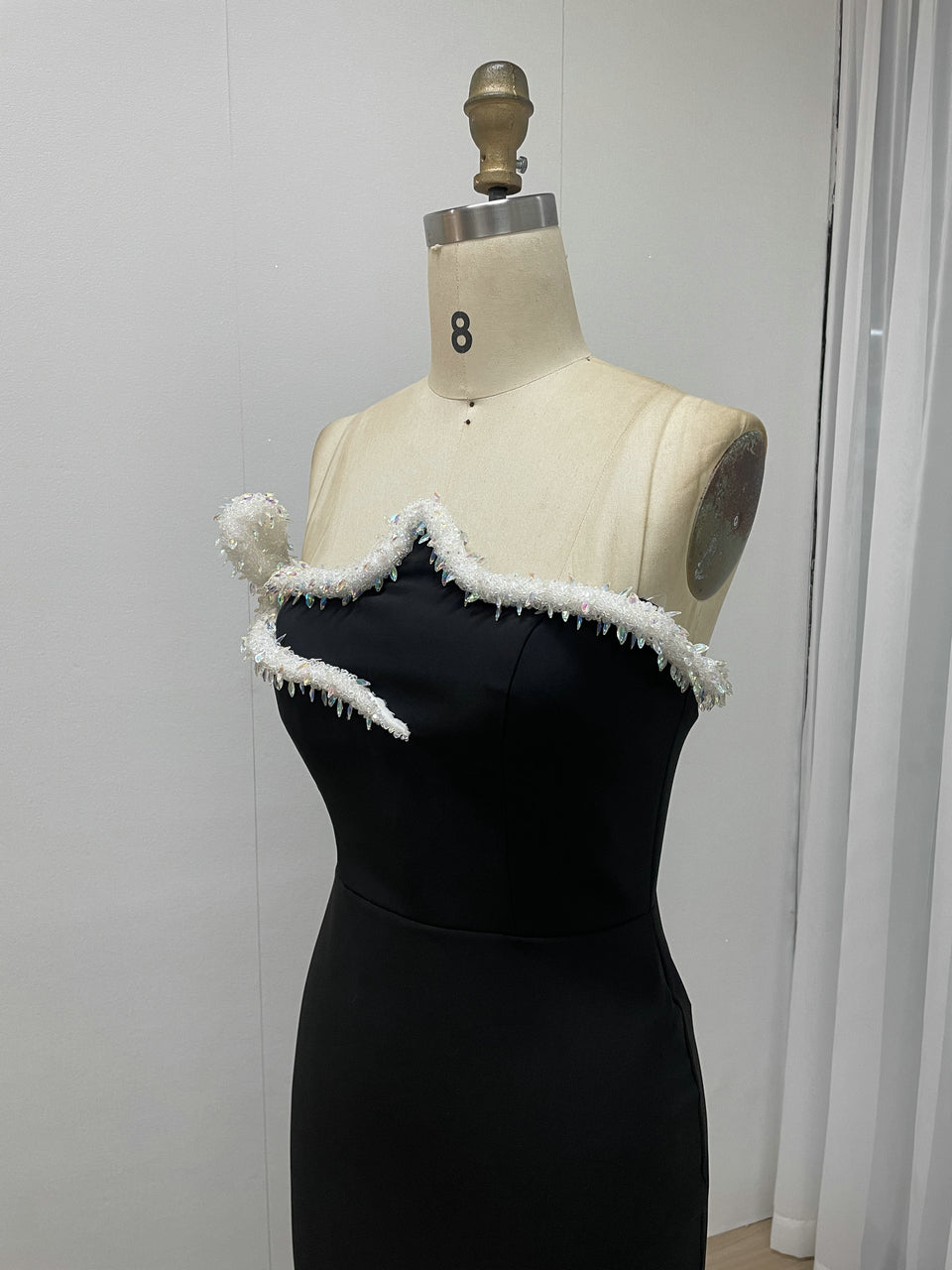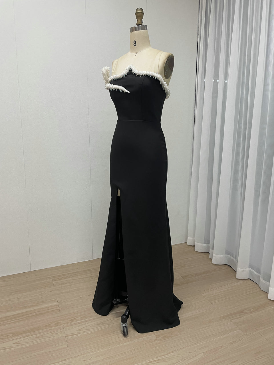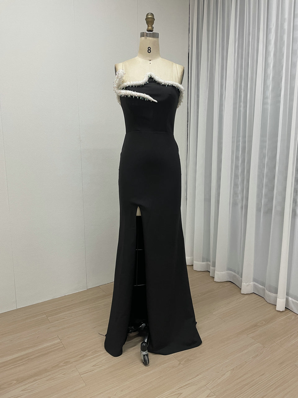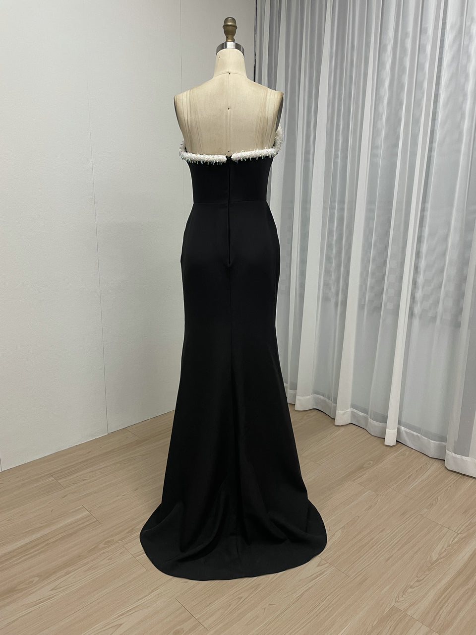 Black Feather Strapless Evening Dress Mermaid High Slit Formal Gown MY30129