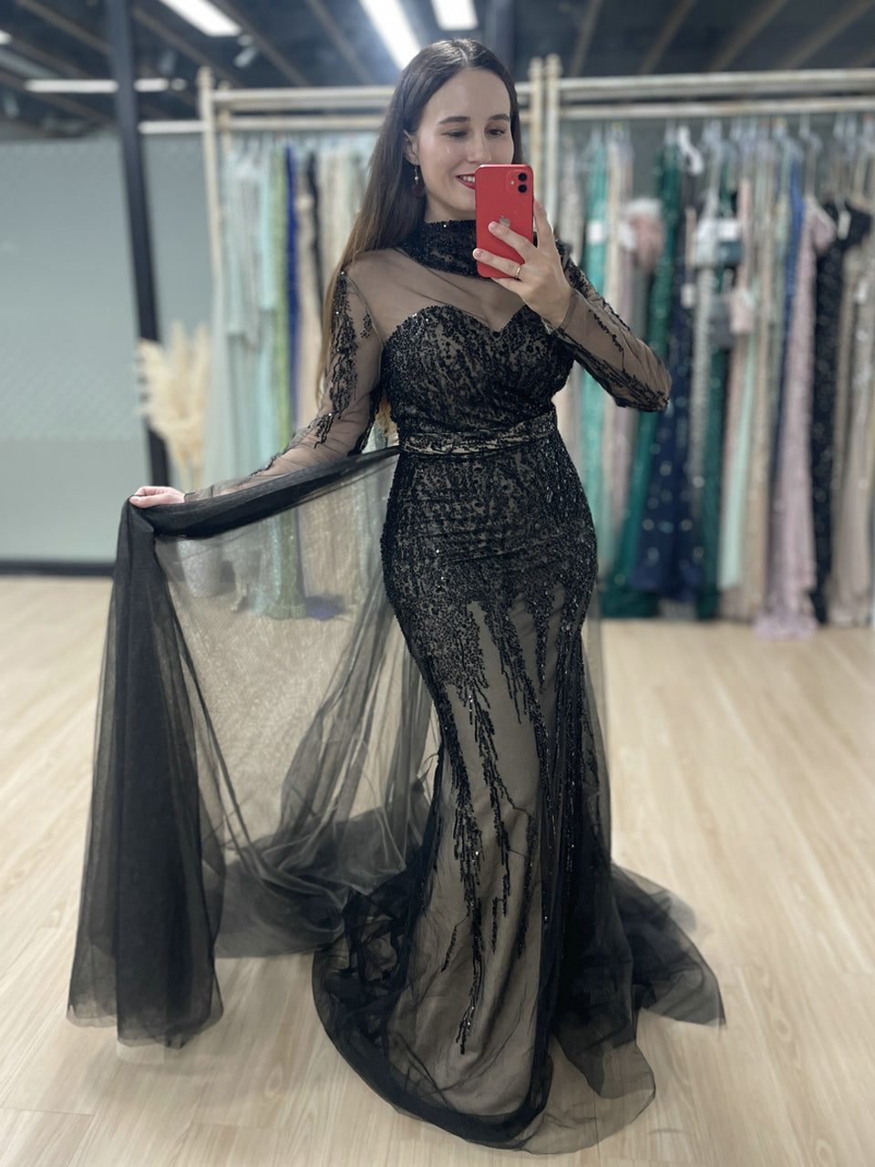 Black Long Sleeve Black Sheer Lace Illusion Belted Party Dress MY30008-2