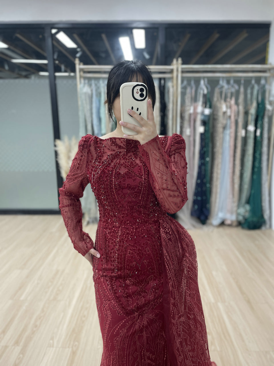 Boat Neck Long Sleeve Wedding Party Guest Couture Lace Evening Dress MB20008