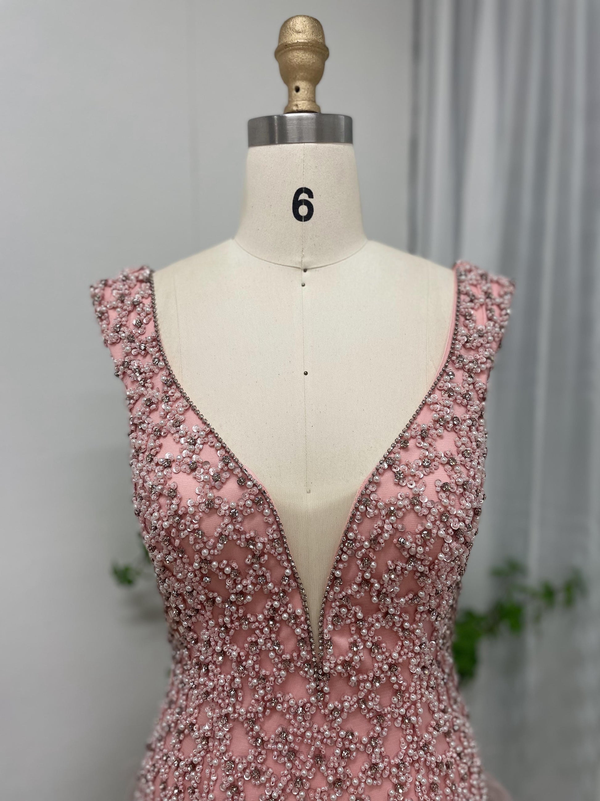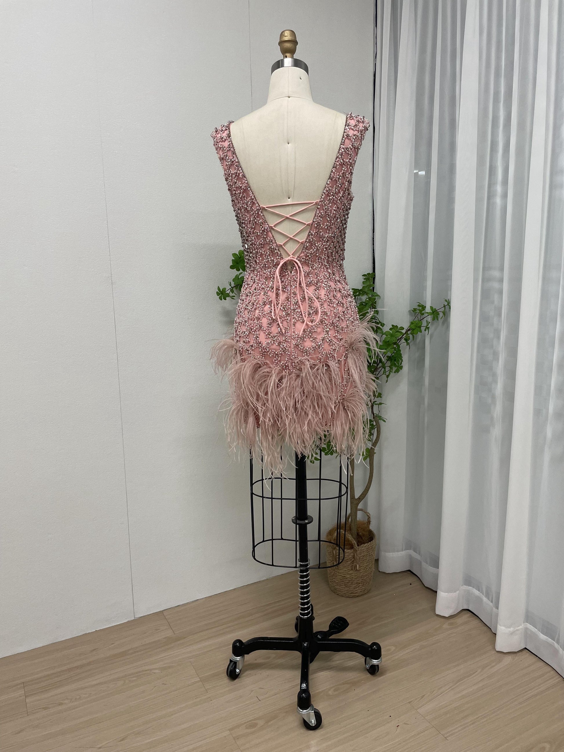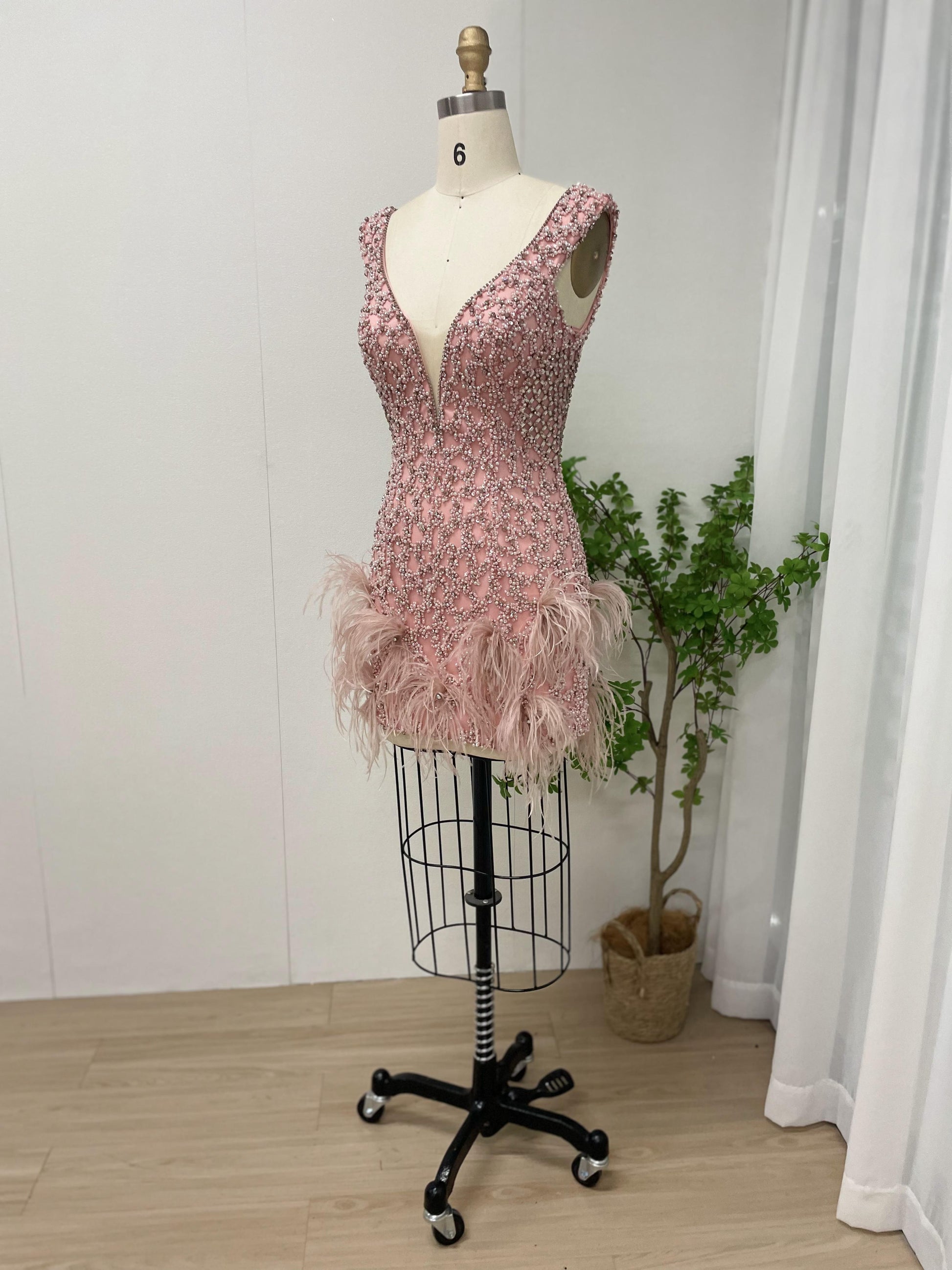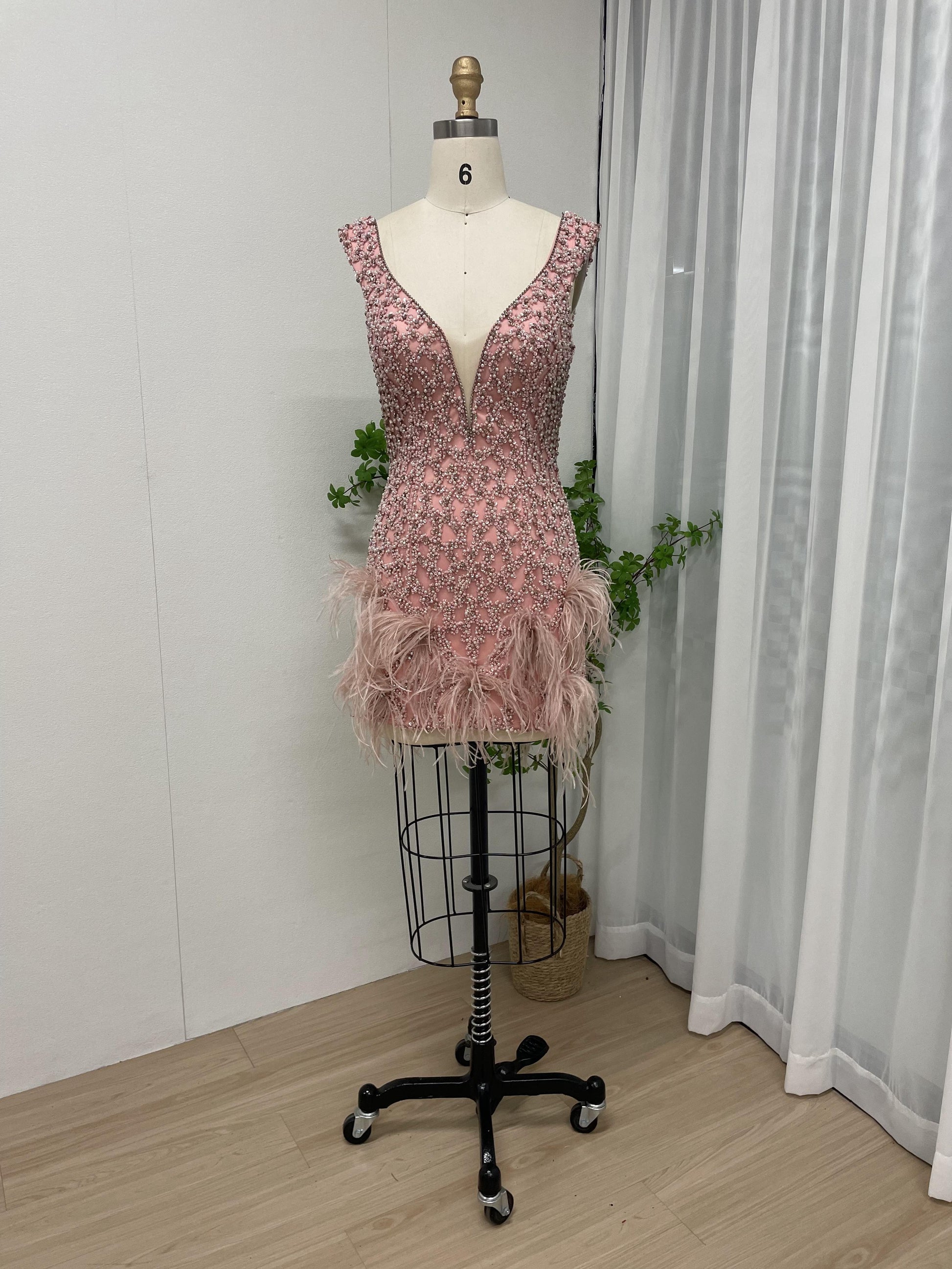 Cap Sleeve Plunging Neckline Handmade Beading Feather Skirt Short Party Dress MB40203