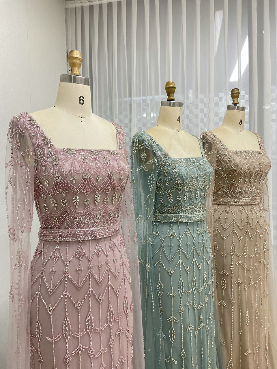 Elevate your next gala or formal event in the MC20100 Caramel Evening Gown. This masterpiece features a flattering mermaid silhouette meticulously adorned with intricate geometric beadwork and shimmering sequins. The elegant square neckline is complemented by dramatic, floor-length sheer cape sleeves that add a sense of ethereal movement. Crafted in a rich caramel tulle, this gown offers a perfect blend of modern sophistication and timeless glamour.