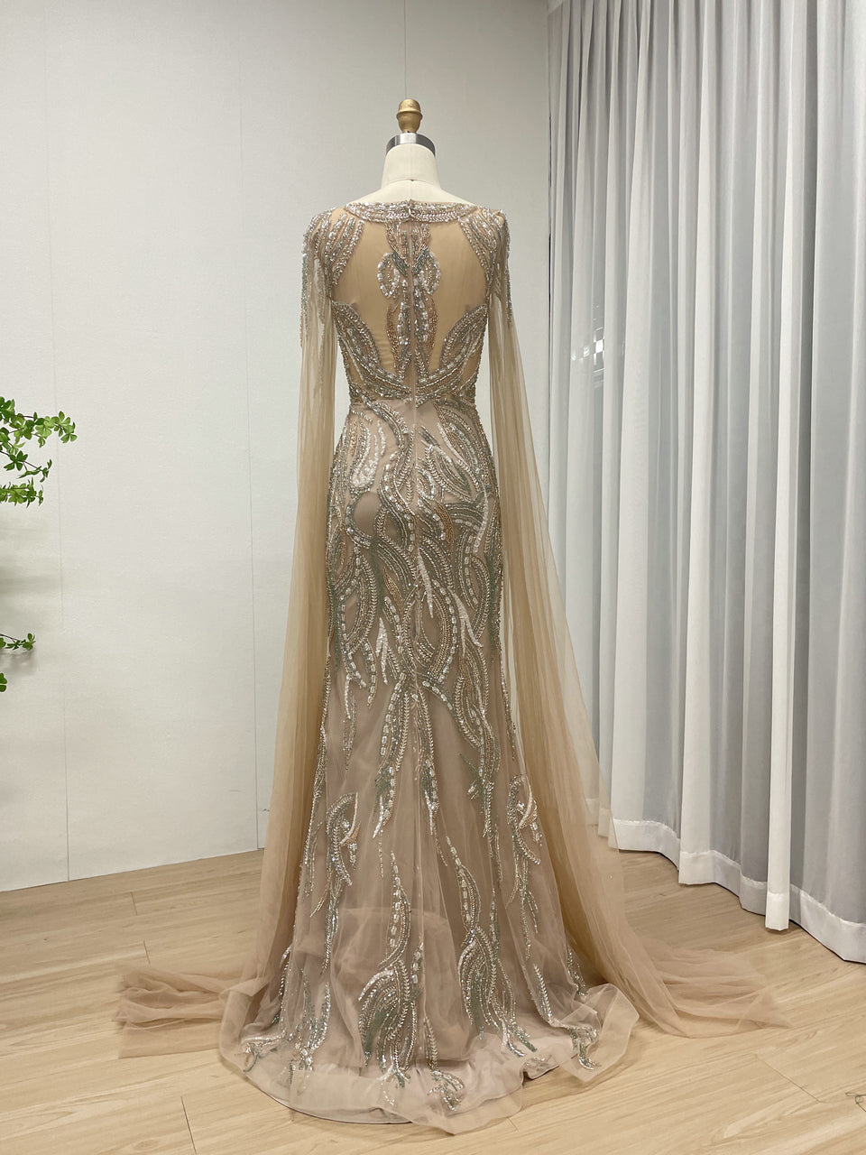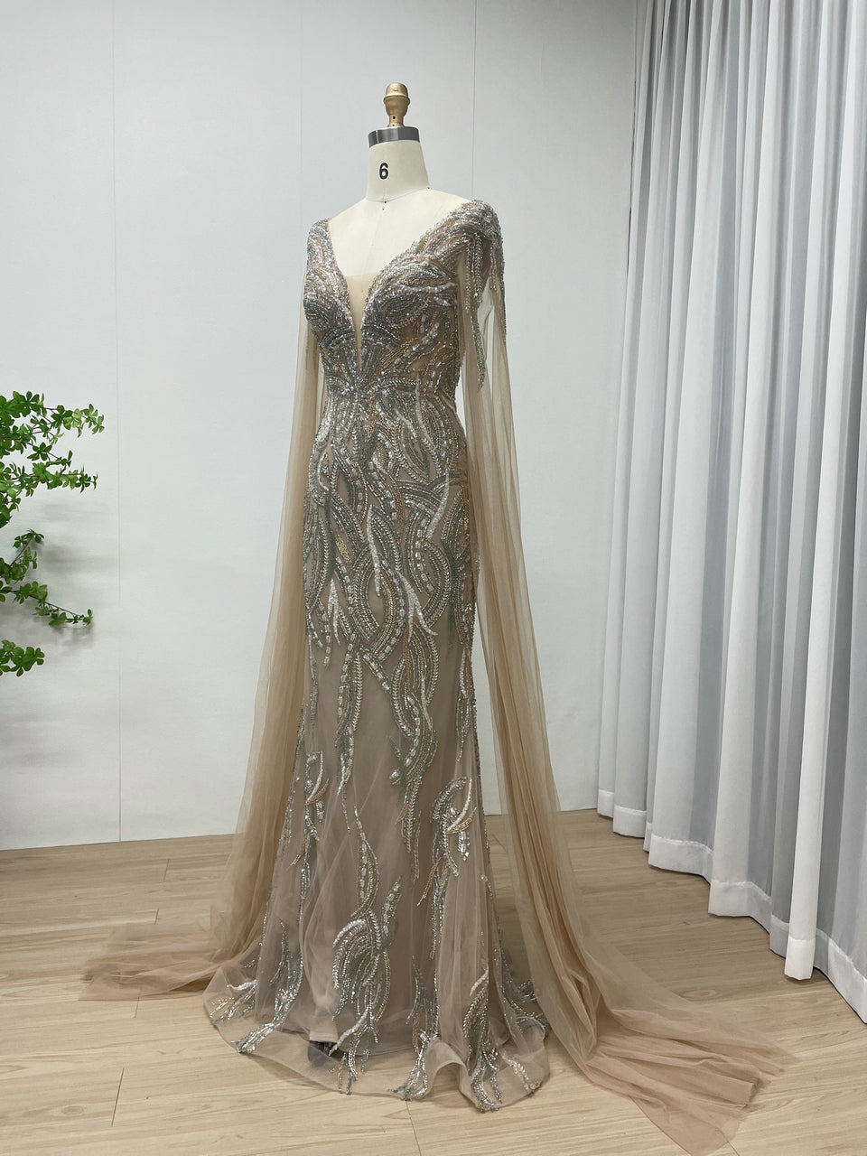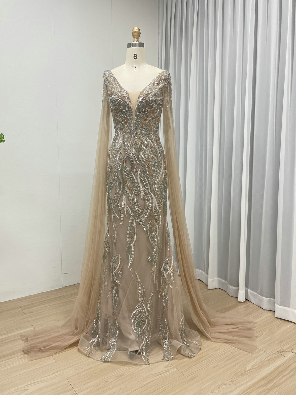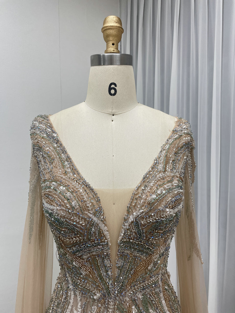 Champagne Elegant Luxury V Neck Mermaid Gown Exquisite Beaded Embroidery Long Sleeves Vintage Evening Dress MB40321