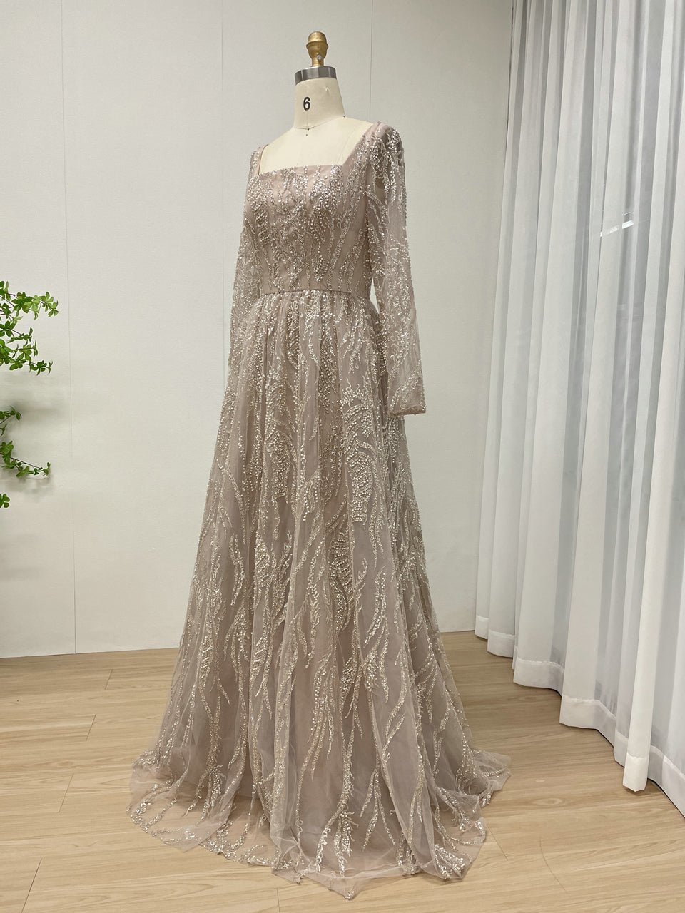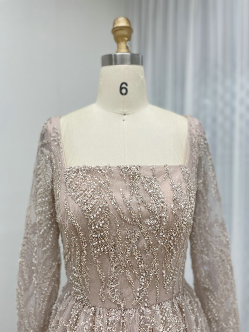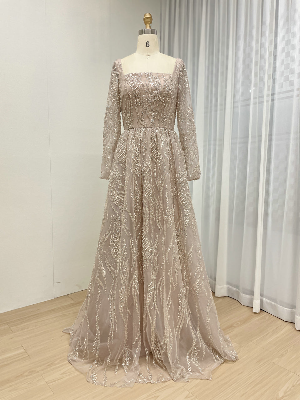 Pink Square Neck Long Sleeve Beaded A-Line Evening Gown Wedding Guest Dress MY30081L-3