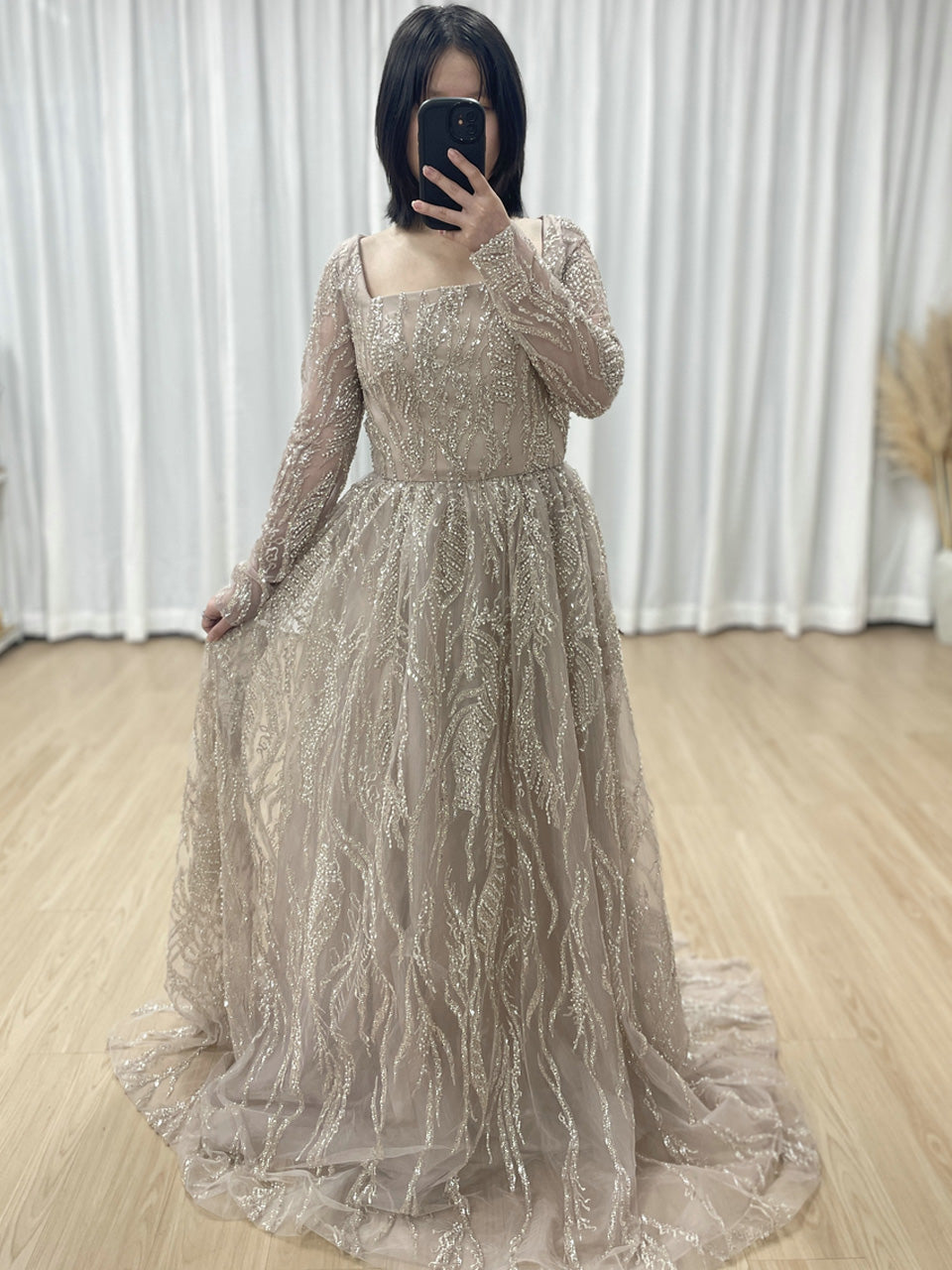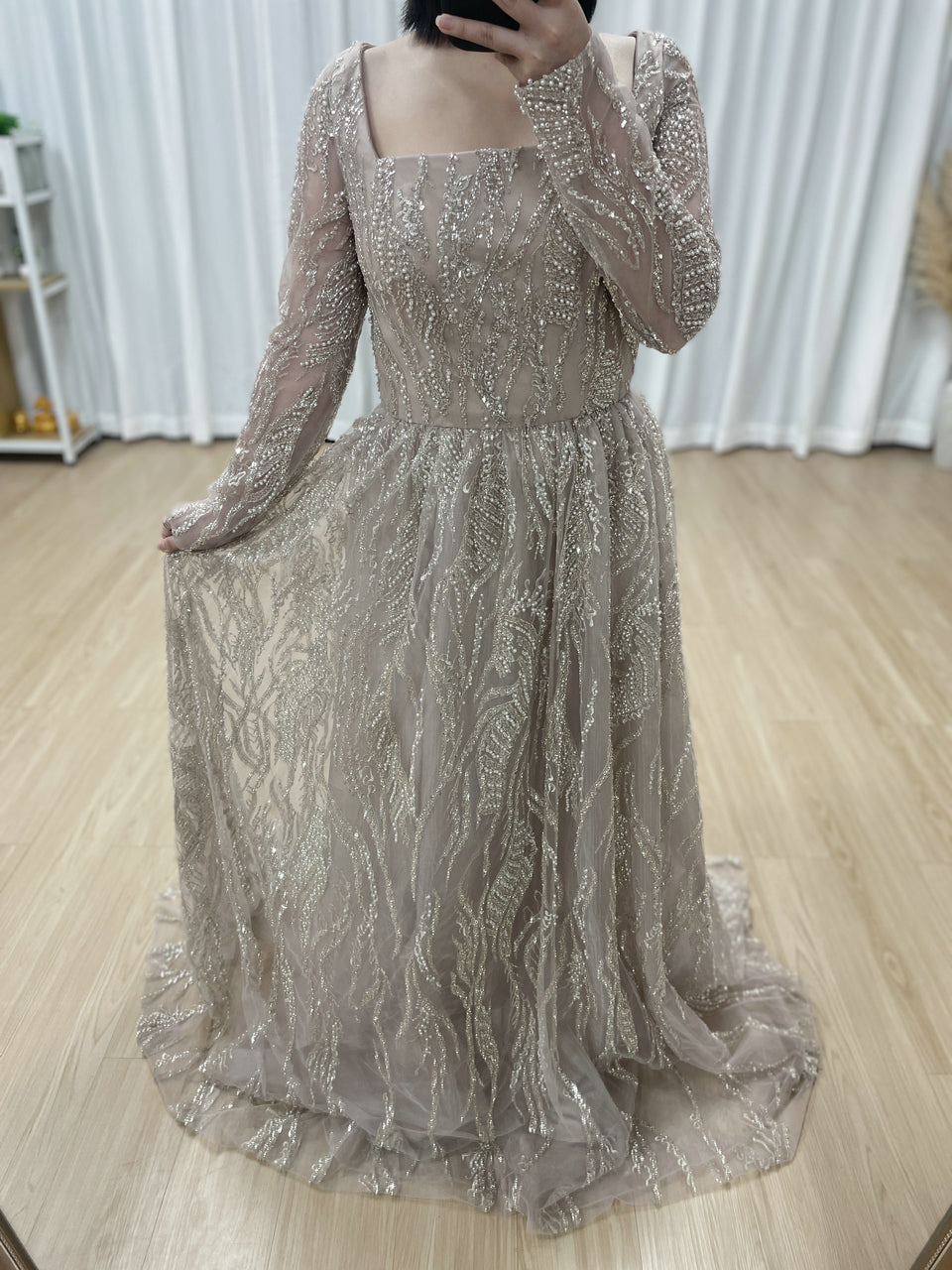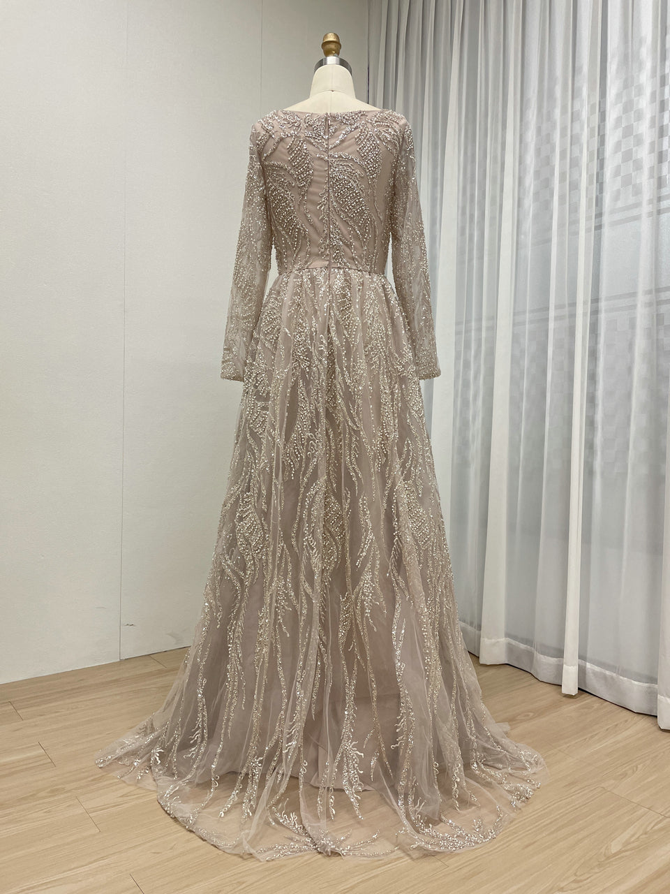Pink Square Neck Long Sleeve Beaded A-Line Evening Gown Wedding Guest Dress MY30081L-3