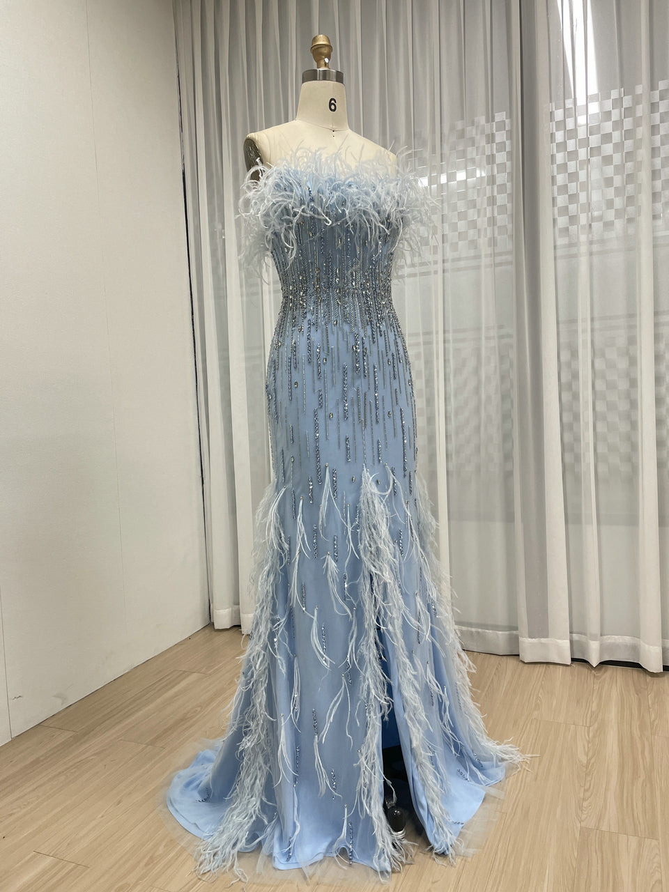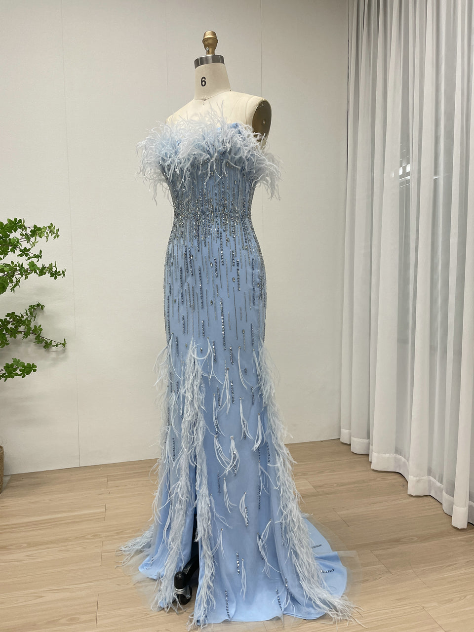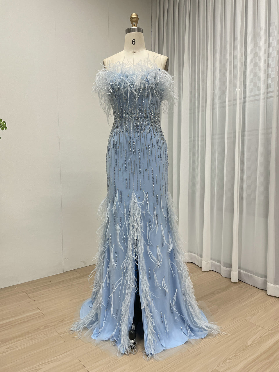 Classy Feather Neckline High Slit Prom Evening Dress Embellished Luxury Handmade Beaded for Formal Occasion MB40403