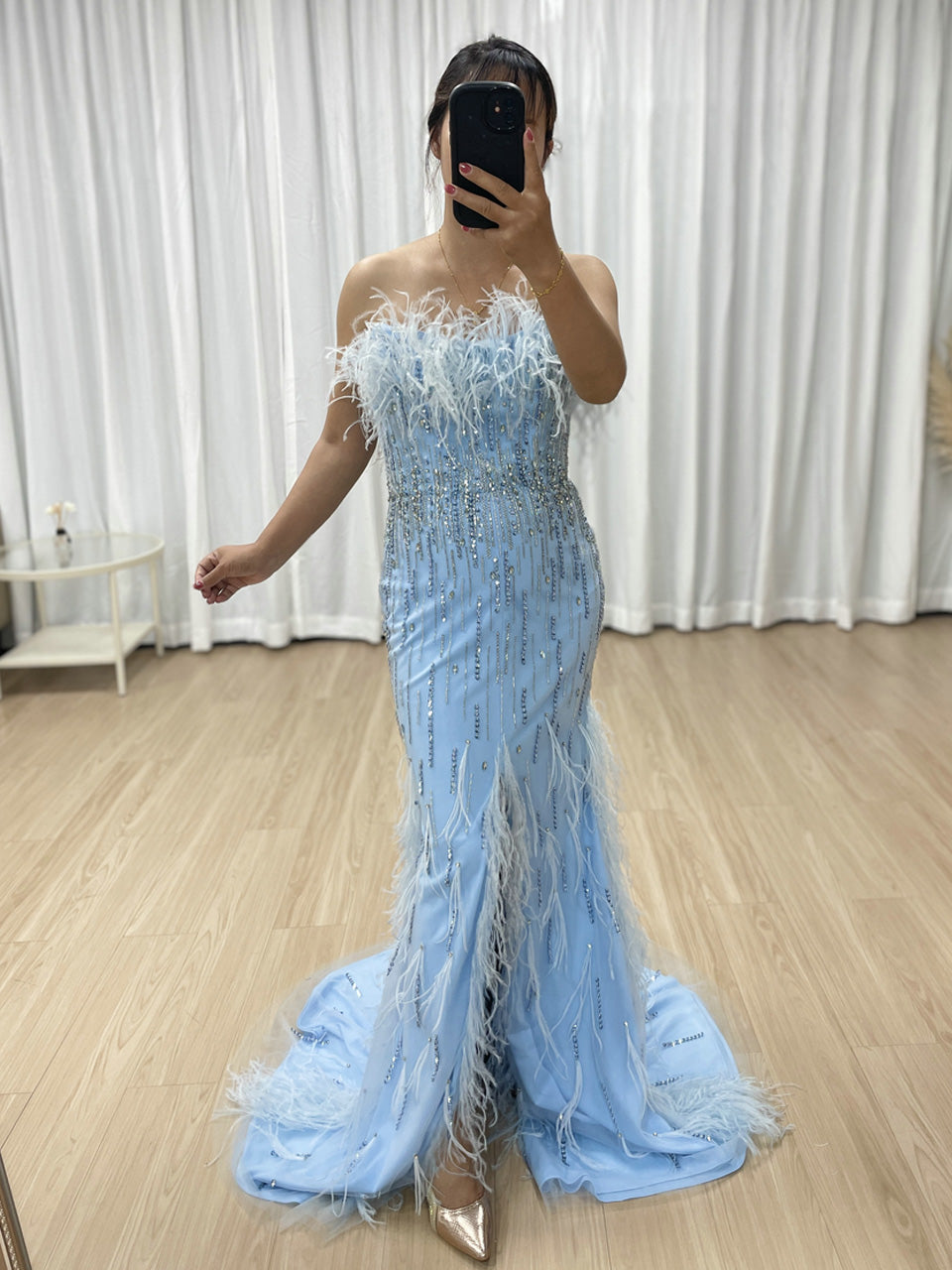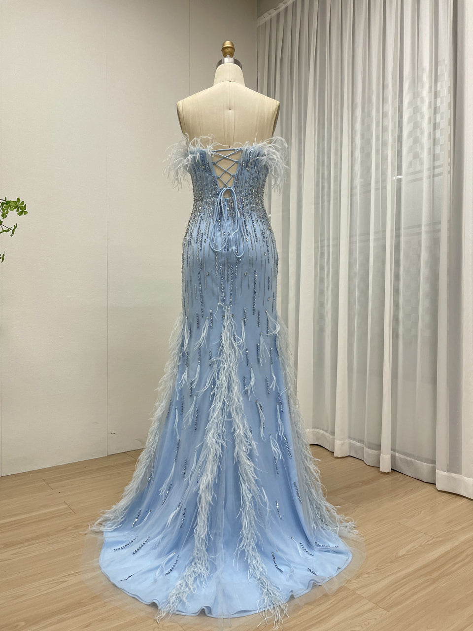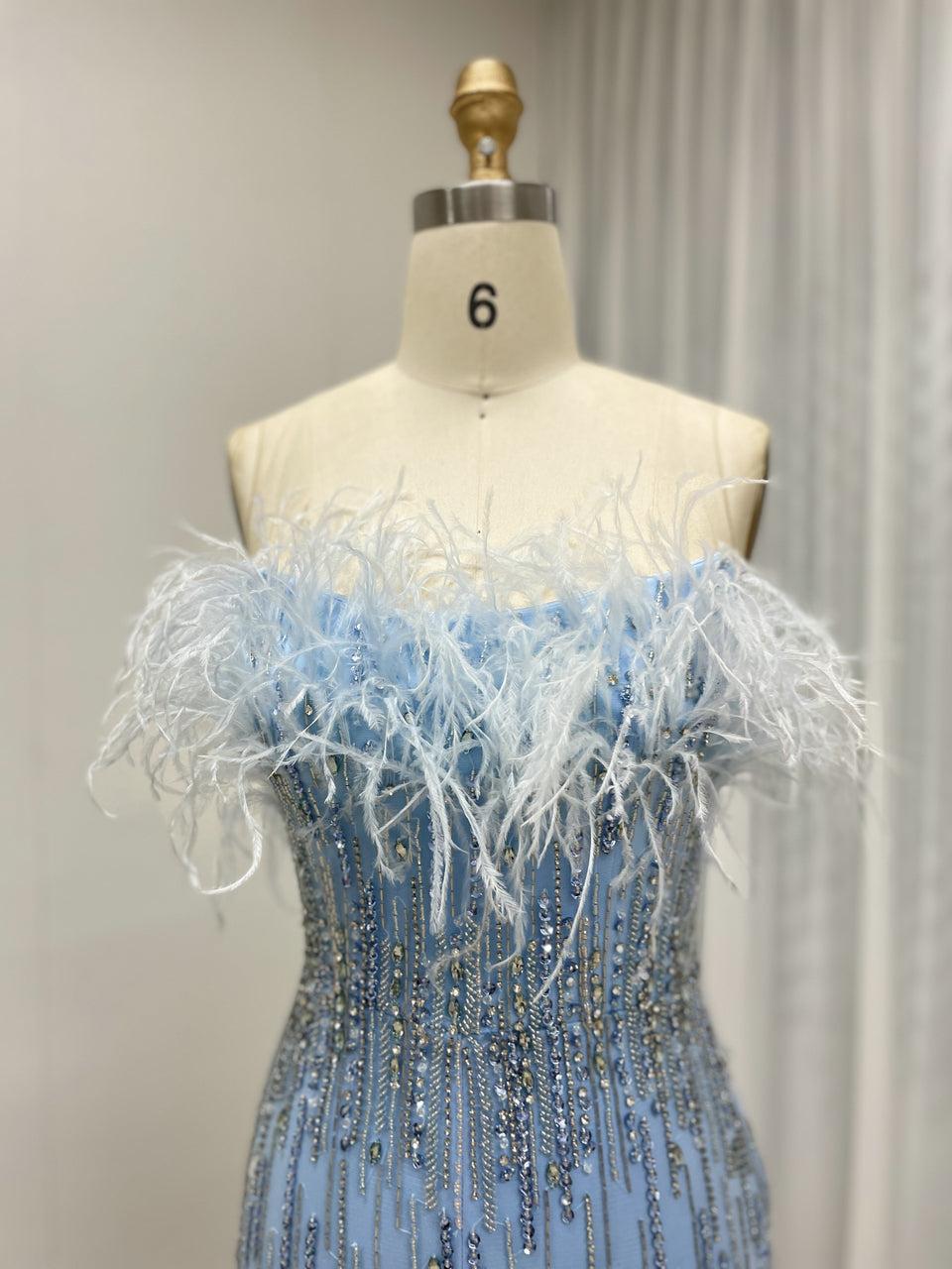 Classy Feather Neckline High Slit Prom Evening Dress Embellished Luxury Handmade Beaded for Formal Occasion MB40403