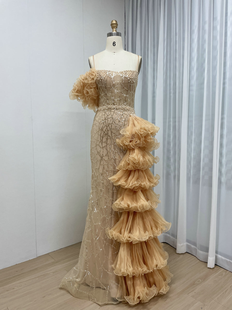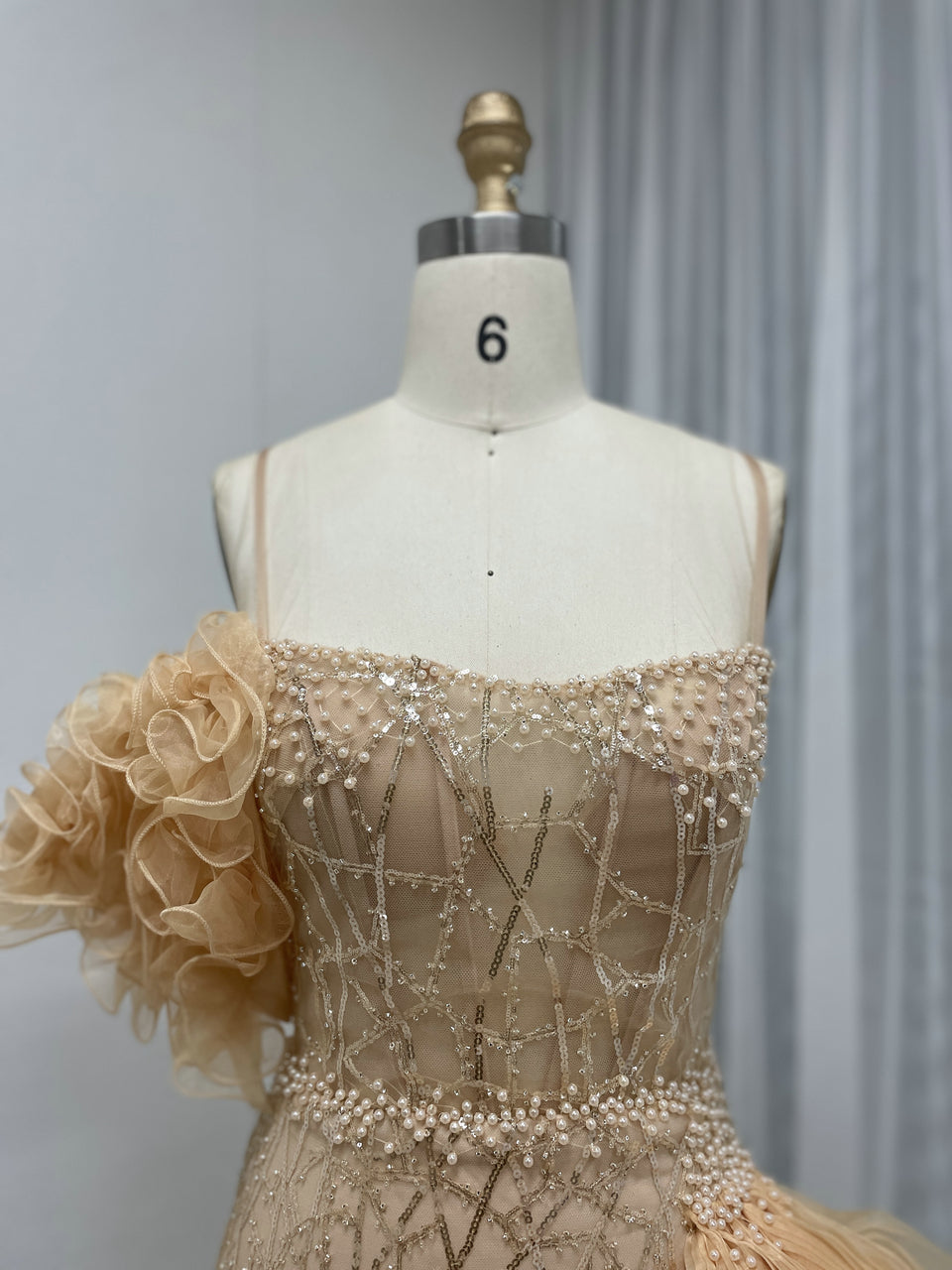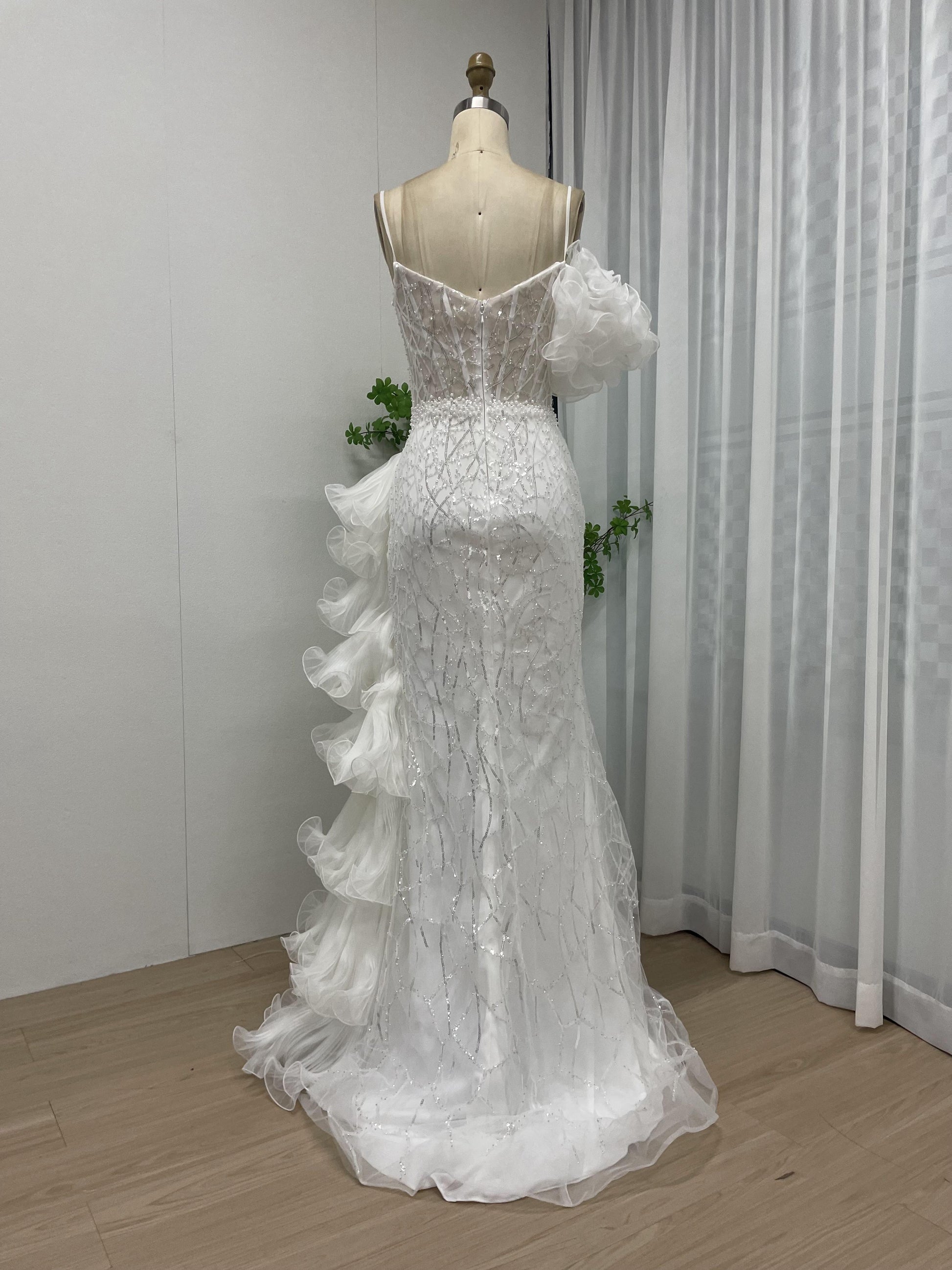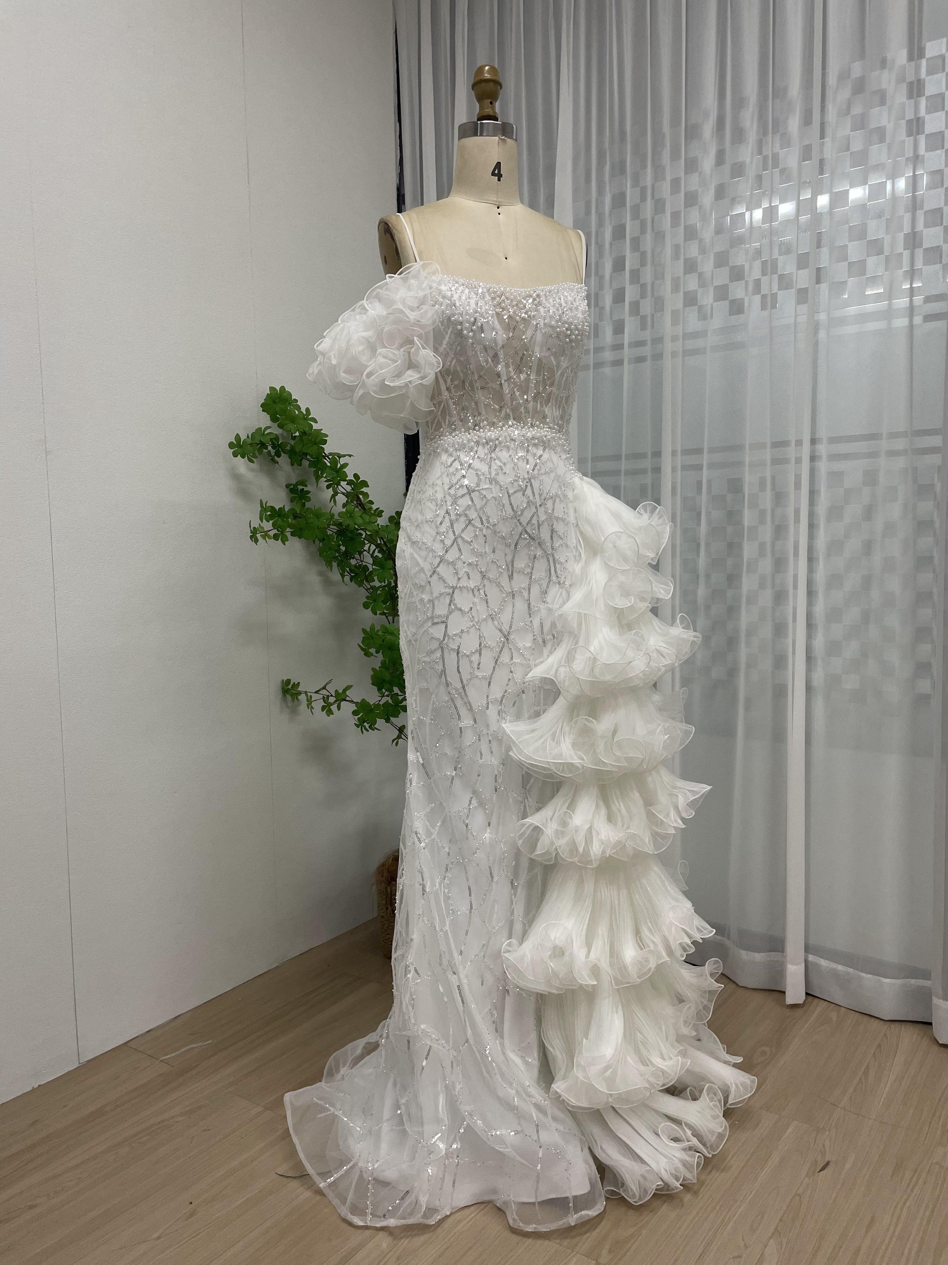 Dazzling Ruffle Off Shoulder Beading Lace Layered Side-Skirt White Princess Birthday Party Evening Dress MB40223