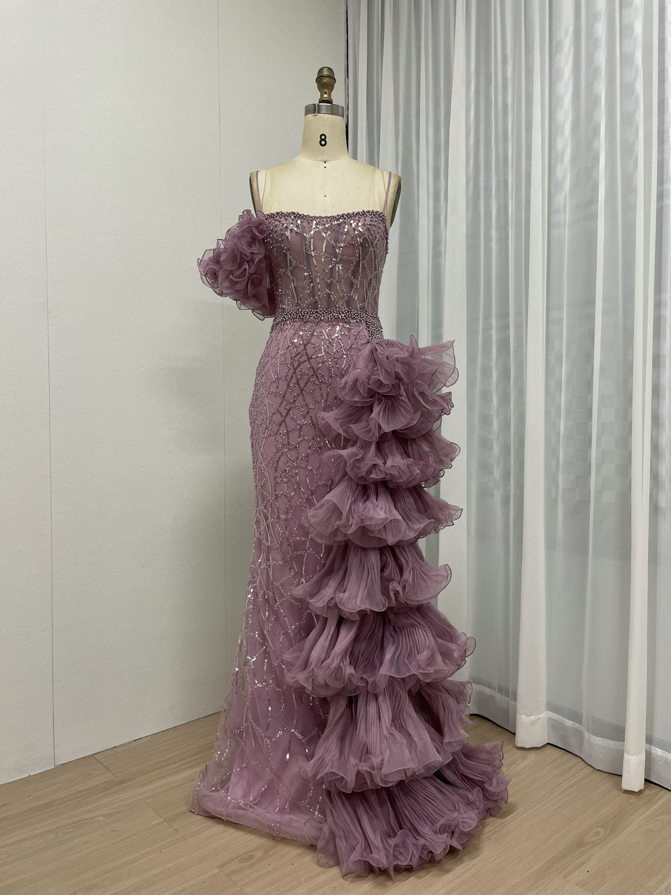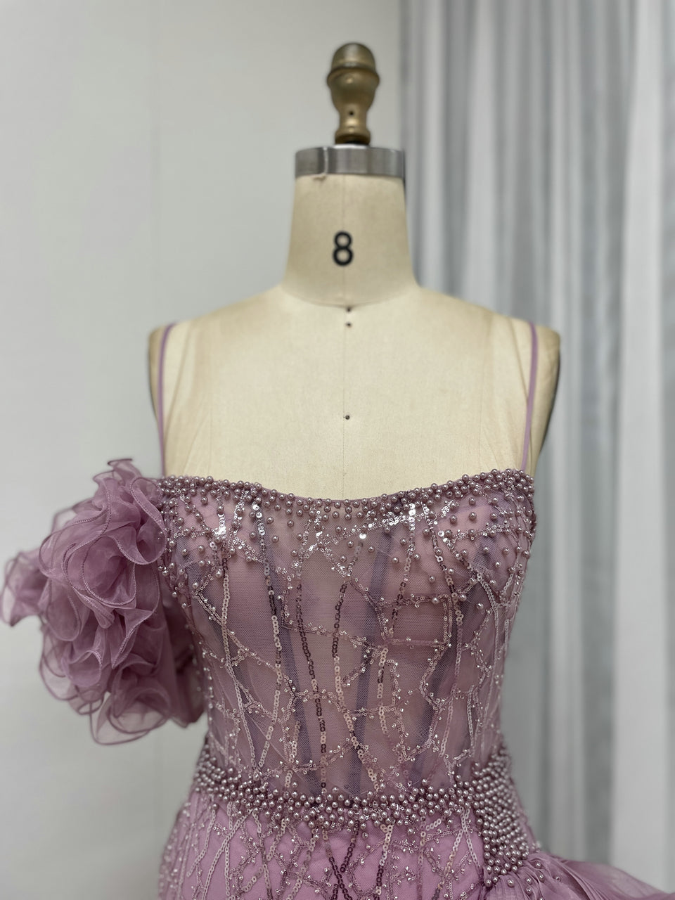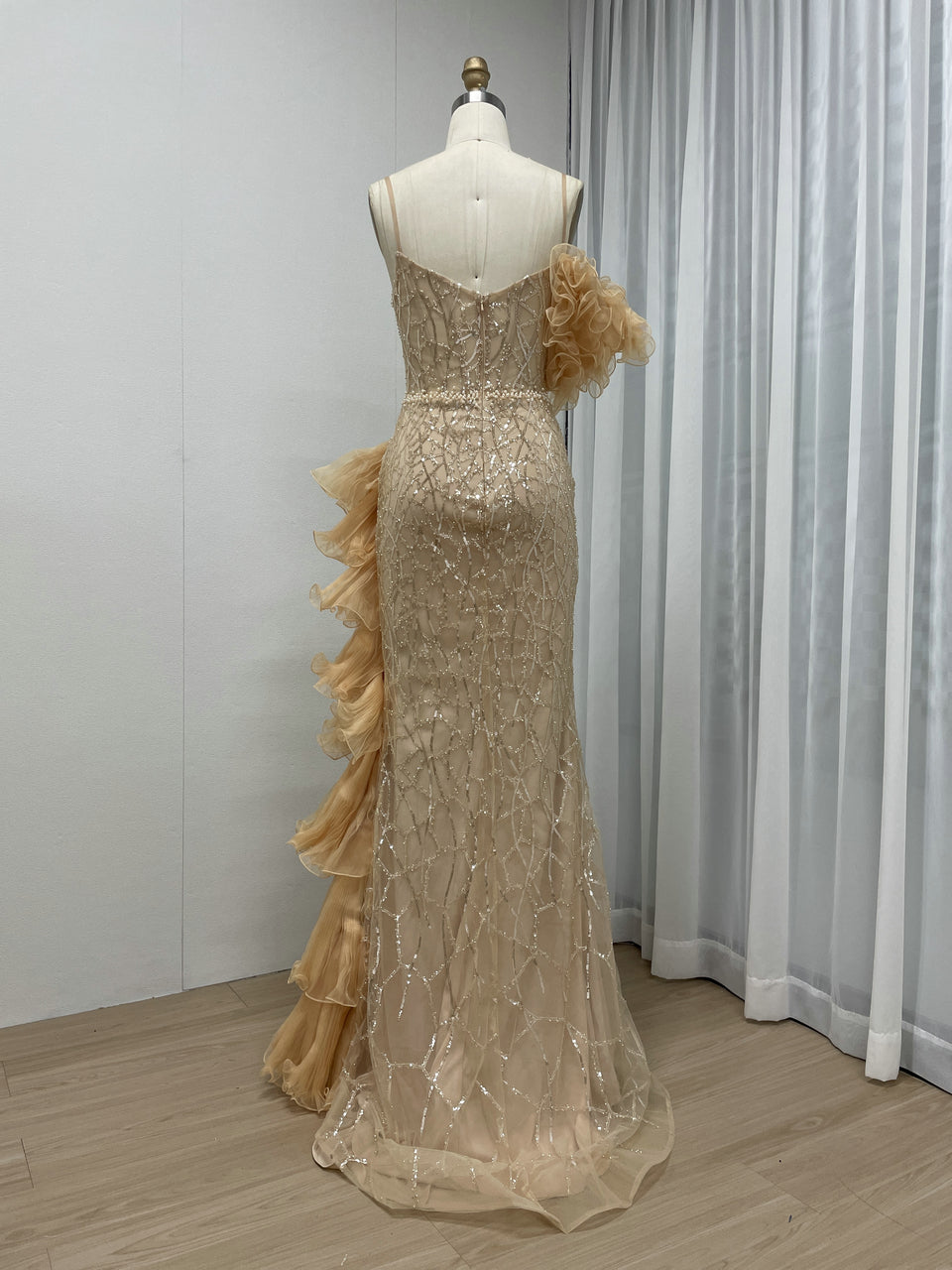 Dazzling Ruffle Off Shoulder Beading Lace Layered Side-Skirt White Princess Birthday Party Evening Dress MB40223