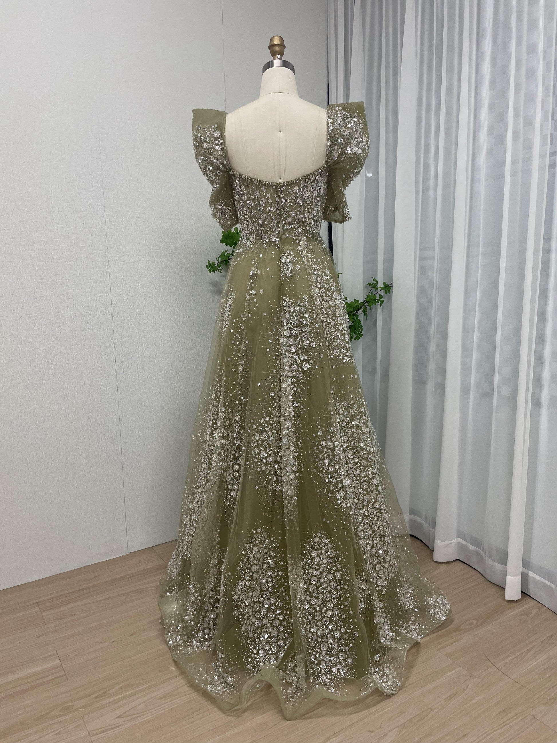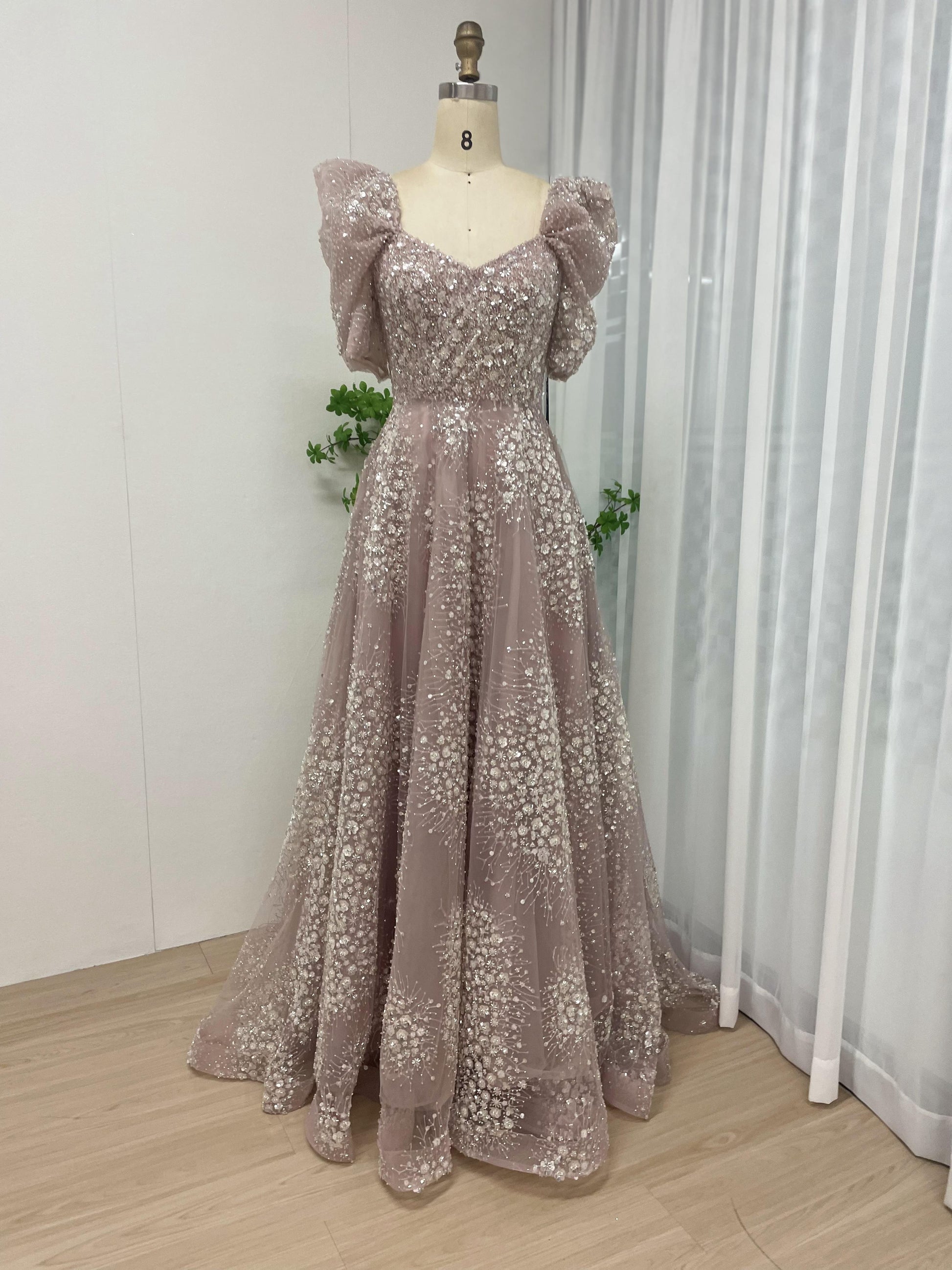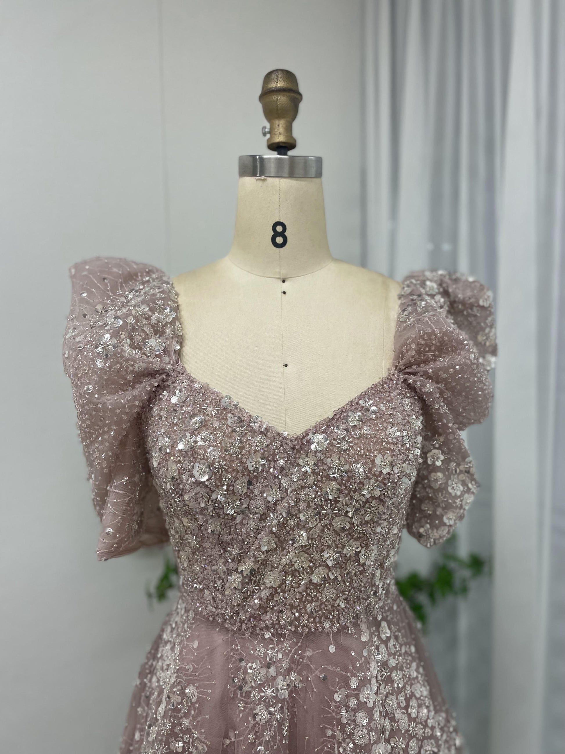 Dramatic Beading Lace A Line Puff Sleeve Evening Dress MB40184