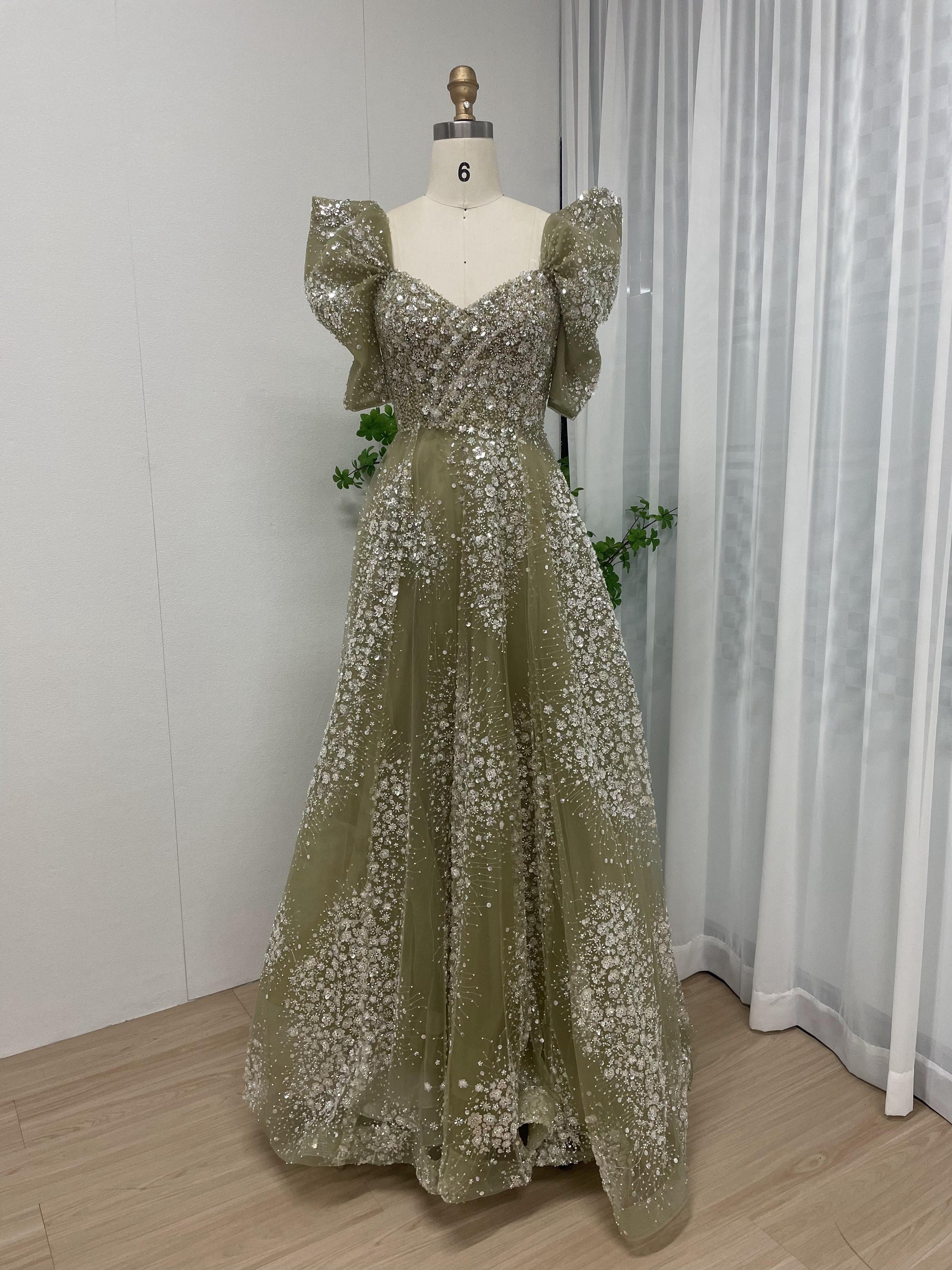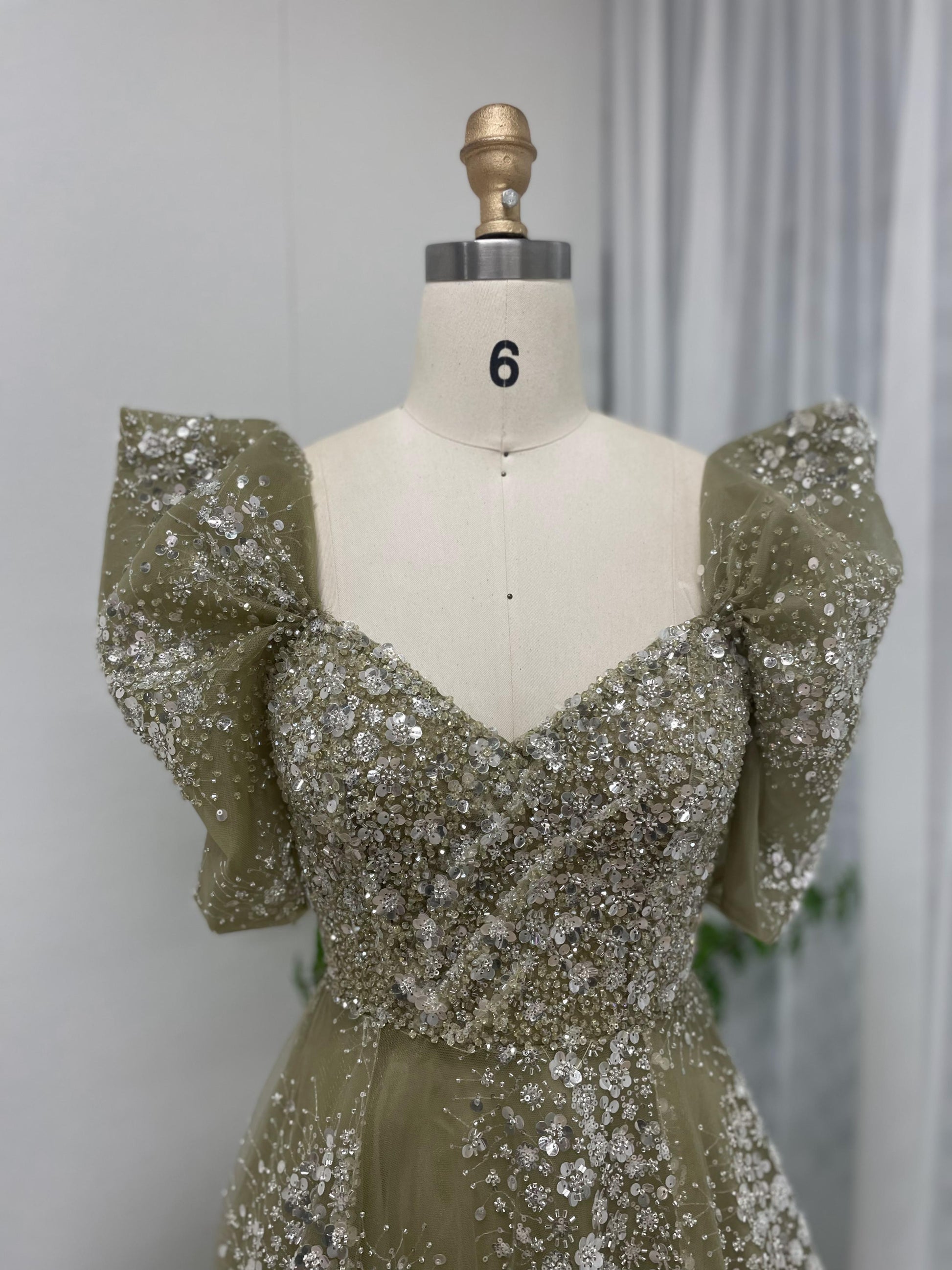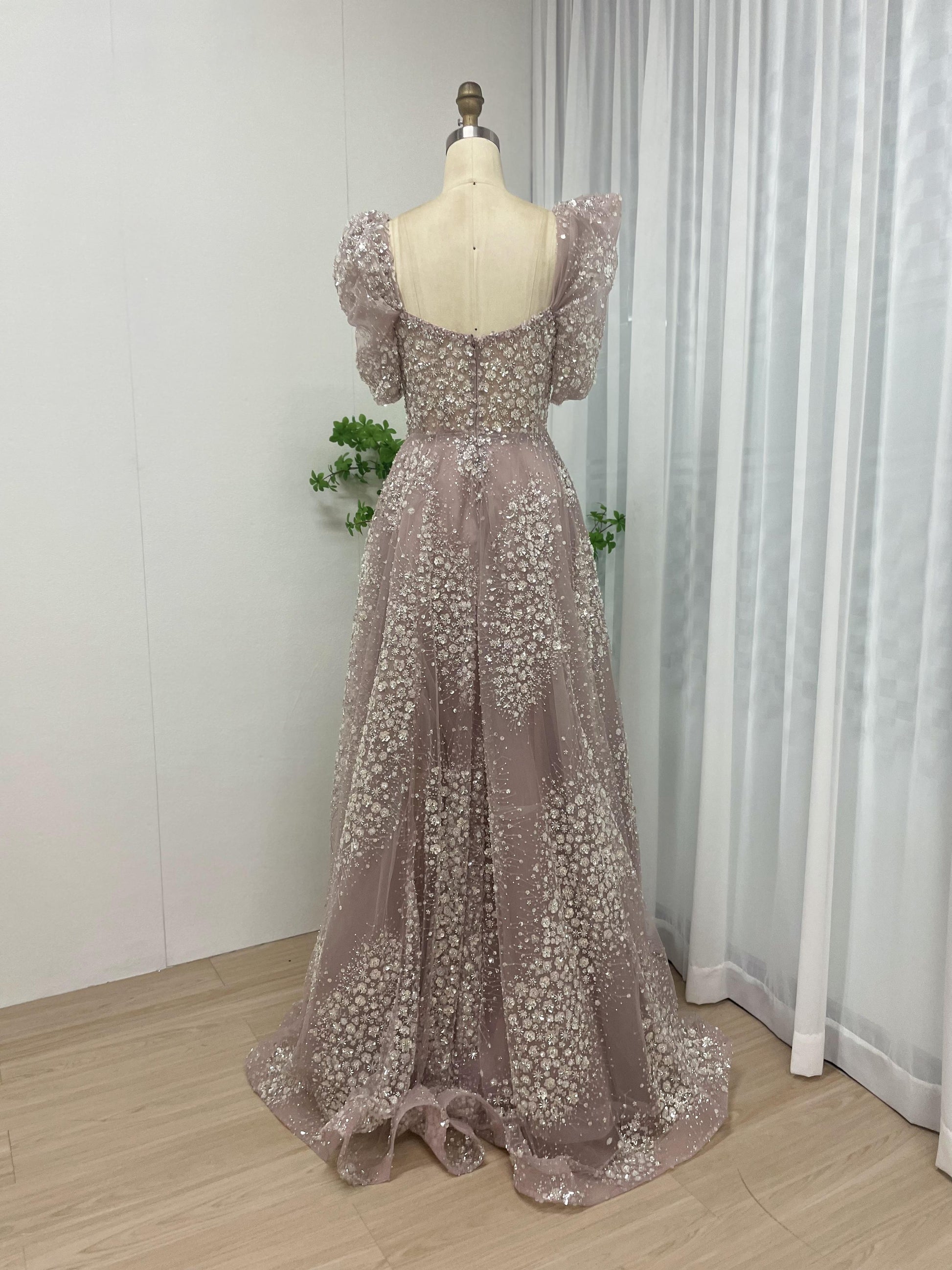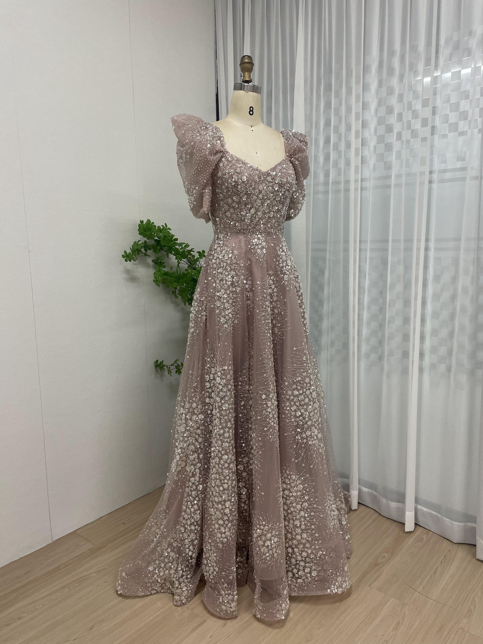 Dramatic Beading Lace A Line Puff Sleeve Evening Dress MB40184