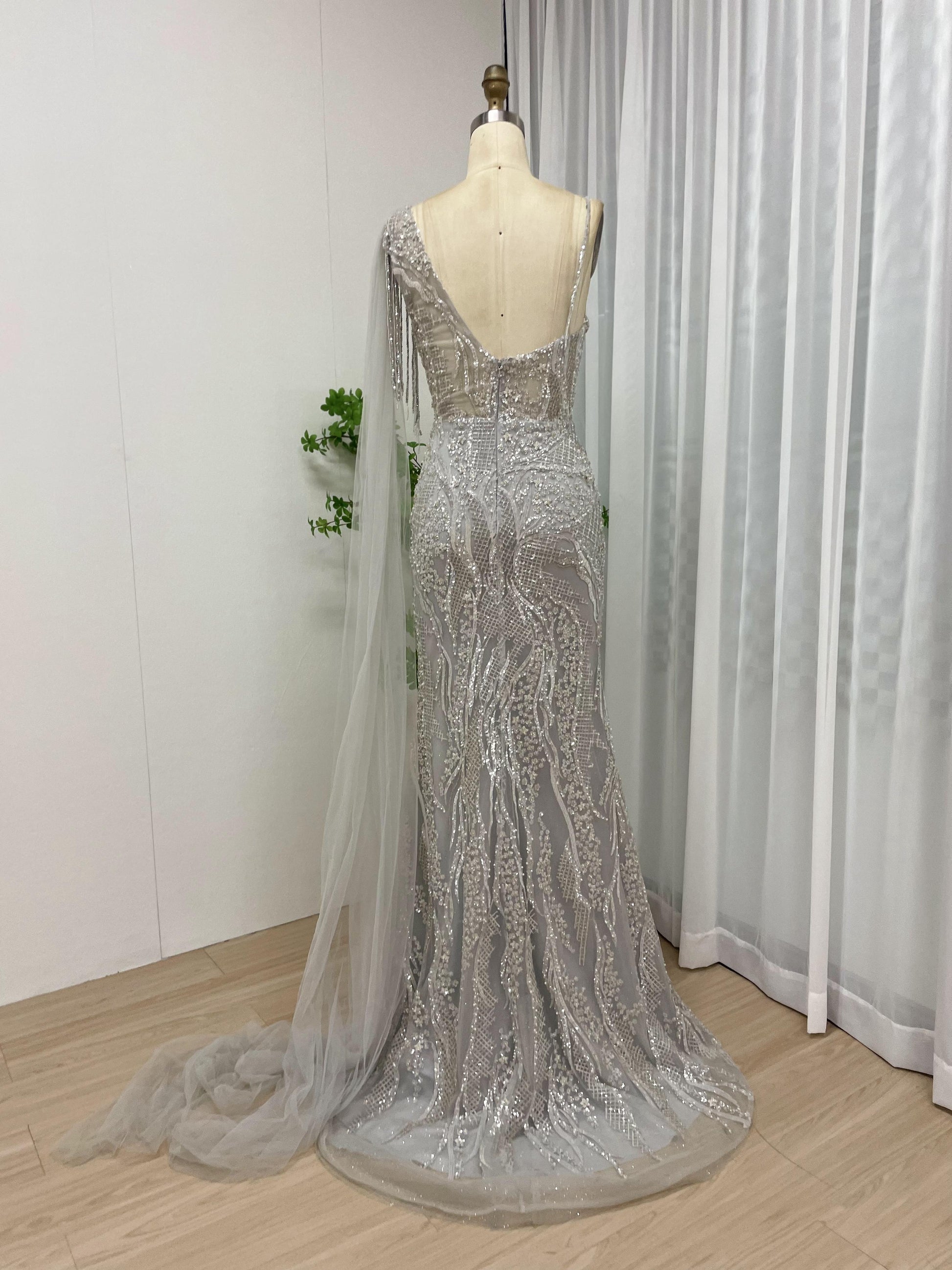 Dramatic One Shoulder Beading Lace Mermaid Cape Long Sleeve Red Carpet Formal Evening Dress MB40212