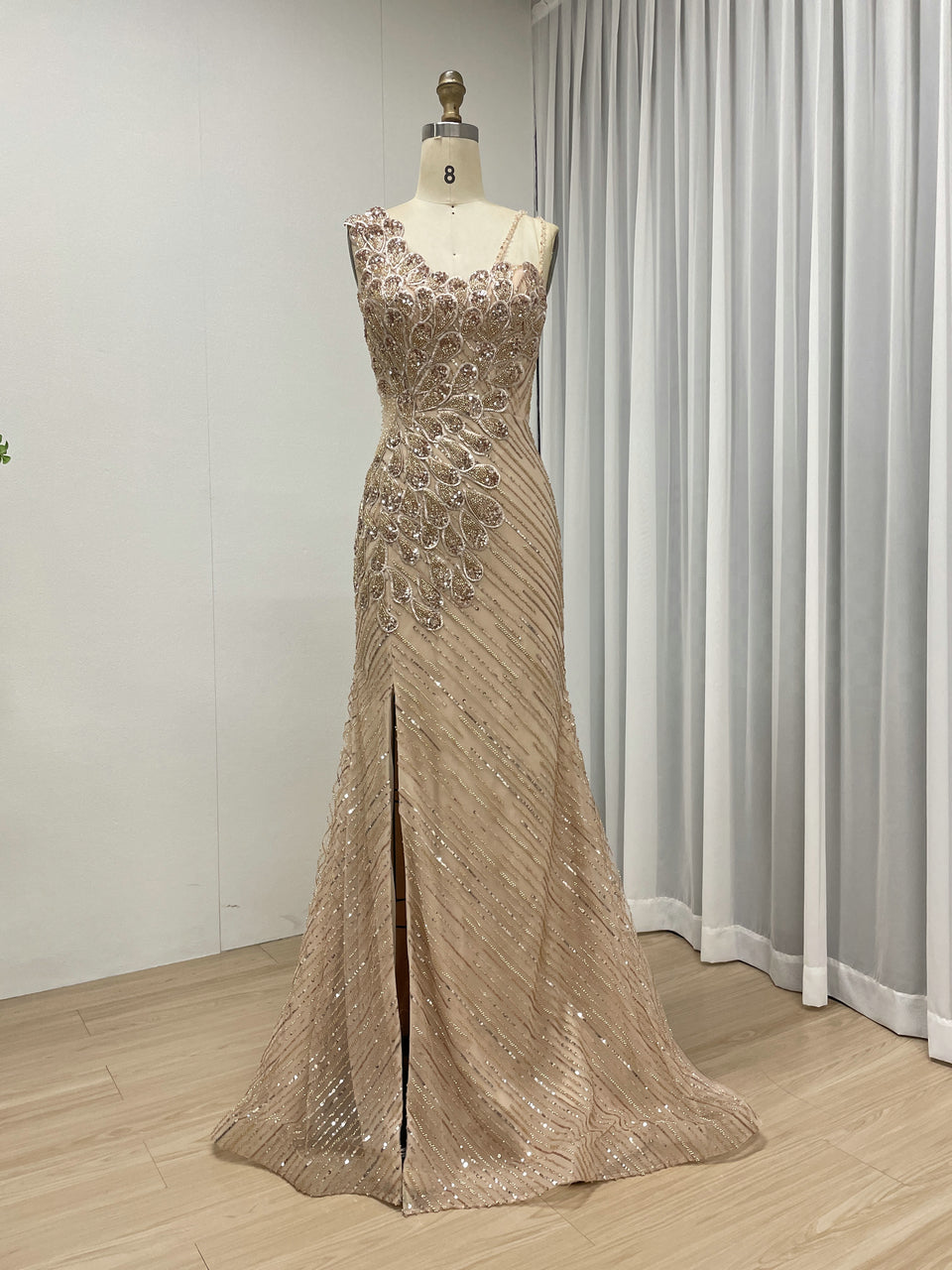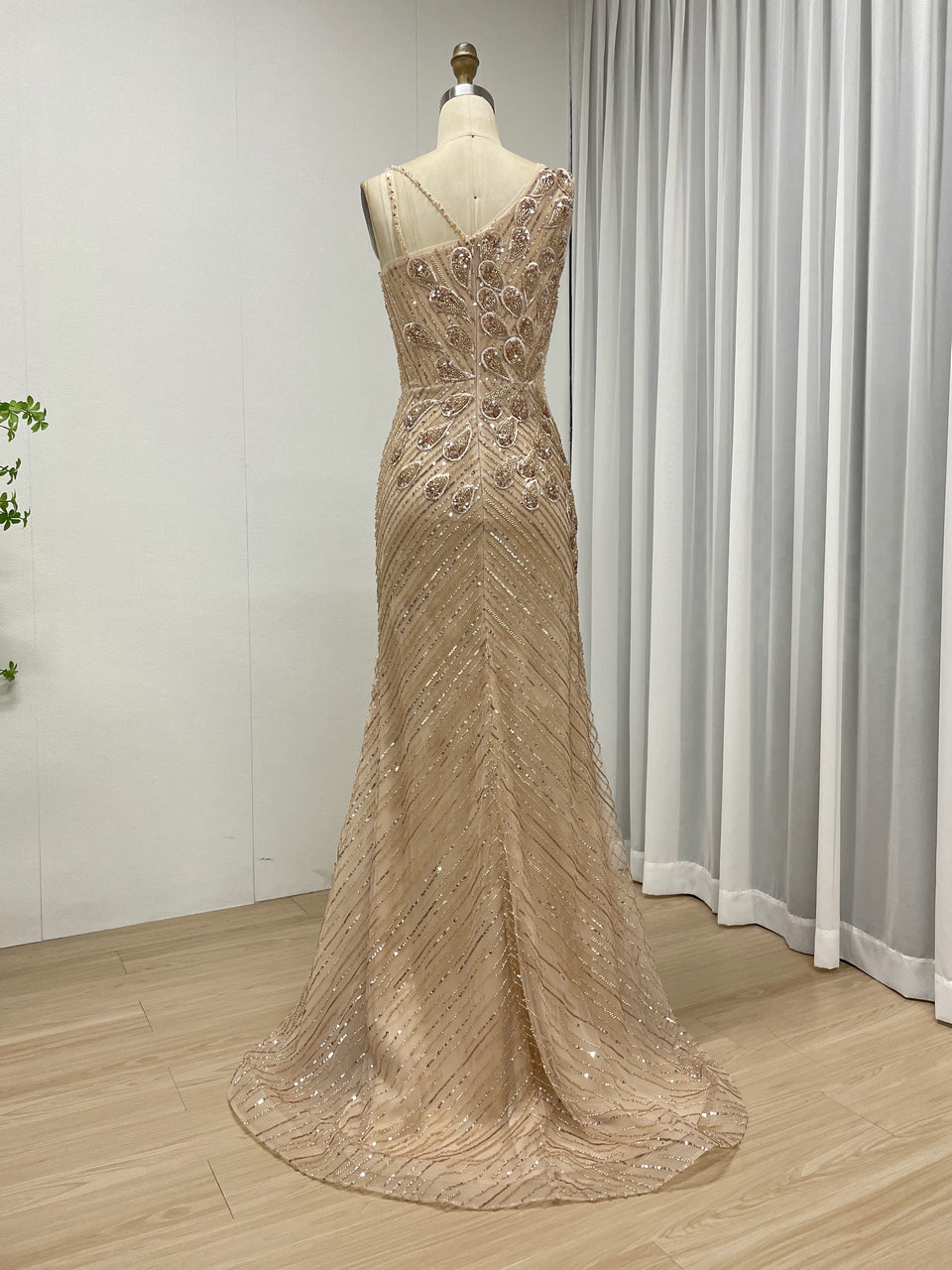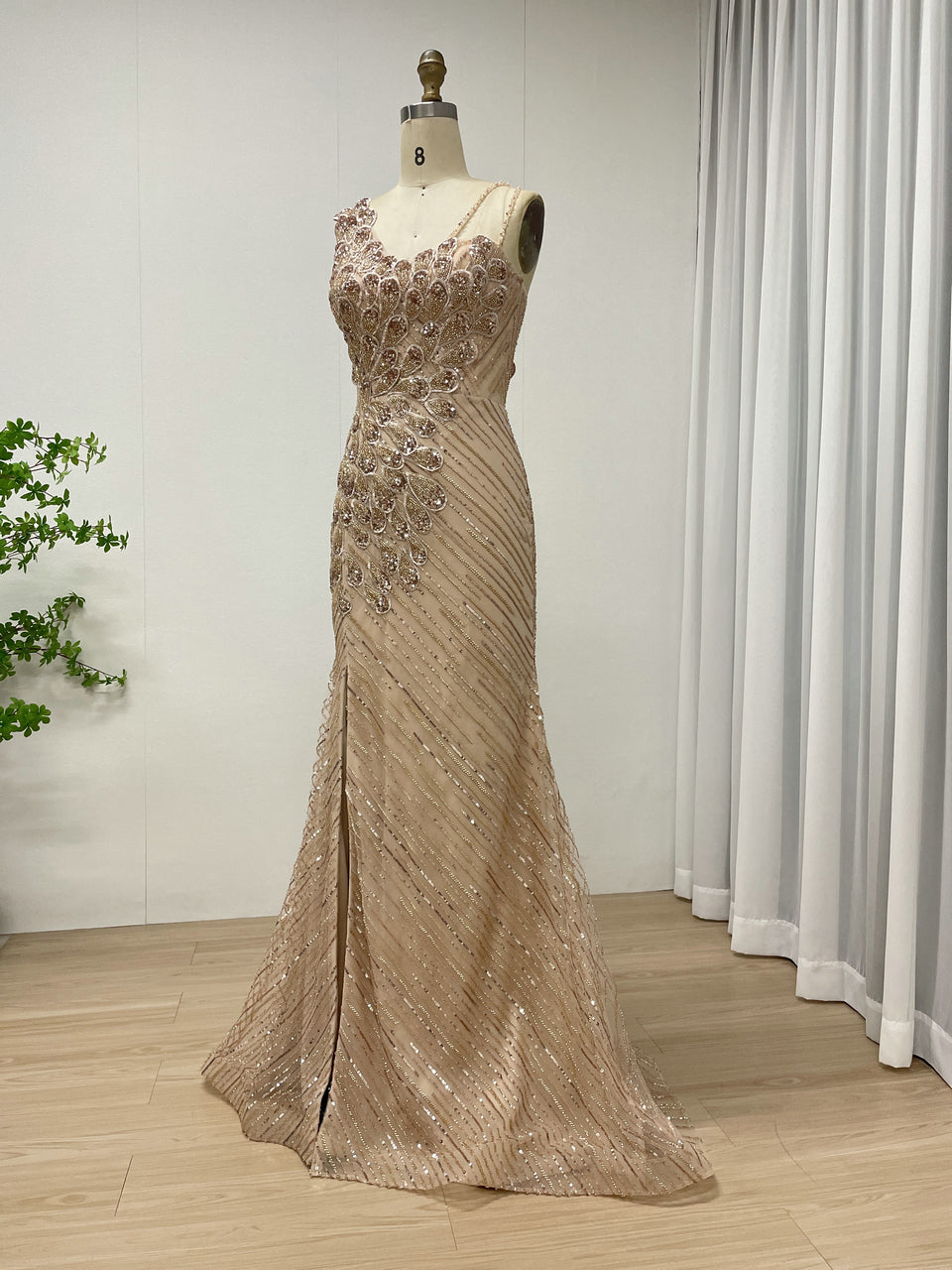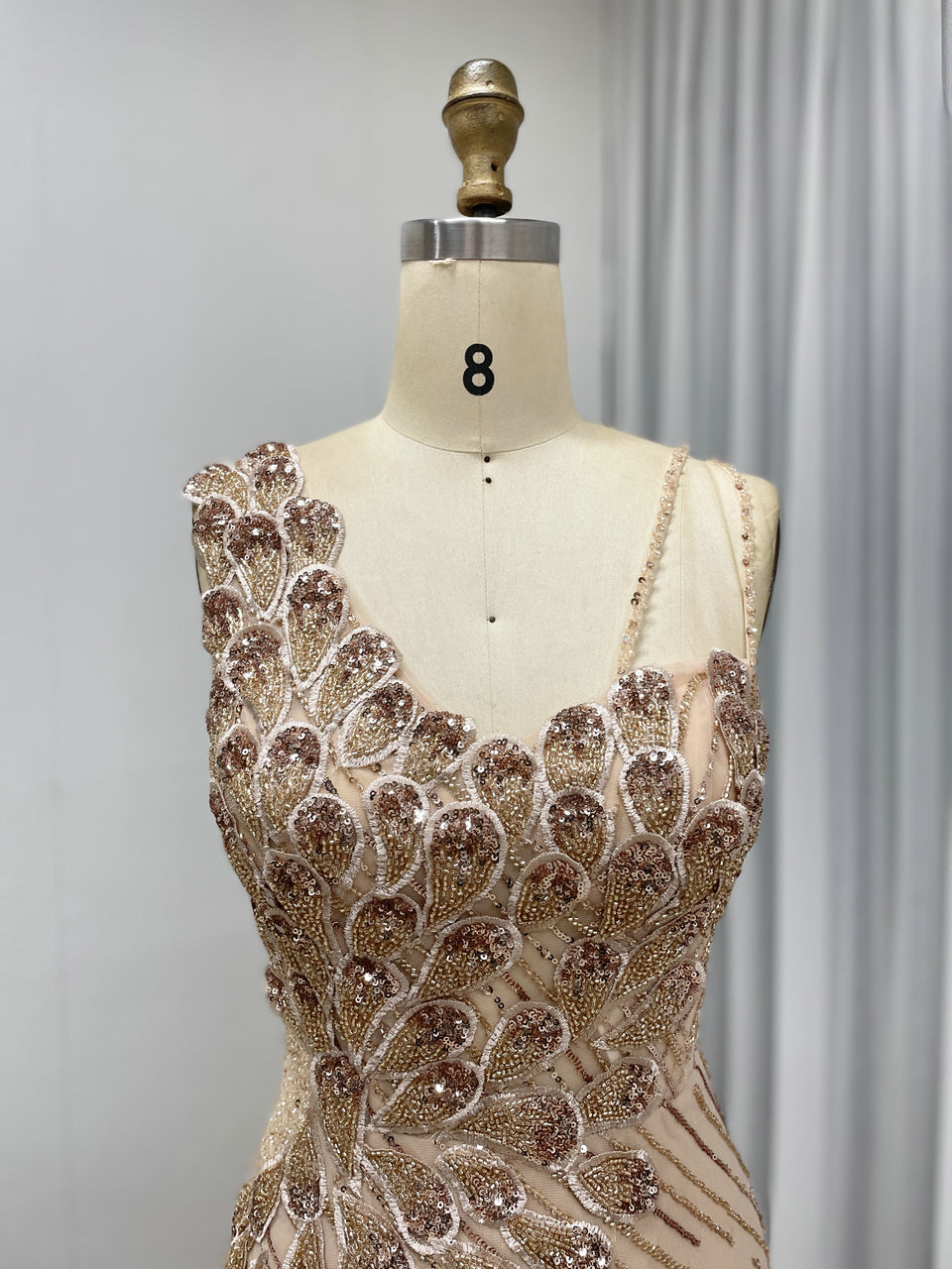Dubai Gorgeous Champagne Evening Dress Sexy High Slit Spaghetti Strap With Exquisite Intricate Hand Beaded MB40347