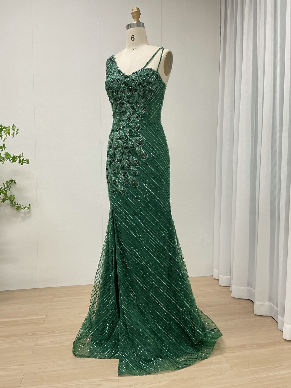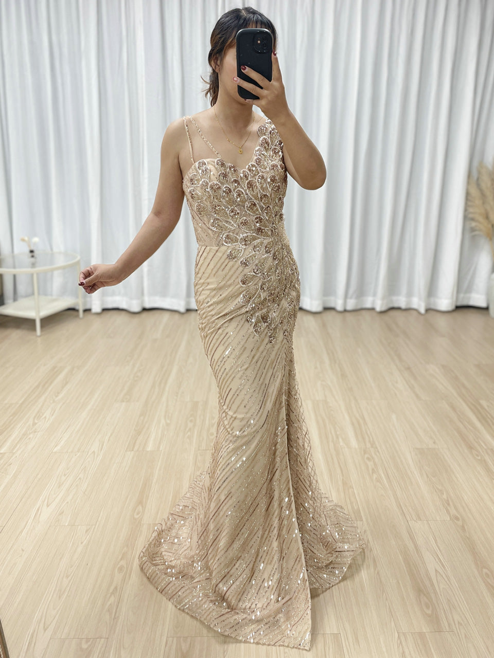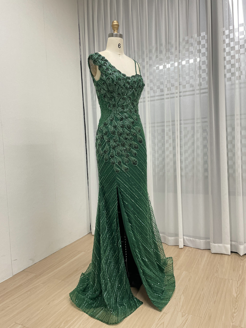 Dubai Gorgeous Champagne Evening Dress Sexy High Slit Spaghetti Strap With Exquisite Intricate Hand Beaded MB40347