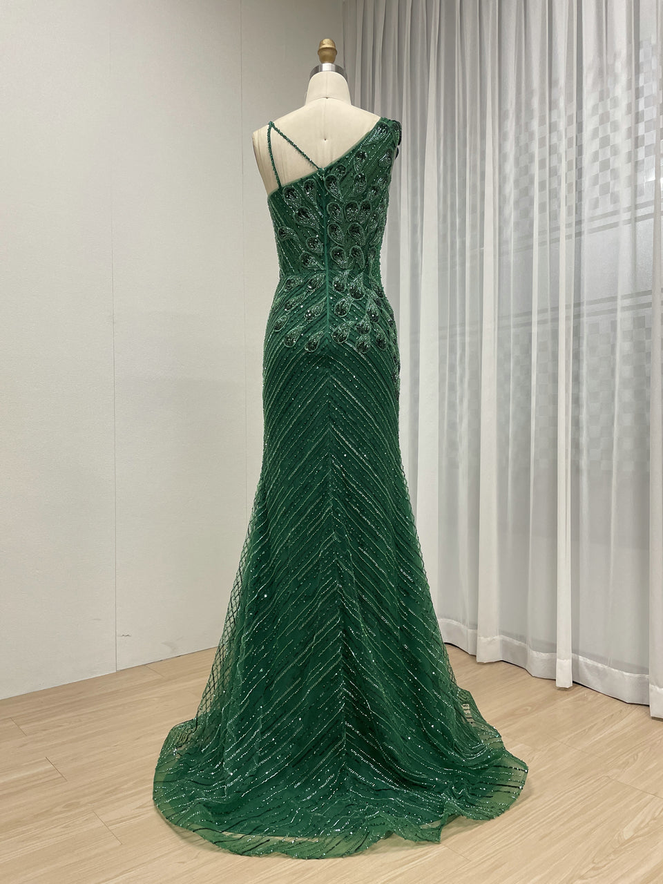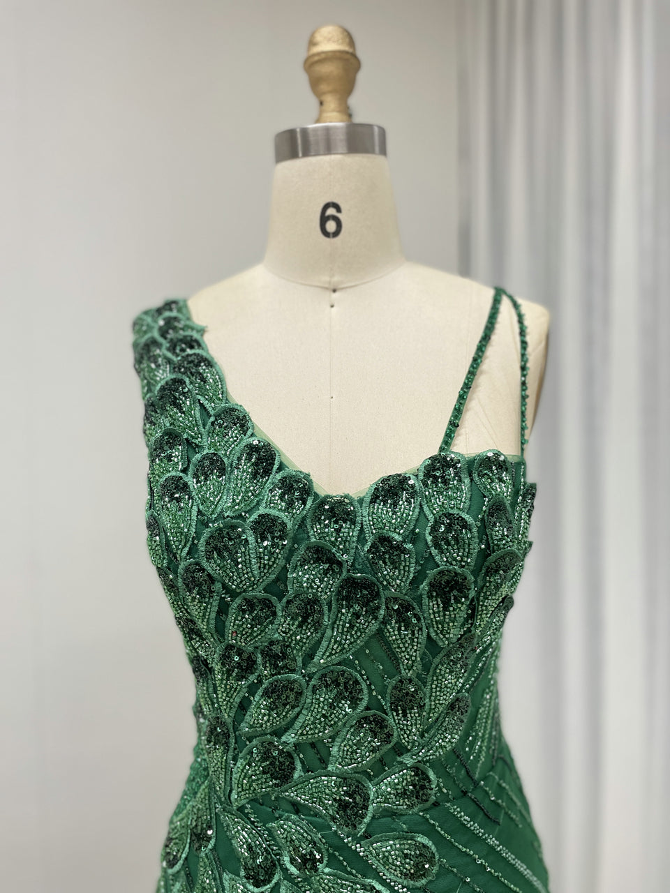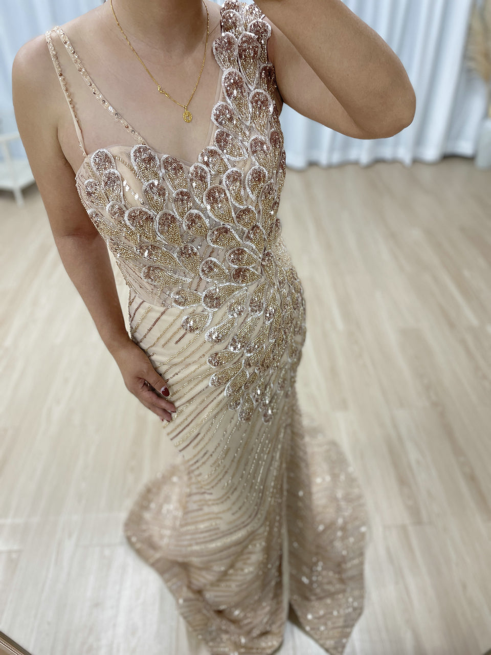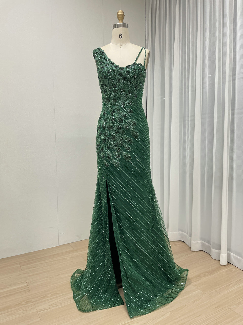 Dubai Gorgeous Champagne Evening Dress Sexy High Slit Spaghetti Strap With Exquisite Intricate Hand Beaded MB40347