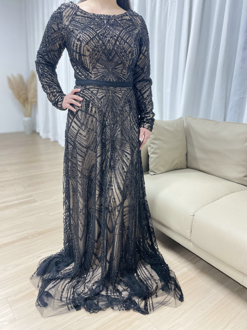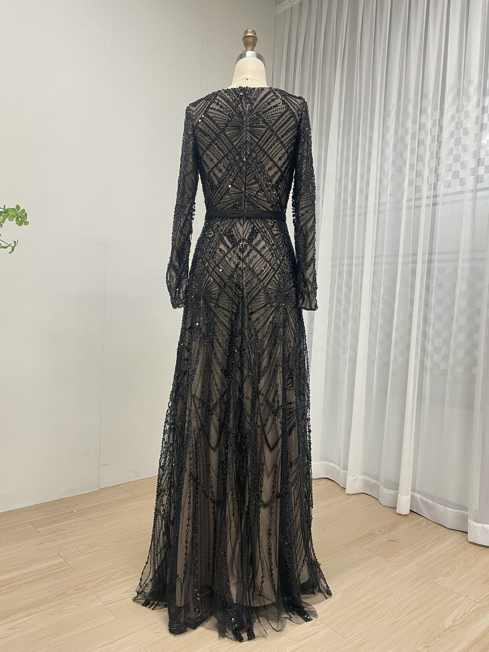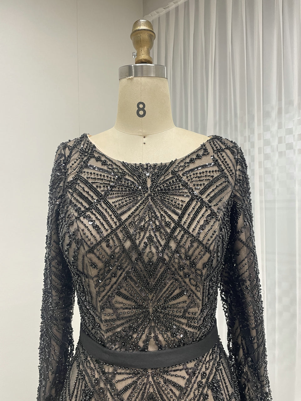 Elegant Black Beaded Dress Long Sleeves Train Cocktail Style MY30076-2