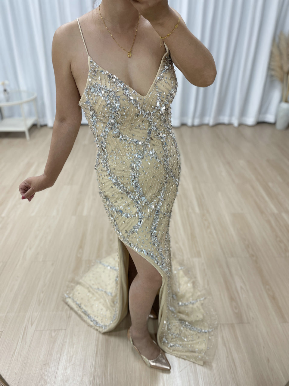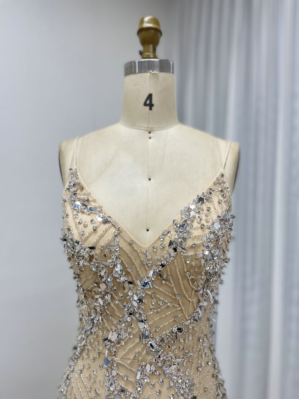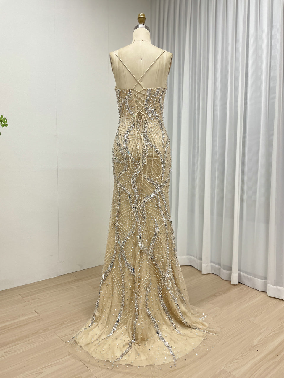 Elegant Champagne Evening Gown with V-Neck Beaded Bodice Mermaid Style MB40415