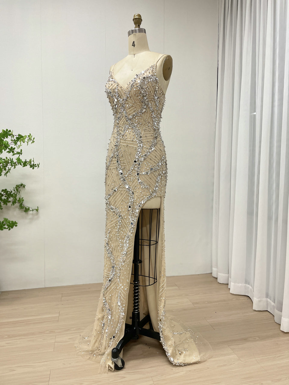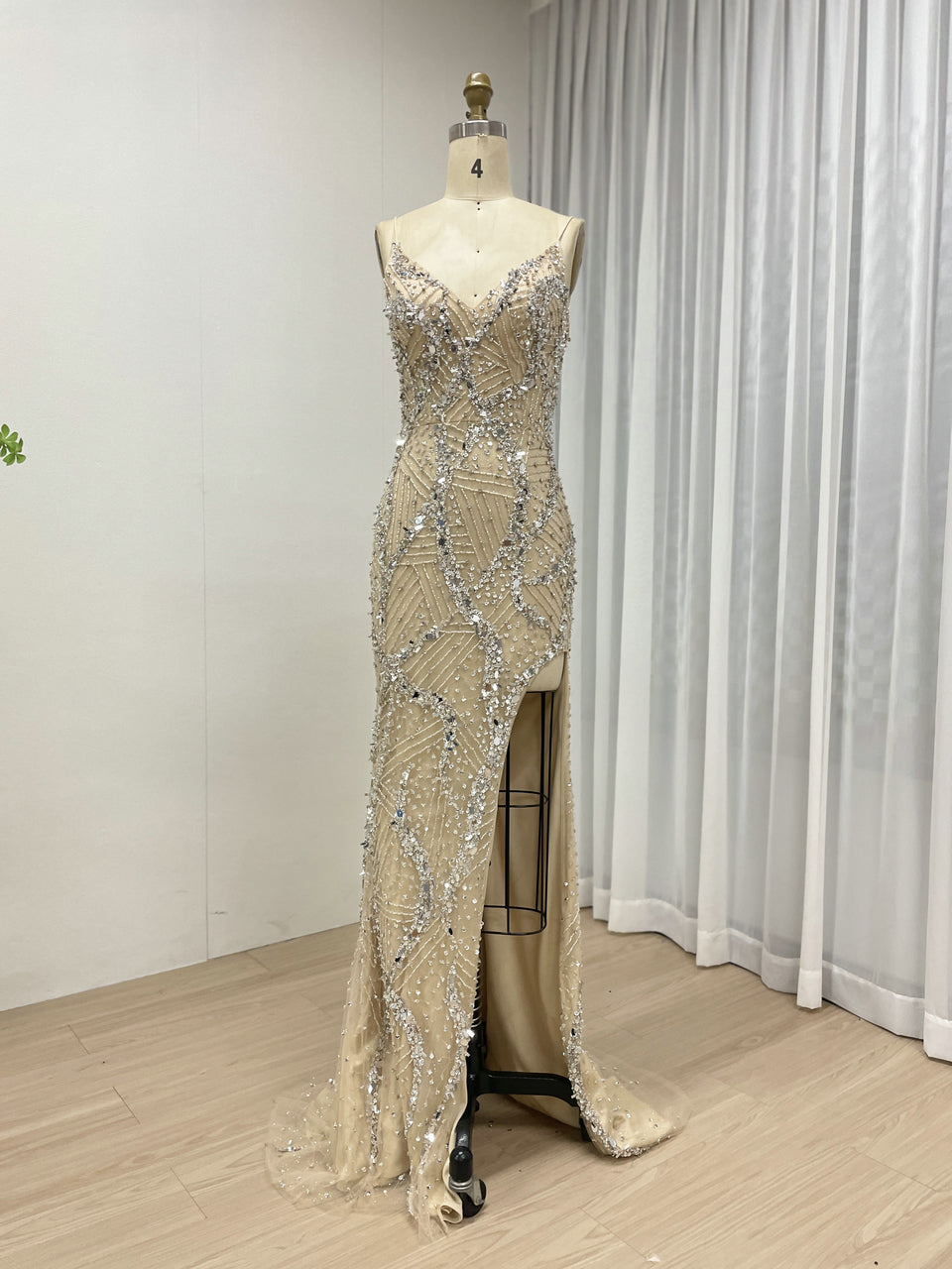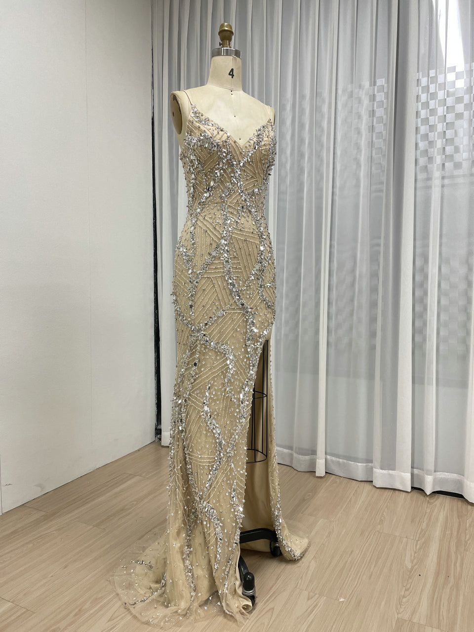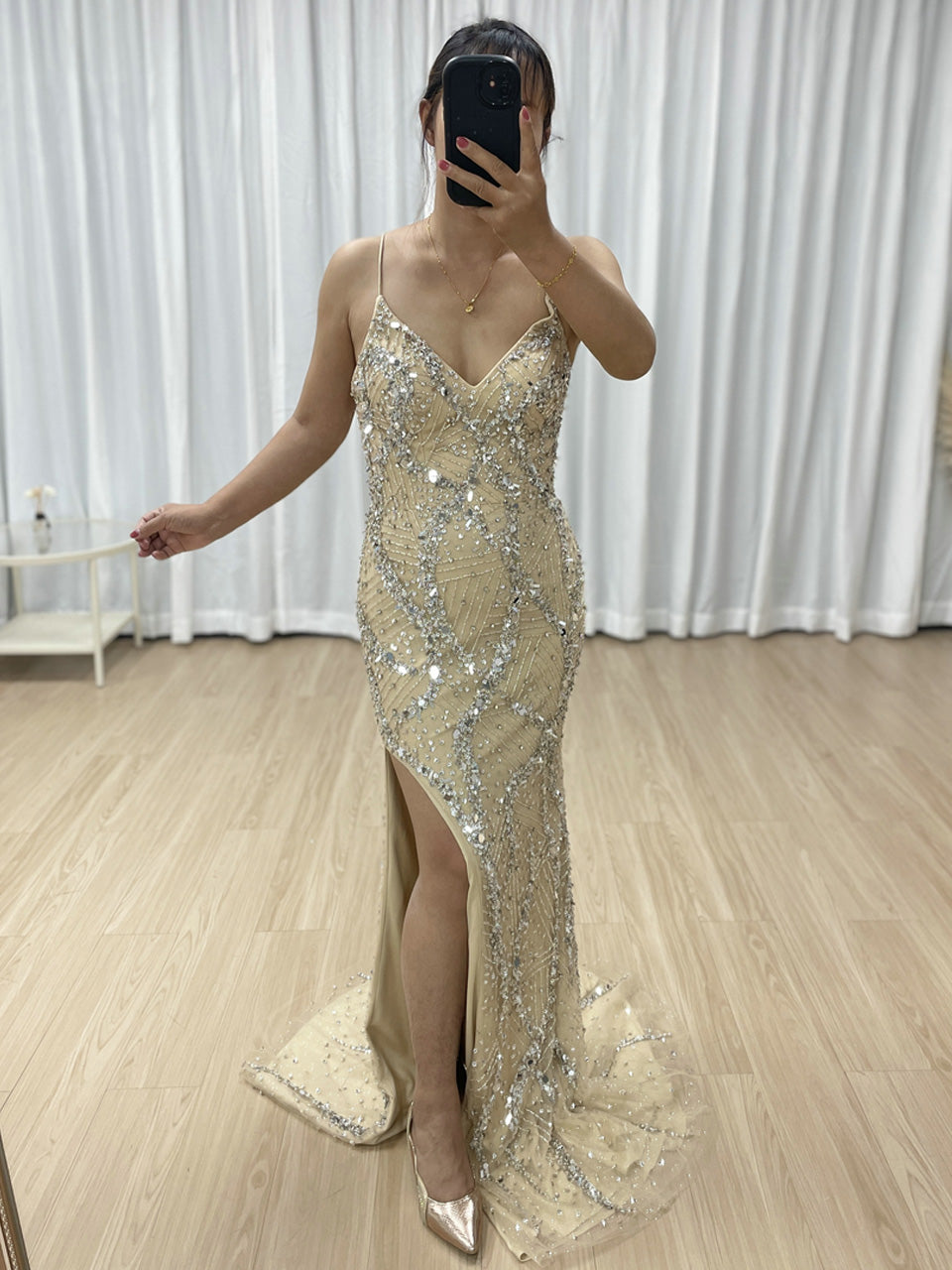 Elegant Champagne Evening Gown with V-Neck Beaded Bodice Mermaid Style MB40415