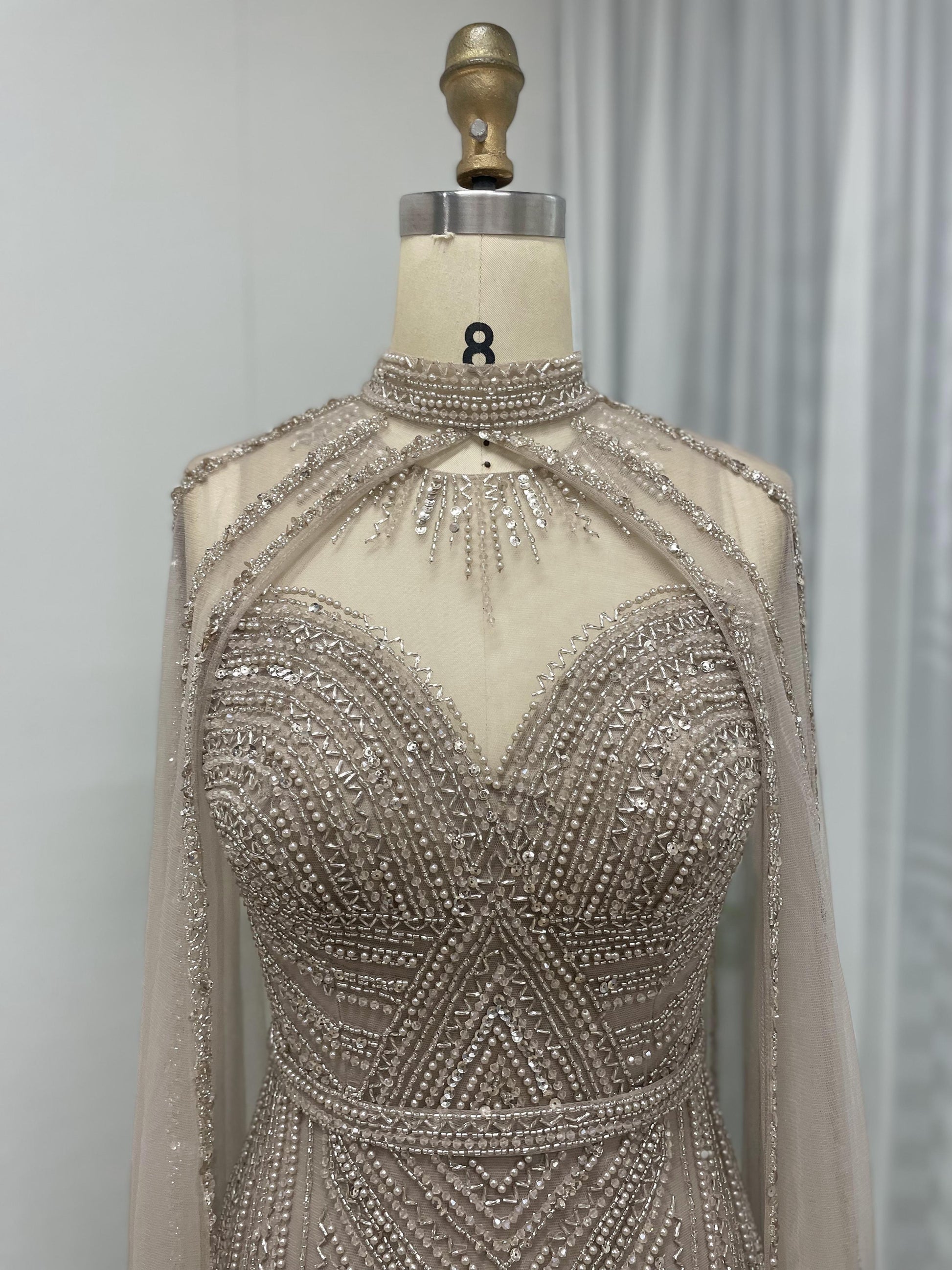 Elegant Couture Beading Shoulder Cape Long Sleeve Wedding Party Guest Formal Dress MB40186
