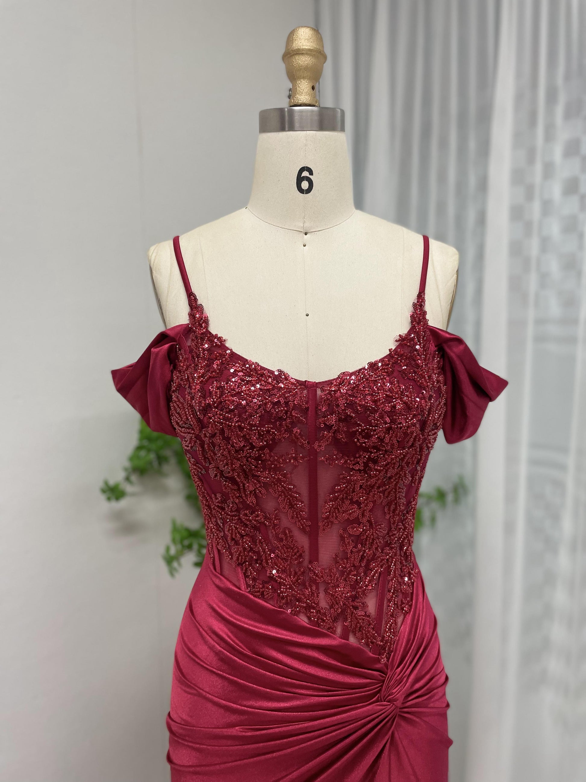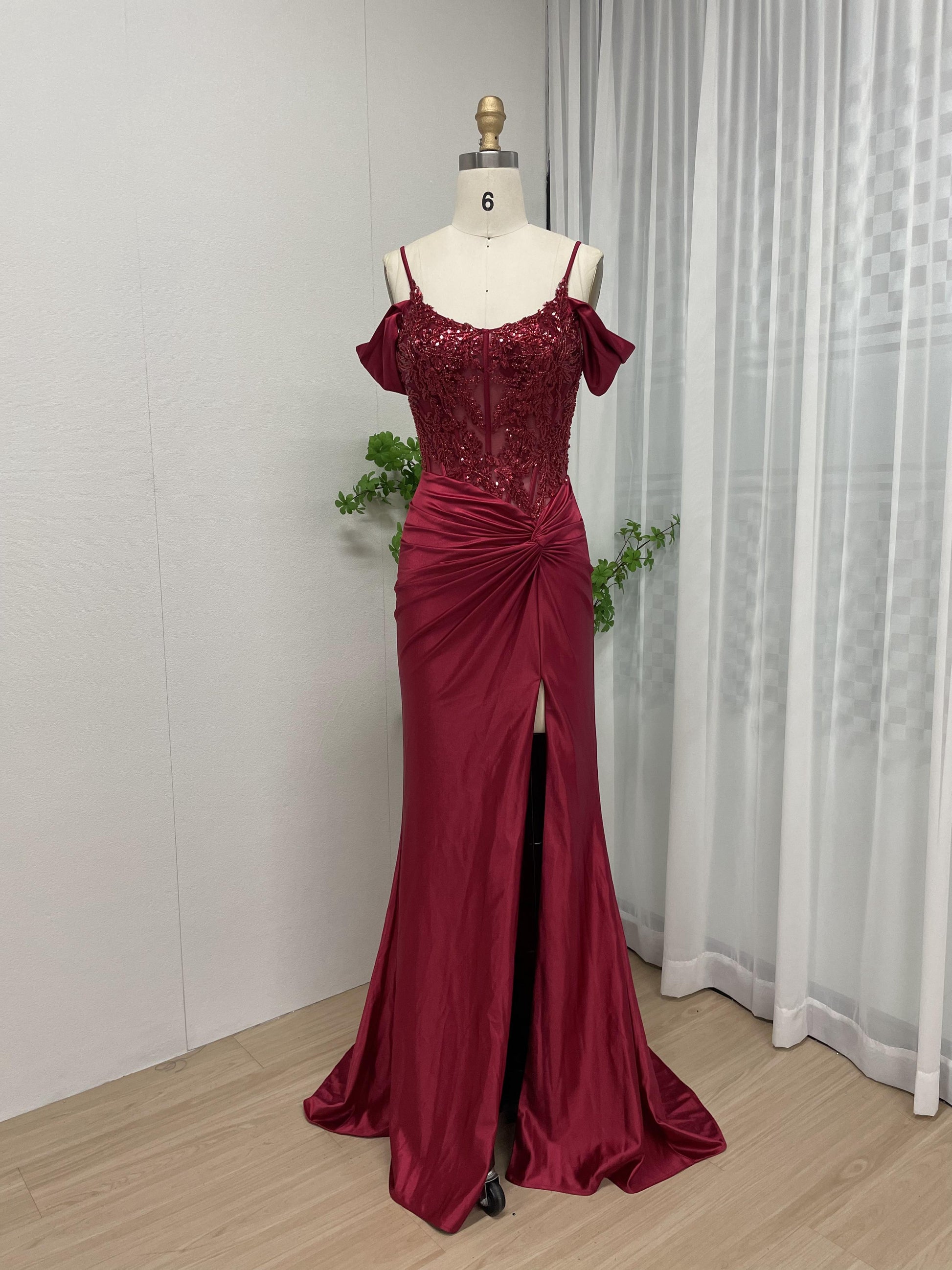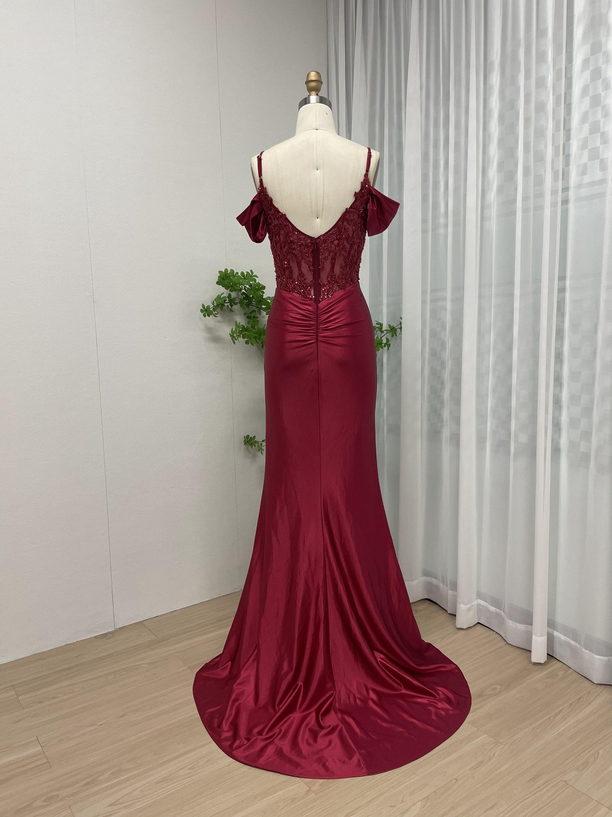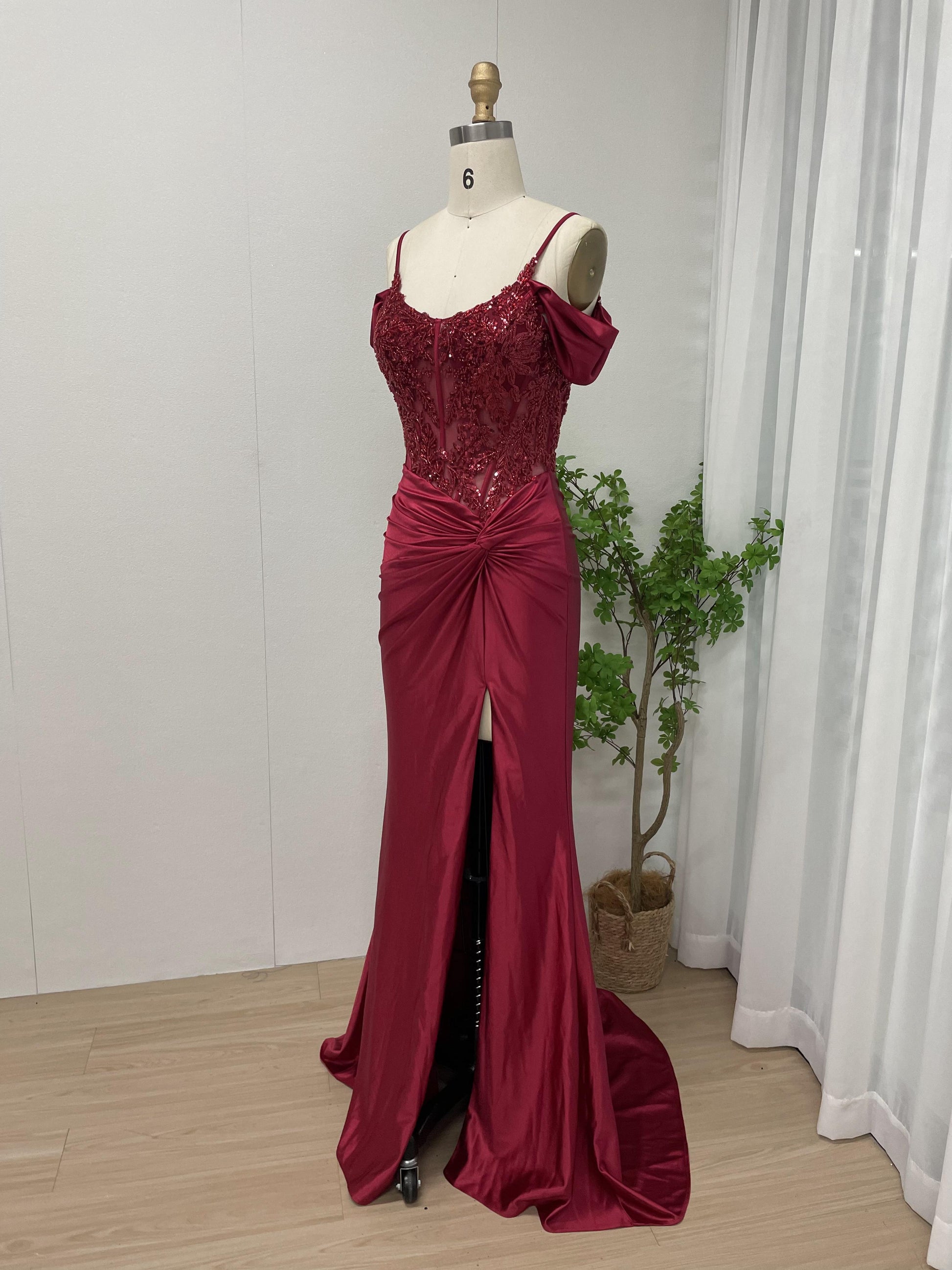 Elegant Off Shoulder Corset Lace Applique High Split Prom Dress MB40160