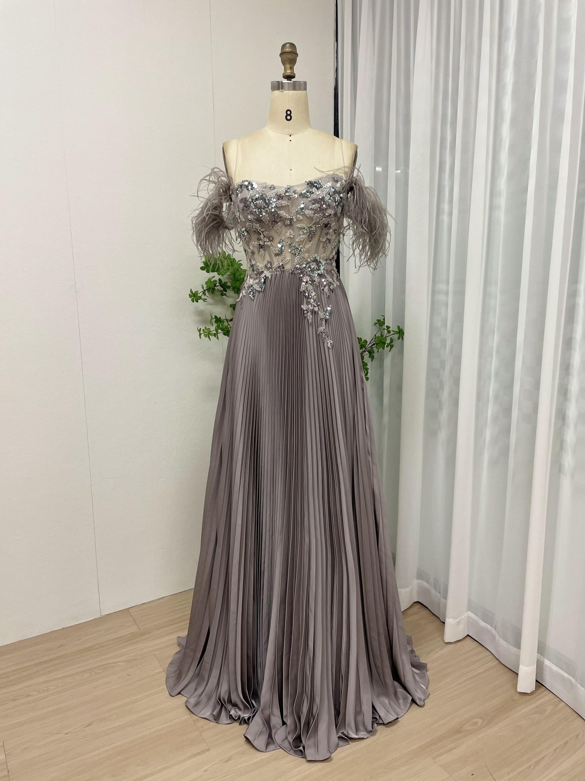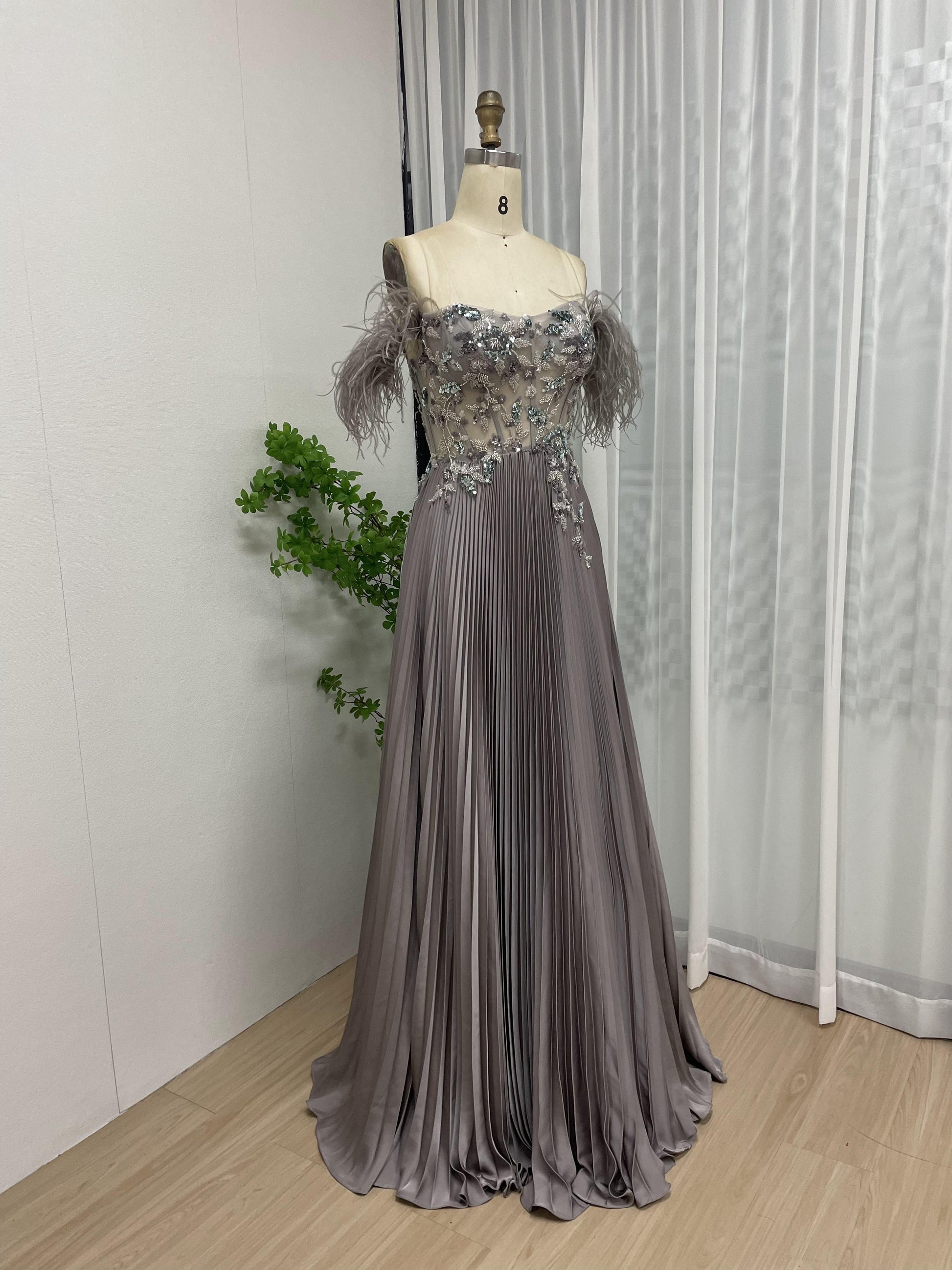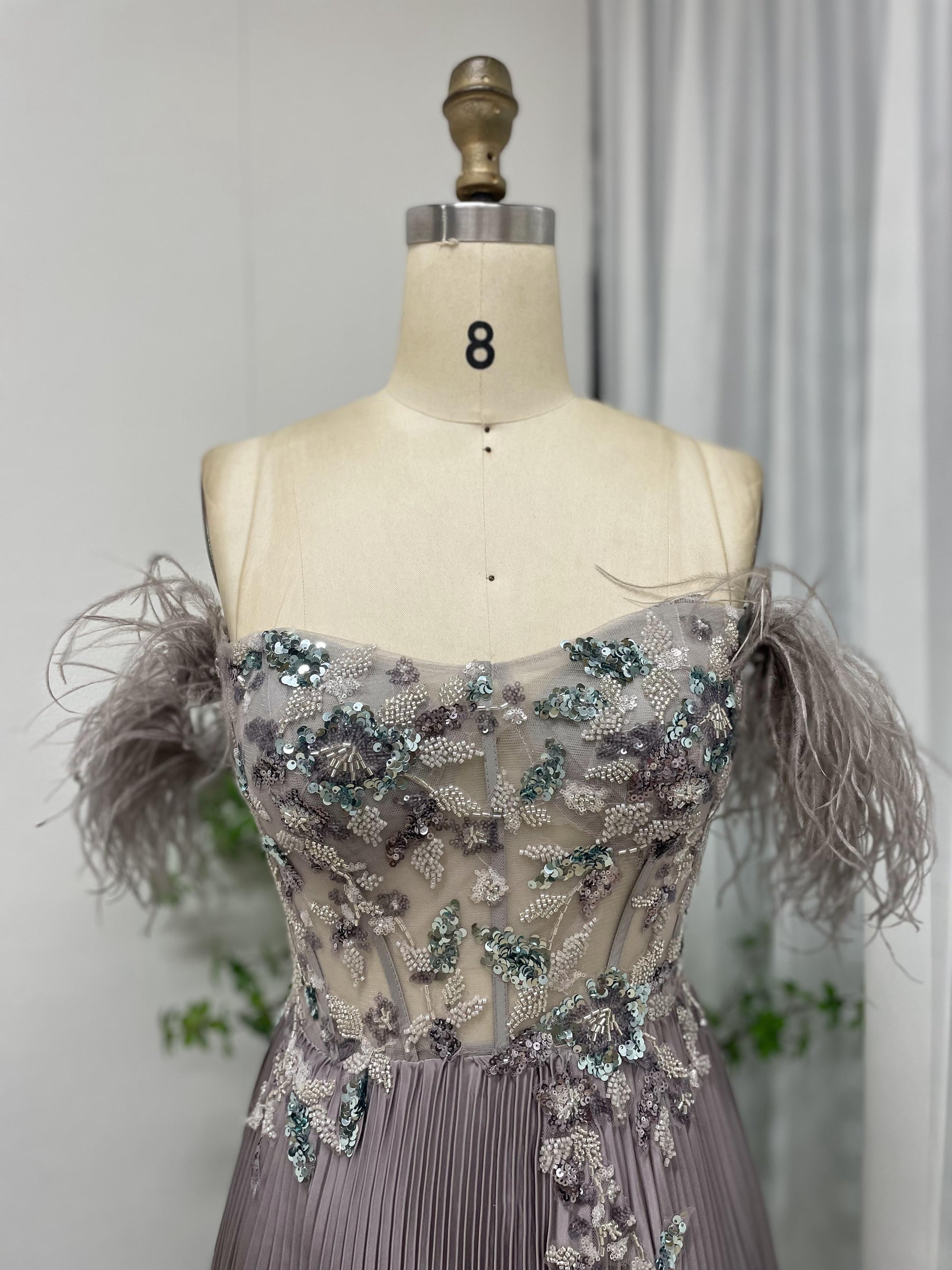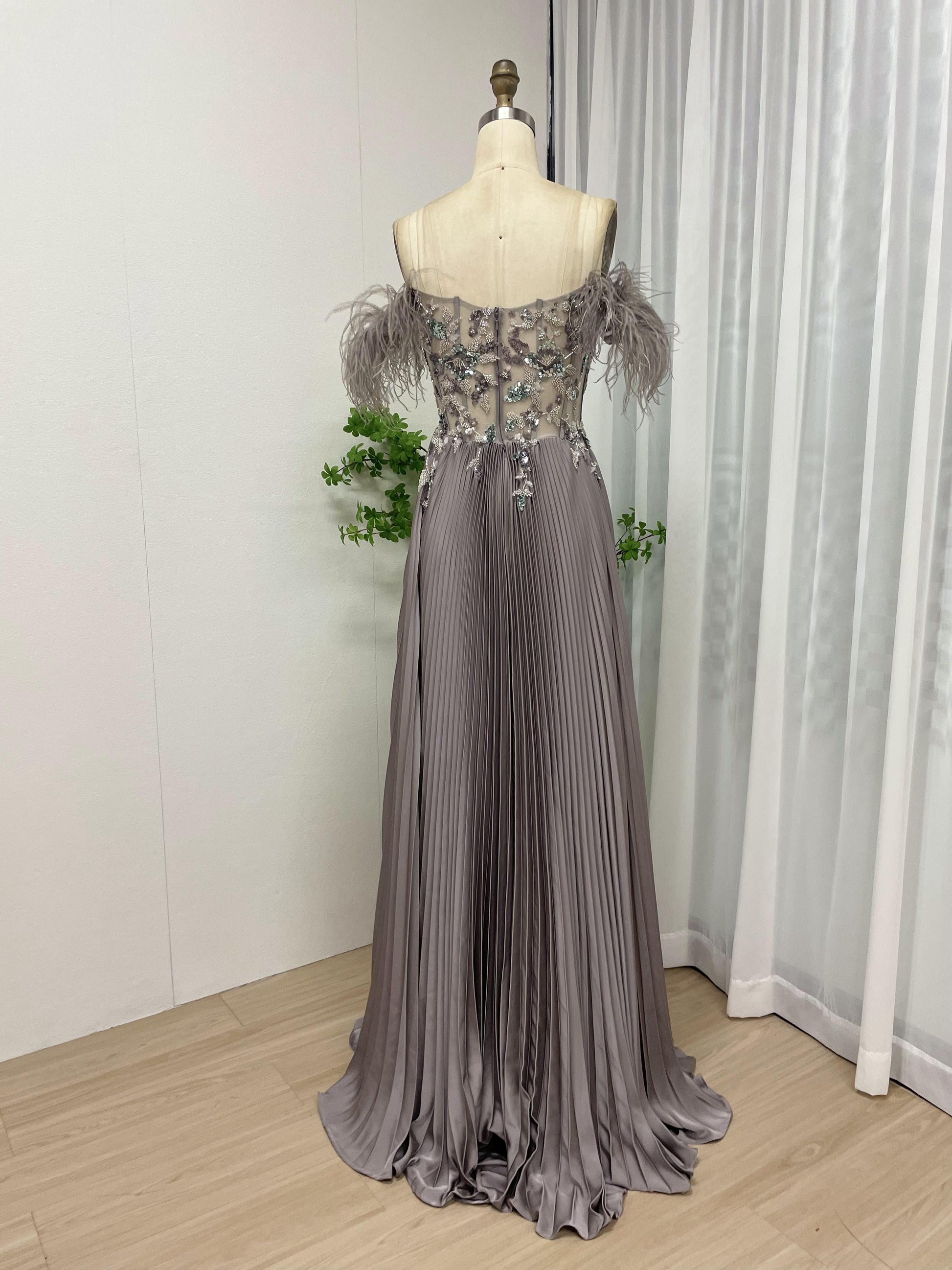 Elegant Off Shoulder Feather Embellished Beading Lace A Line Petite Party Formal Dress MB40201