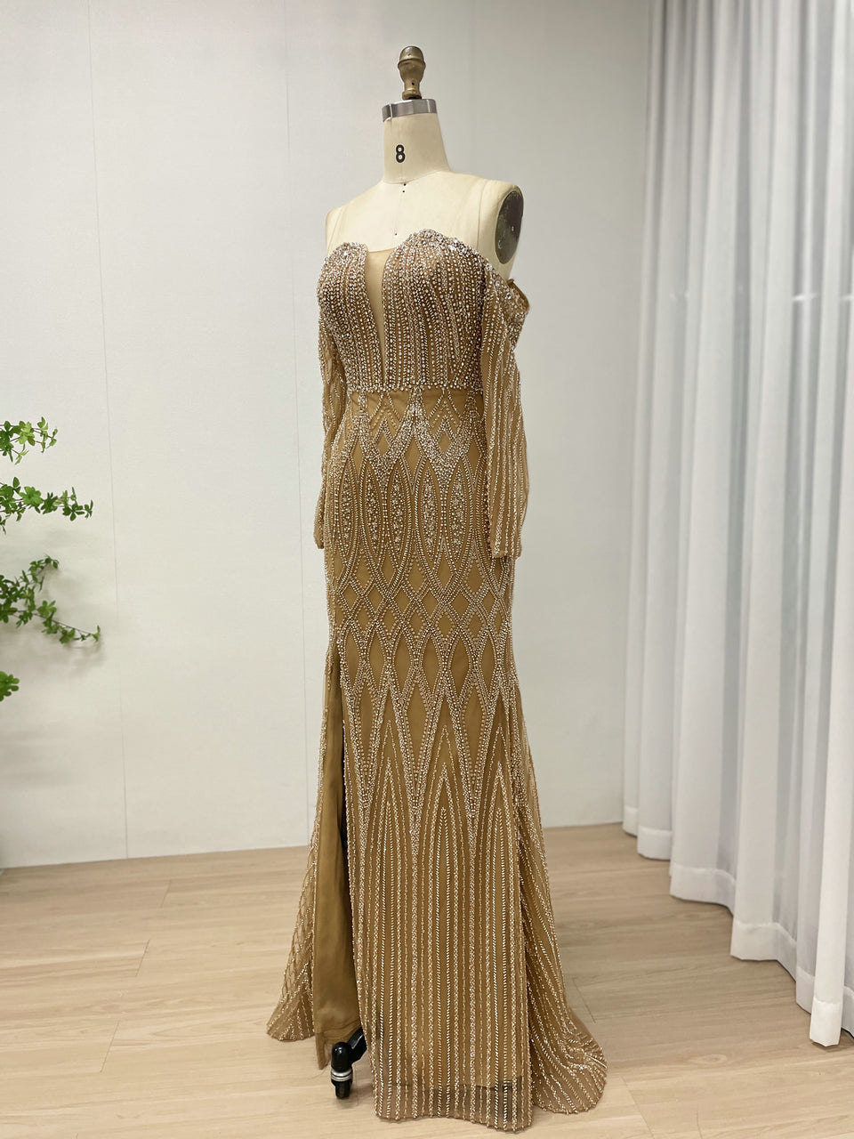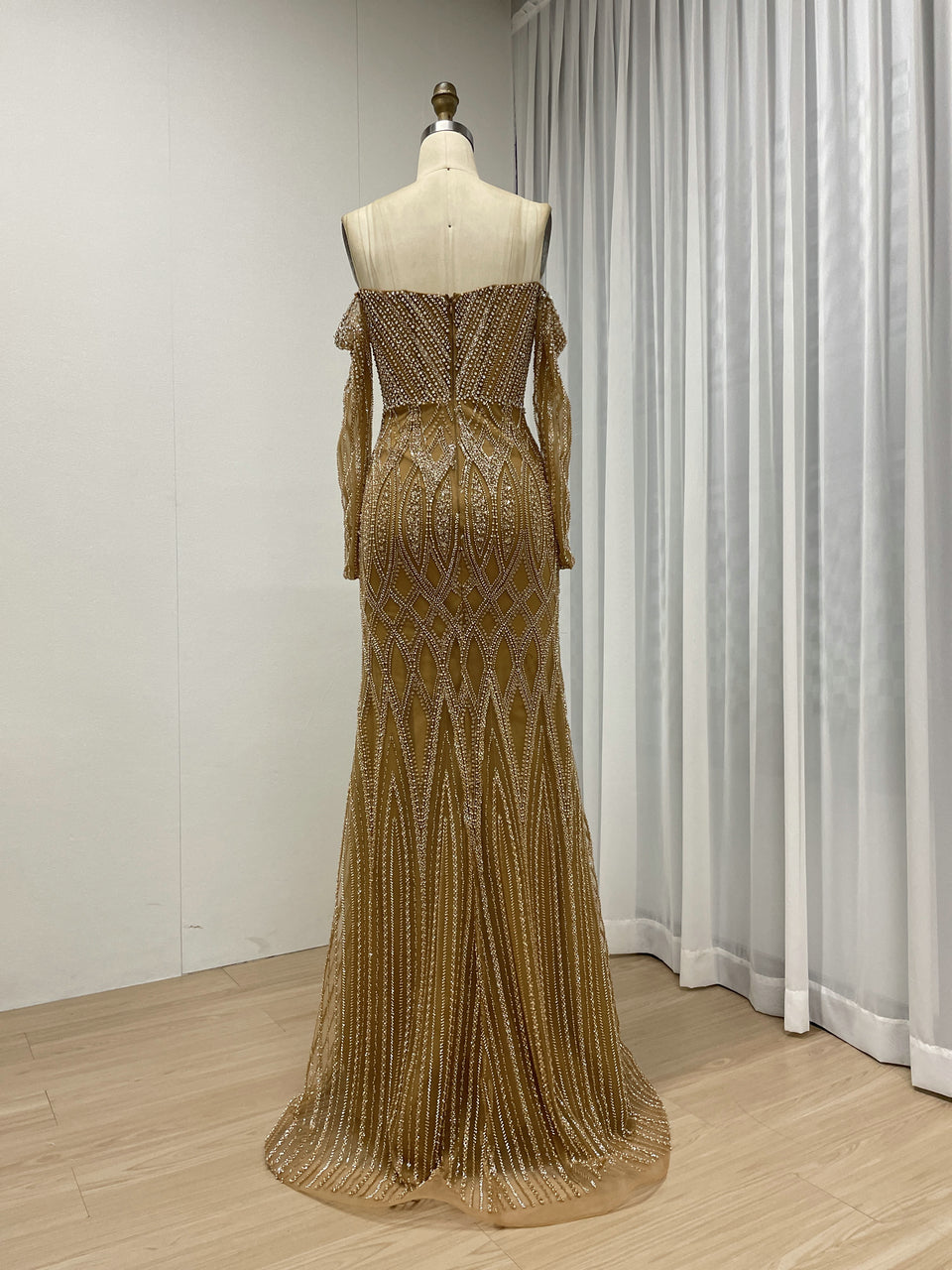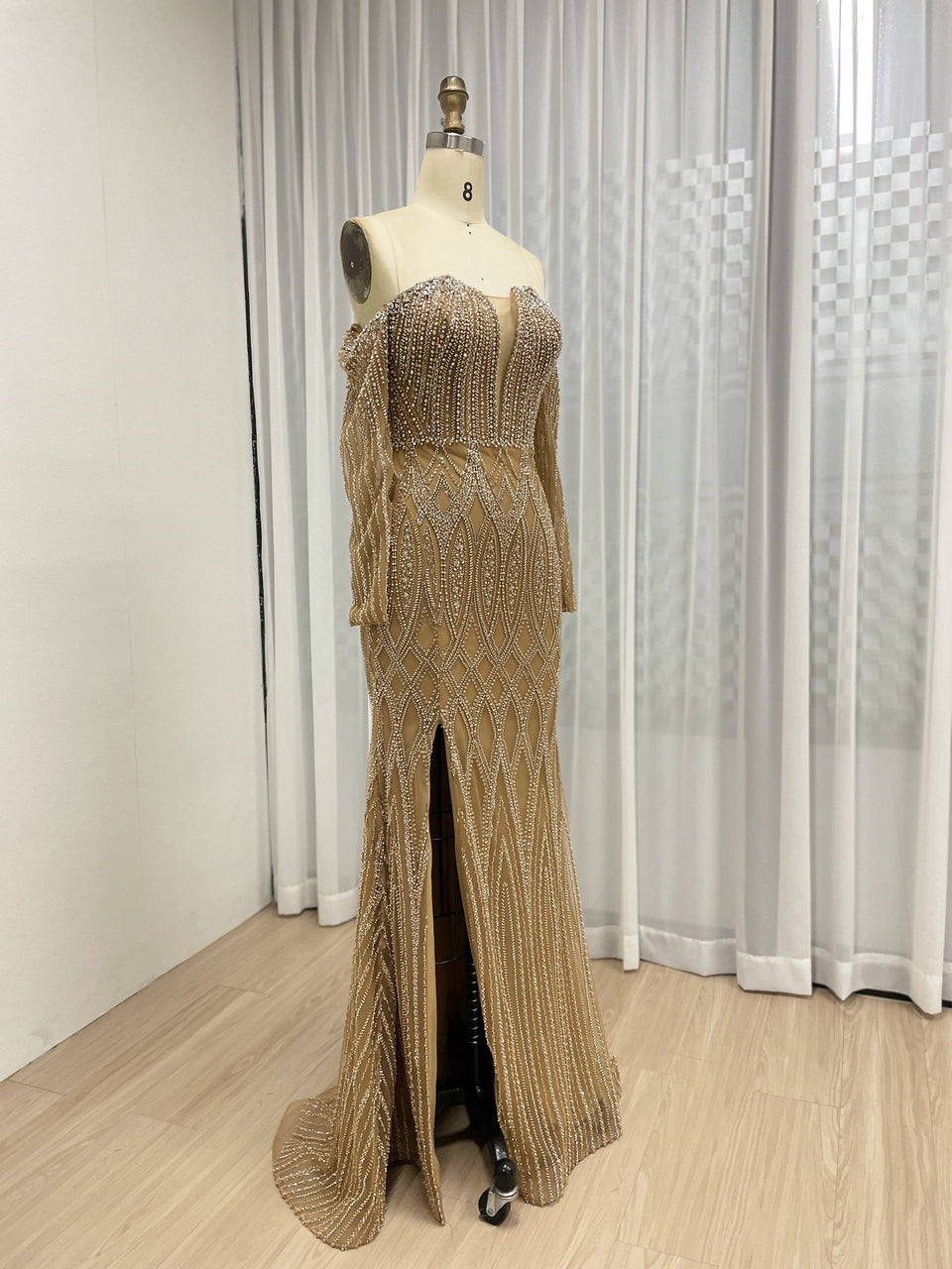 Elegant Off the Shoulder Brown Mermaid Banquet Evening Gown With Exquisite Embroidered Beaded MB40360