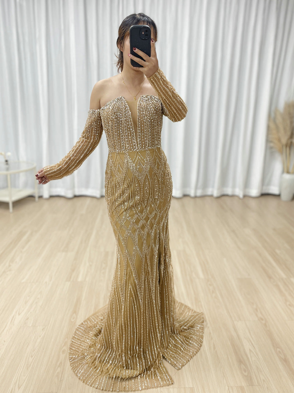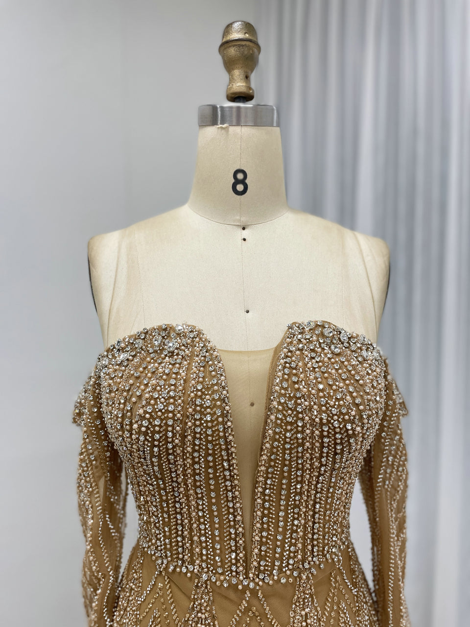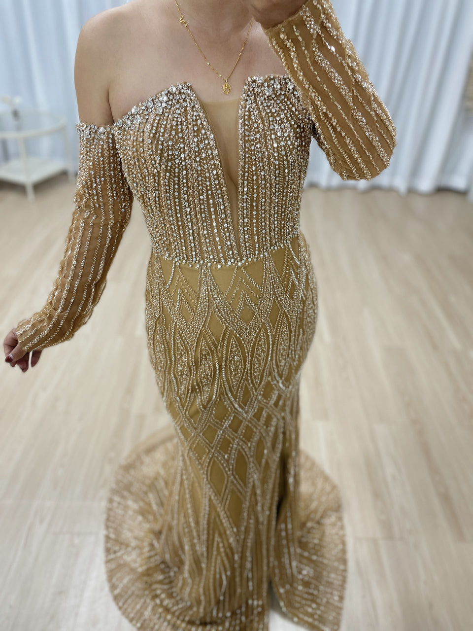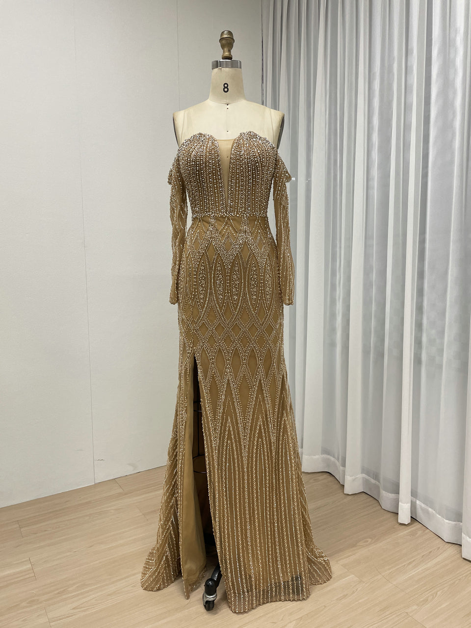 Elegant Off the Shoulder Brown Mermaid Banquet Evening Gown With Exquisite Embroidered Beaded MB40360