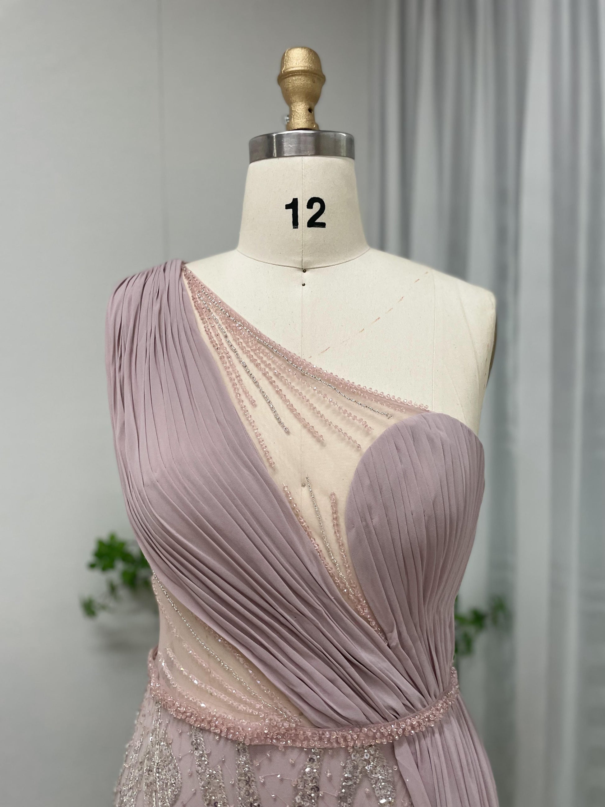 Elegant One Shoulder Beading Lace Chiffon Side-Skirt Evening Dress MB40084