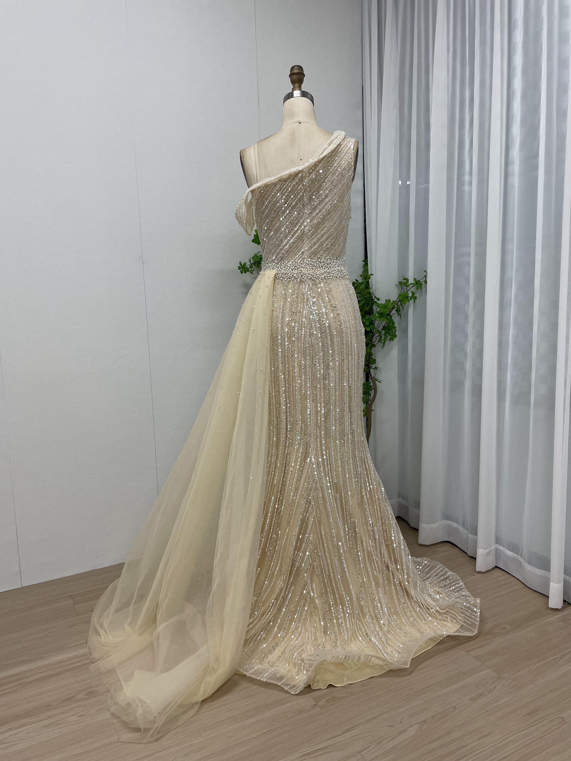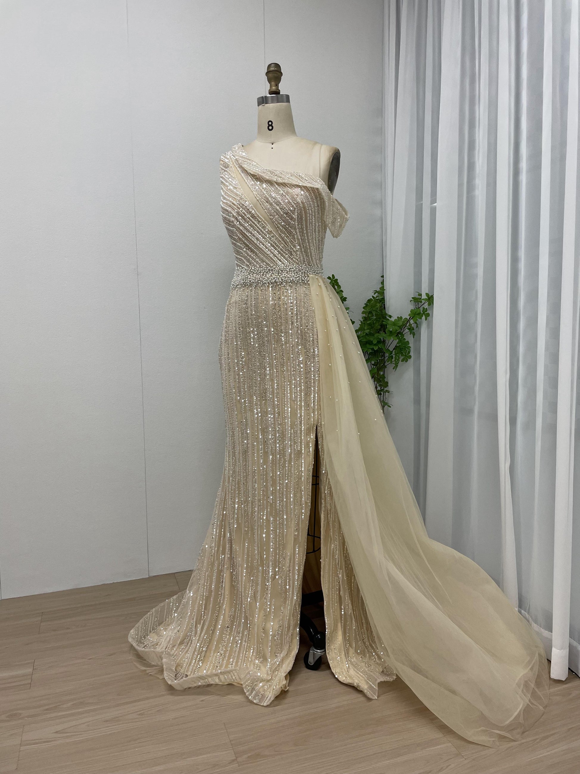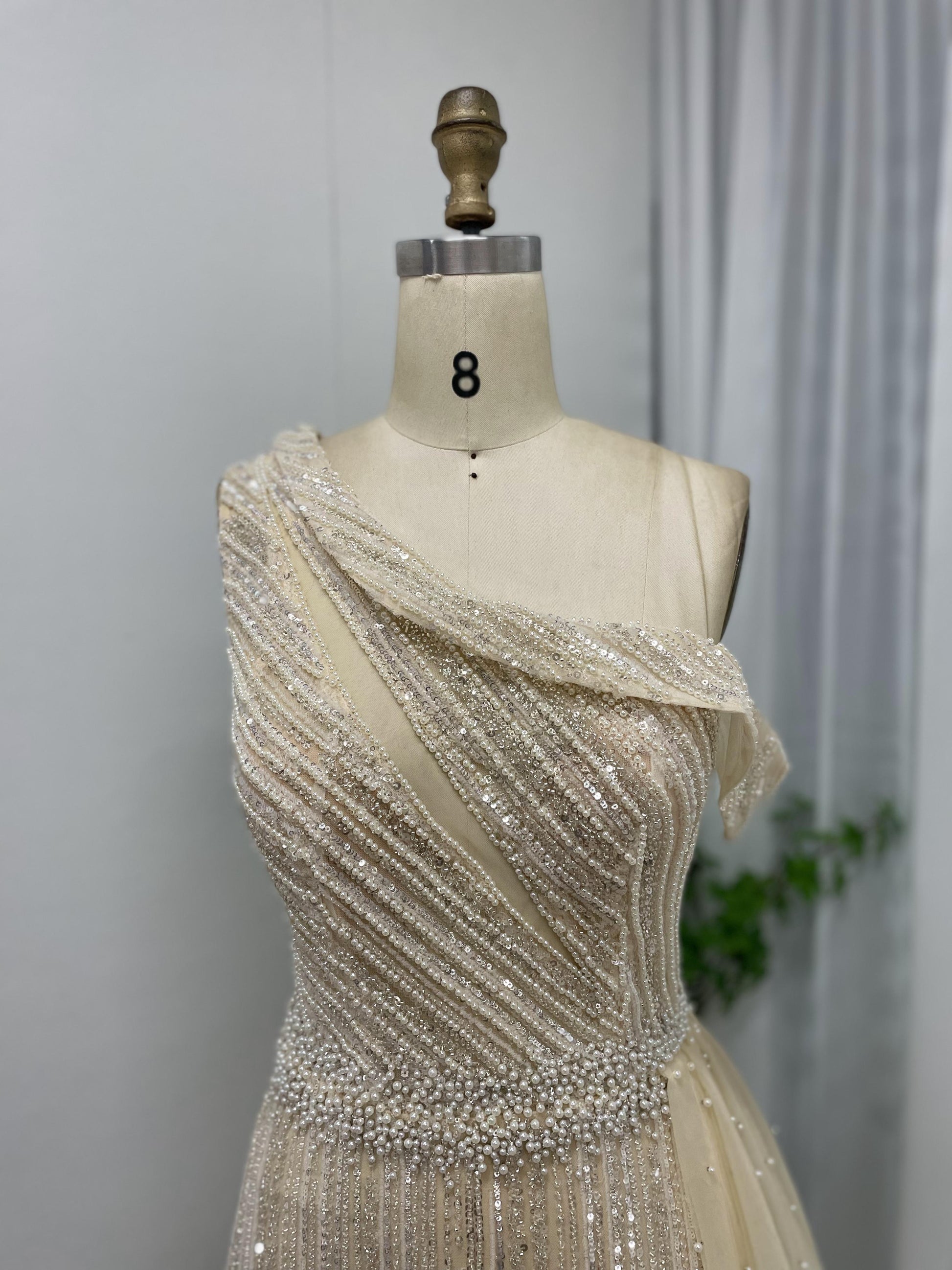 Elegant One Shoulder Sheer Beading Lace Champagne Formal Evening Gown MB40176