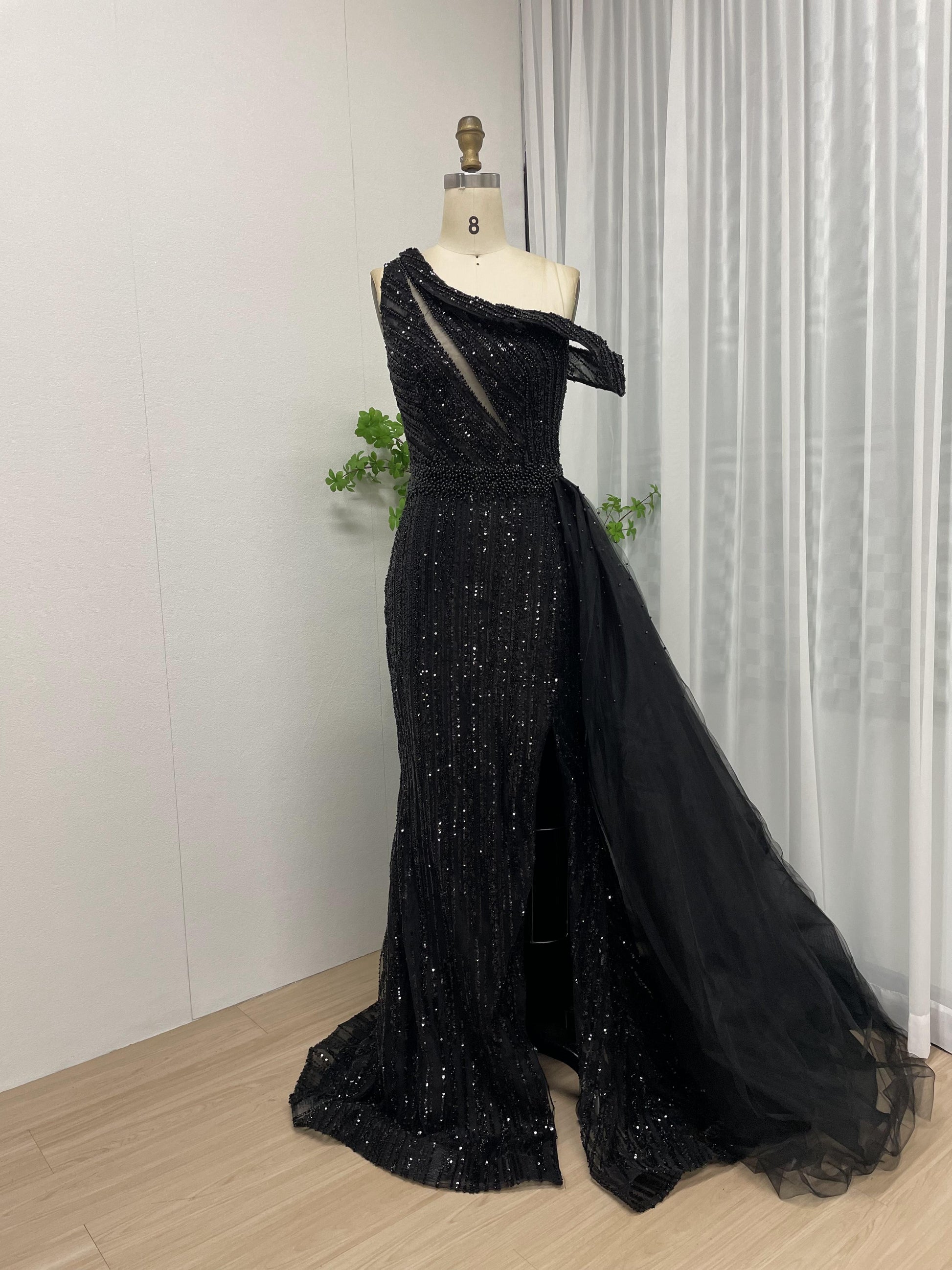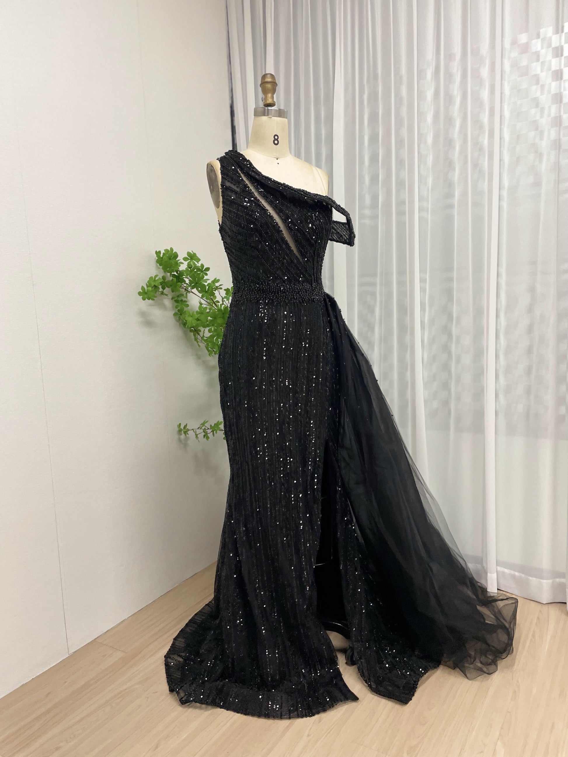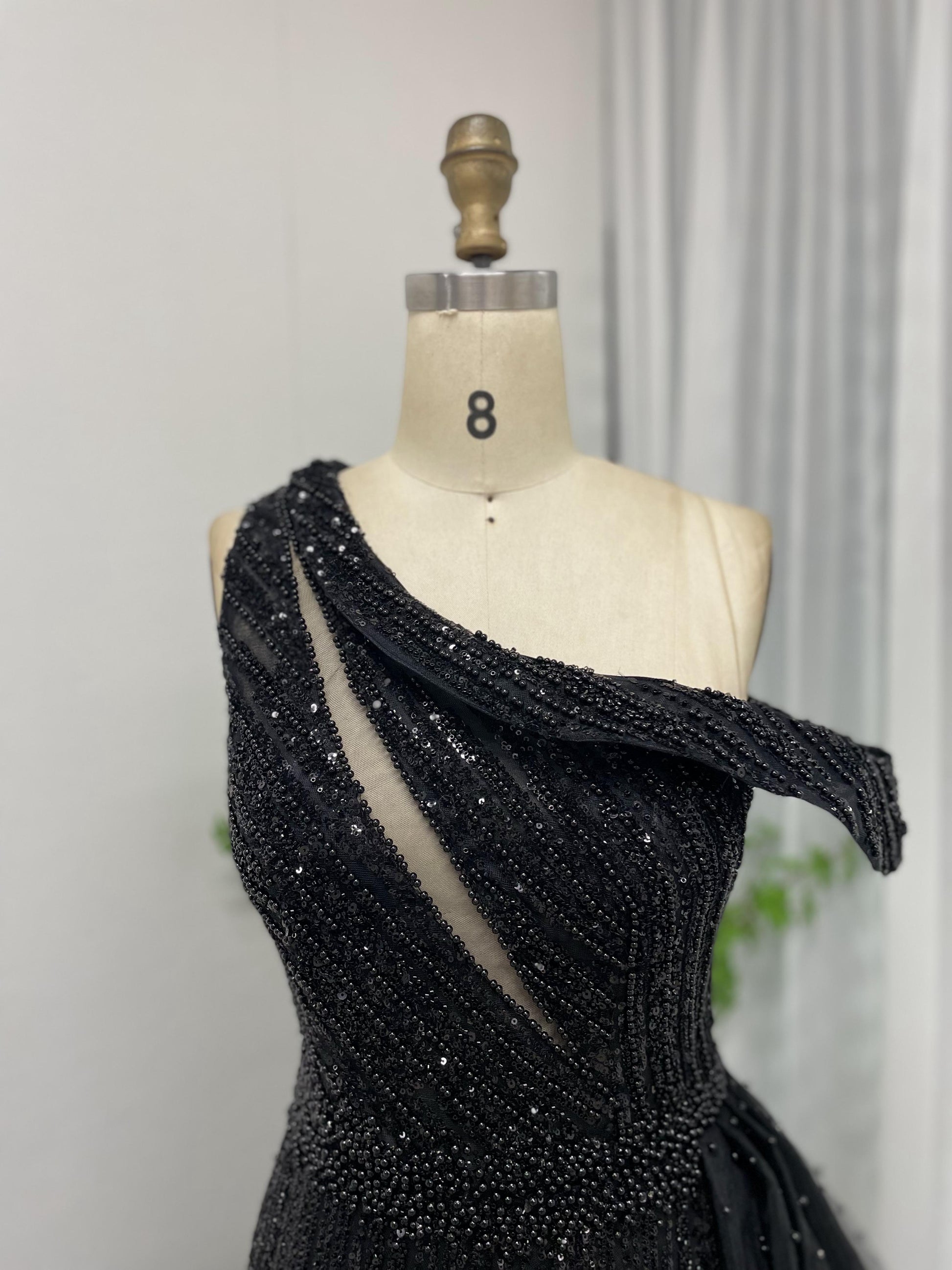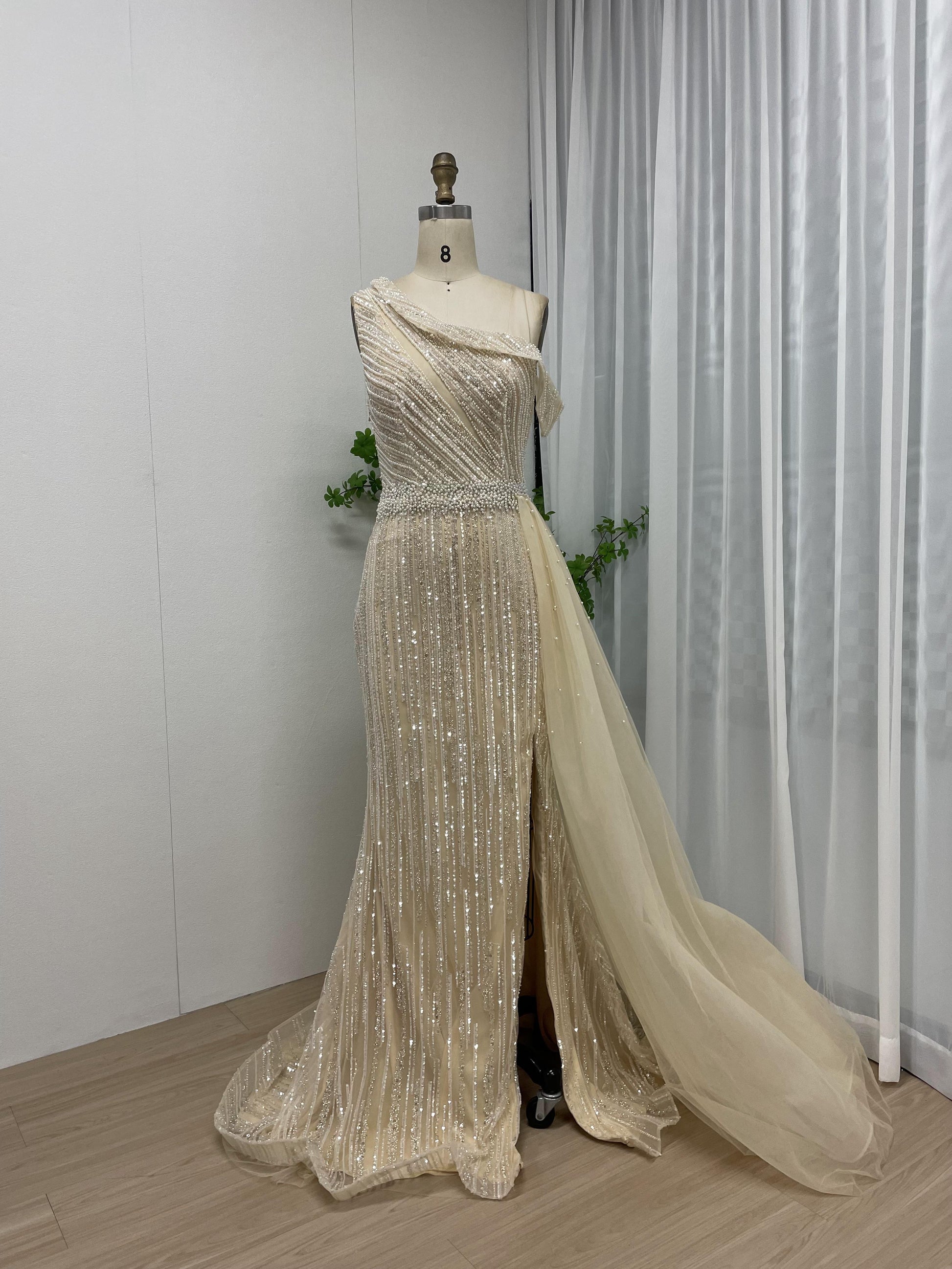 Elegant One Shoulder Sheer Beading Lace Champagne Formal Evening Gown MB40176