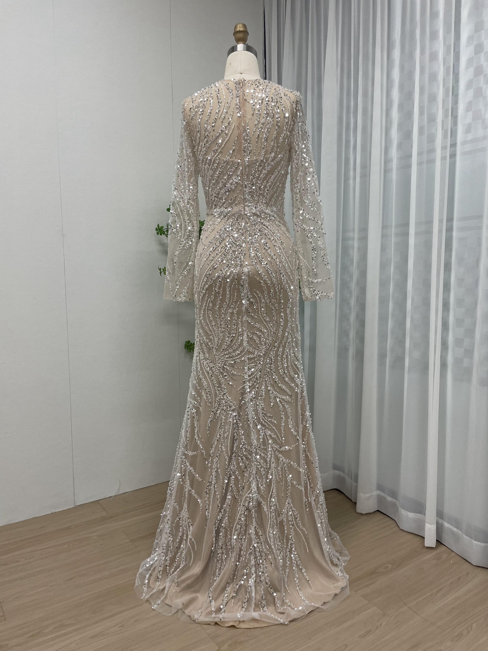 Elegant Sheer Beading Neck Long Sleeve Ivory Nude Evening Dress MB40216