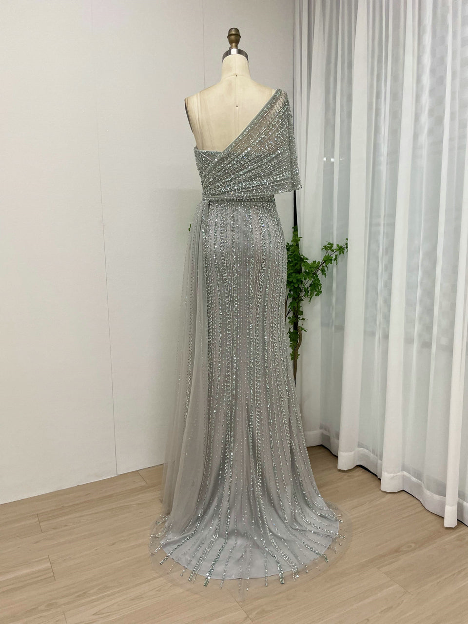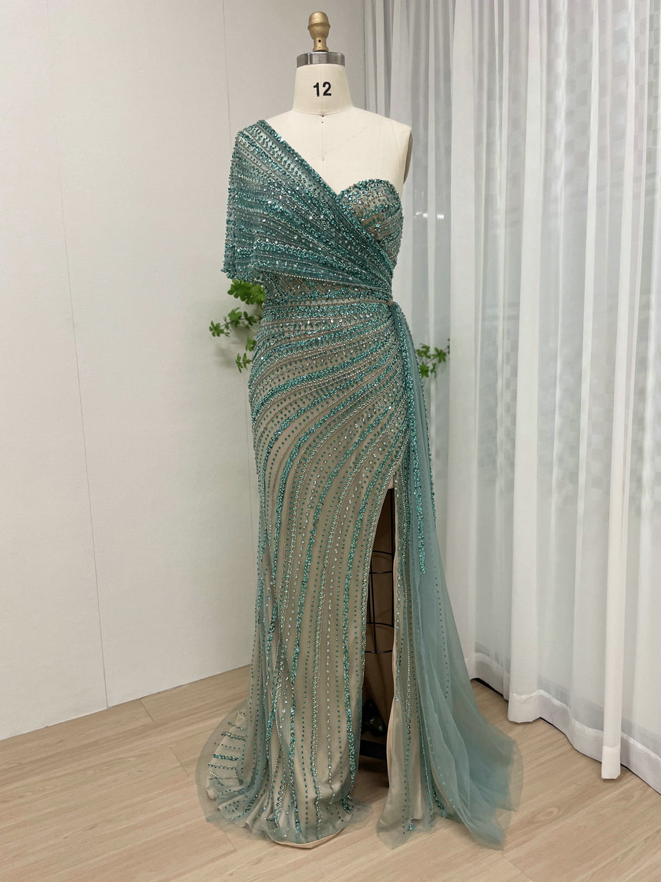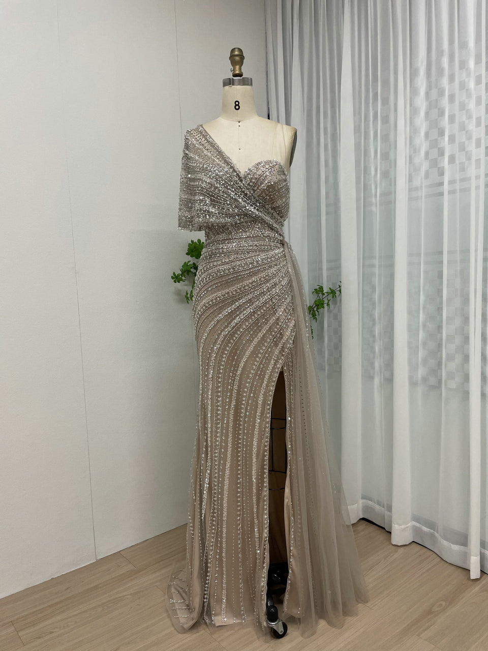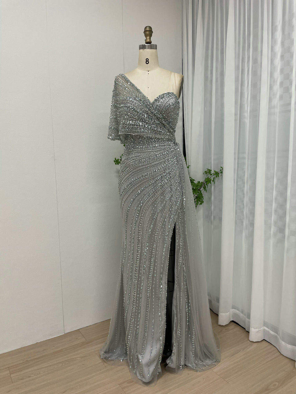 Exclusive Luxury Handmade Beading Evening Dress One-Shoulder High Slit Wedding Party Dress MB40028-3