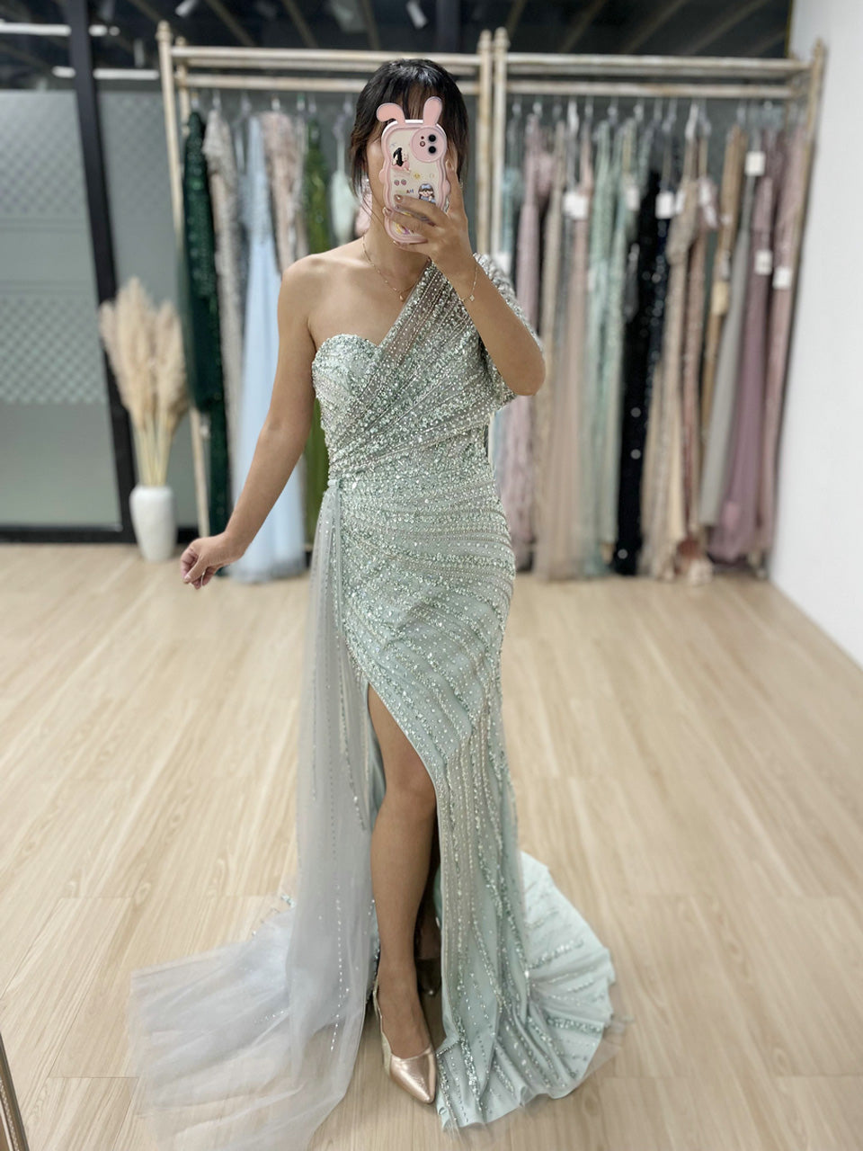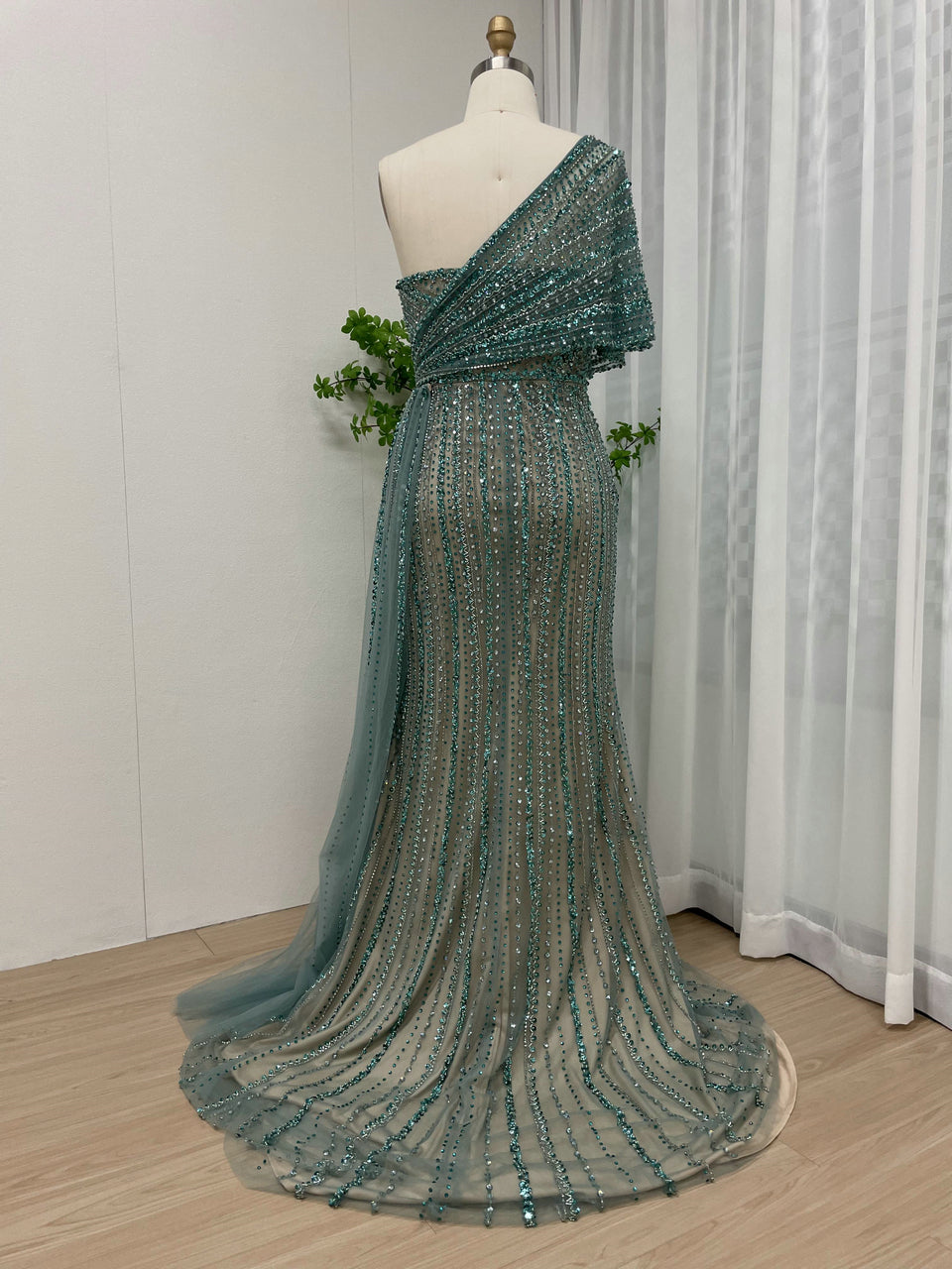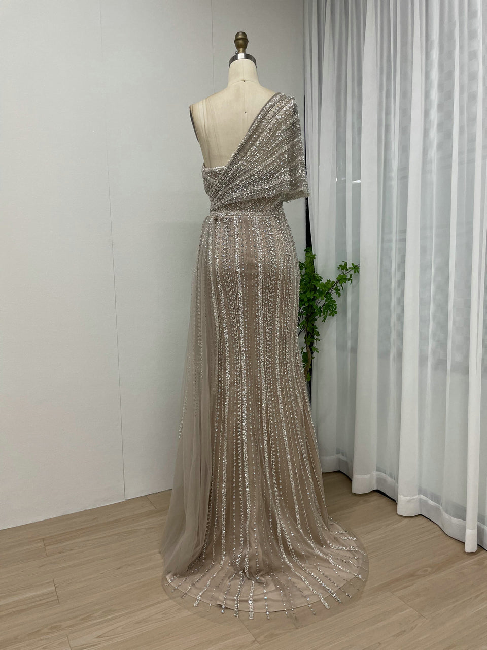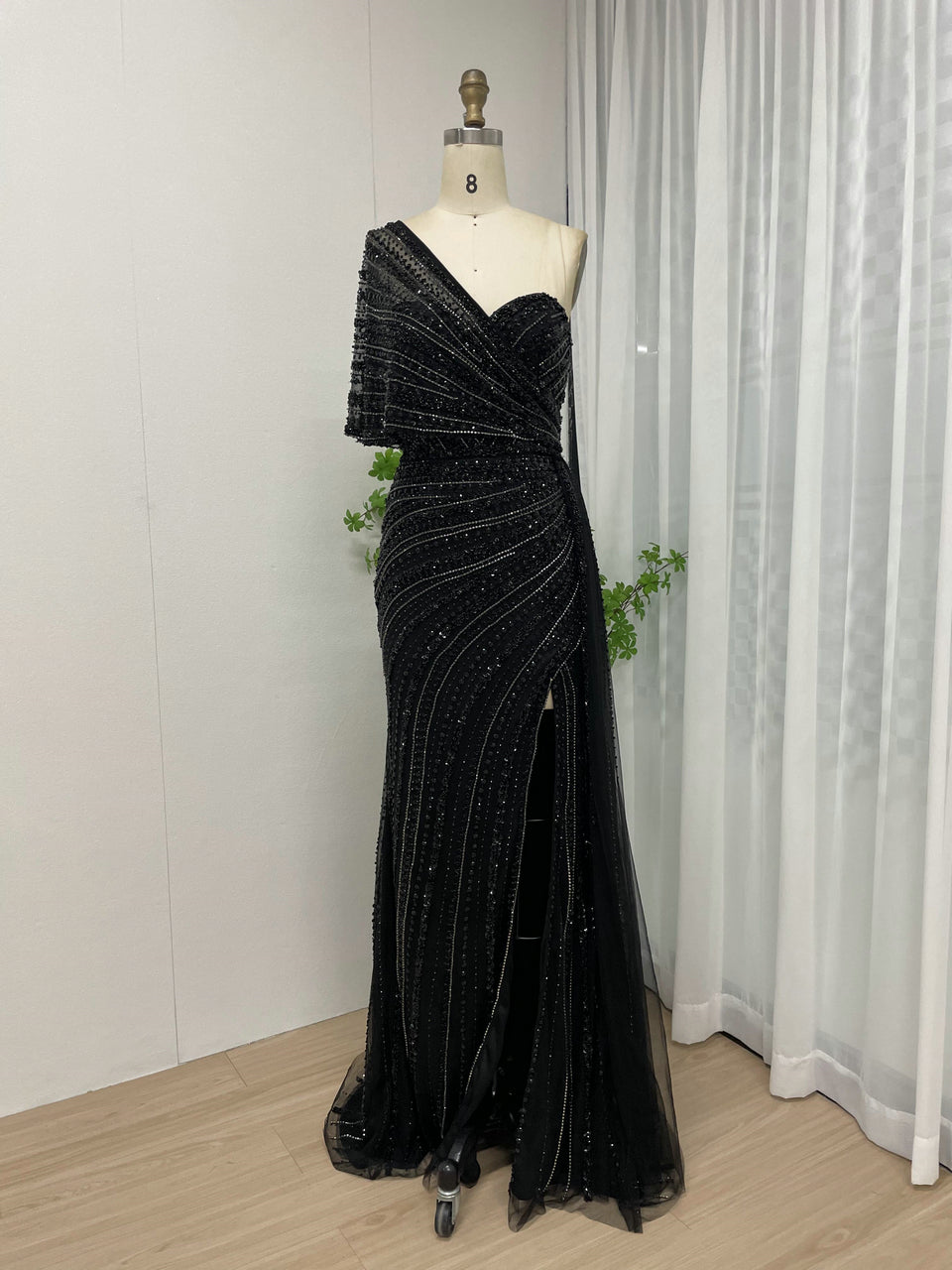 Exclusive Luxury Handmade Beading Evening Dress One-Shoulder High Slit Wedding Party Dress MB40028-3