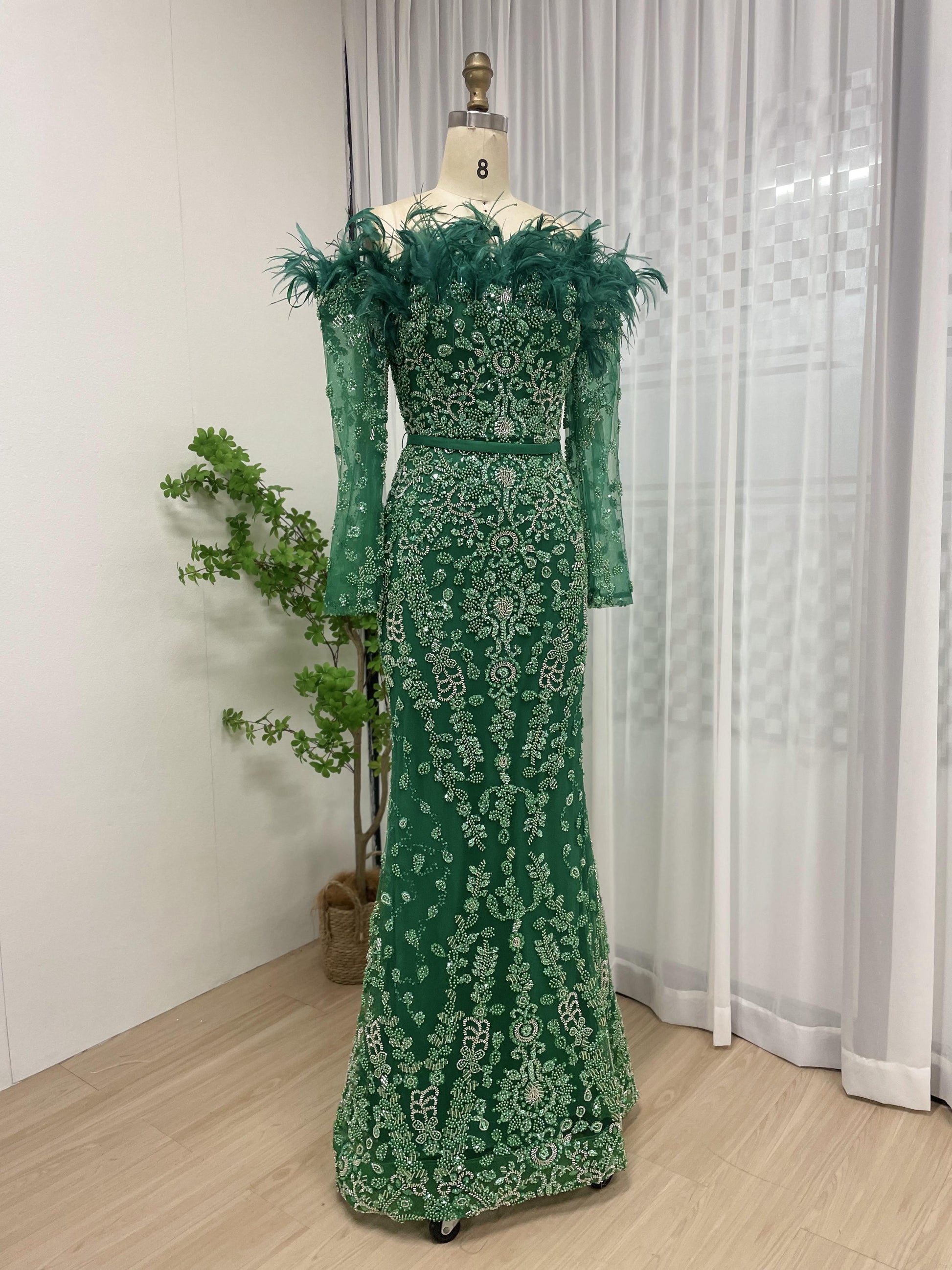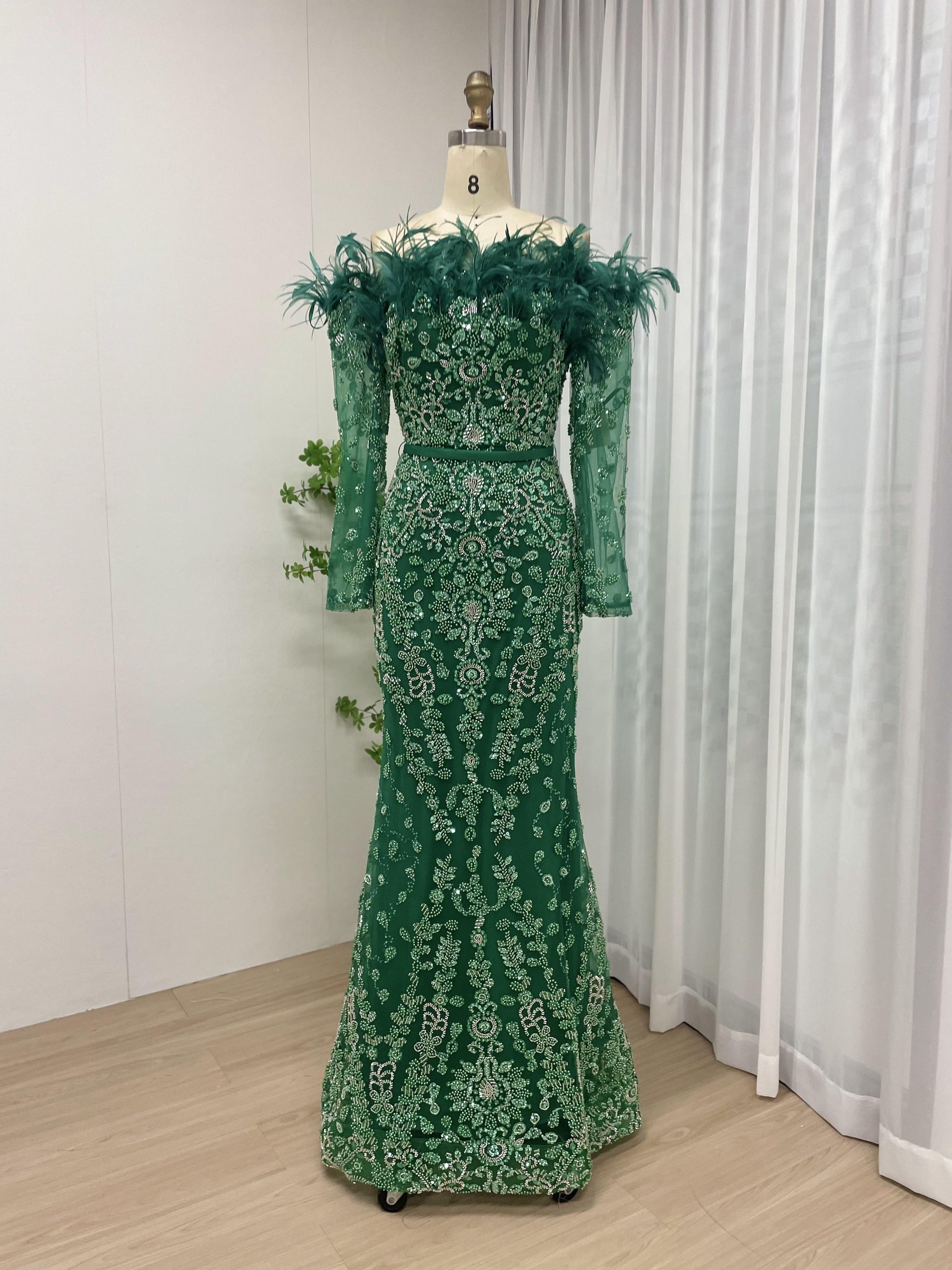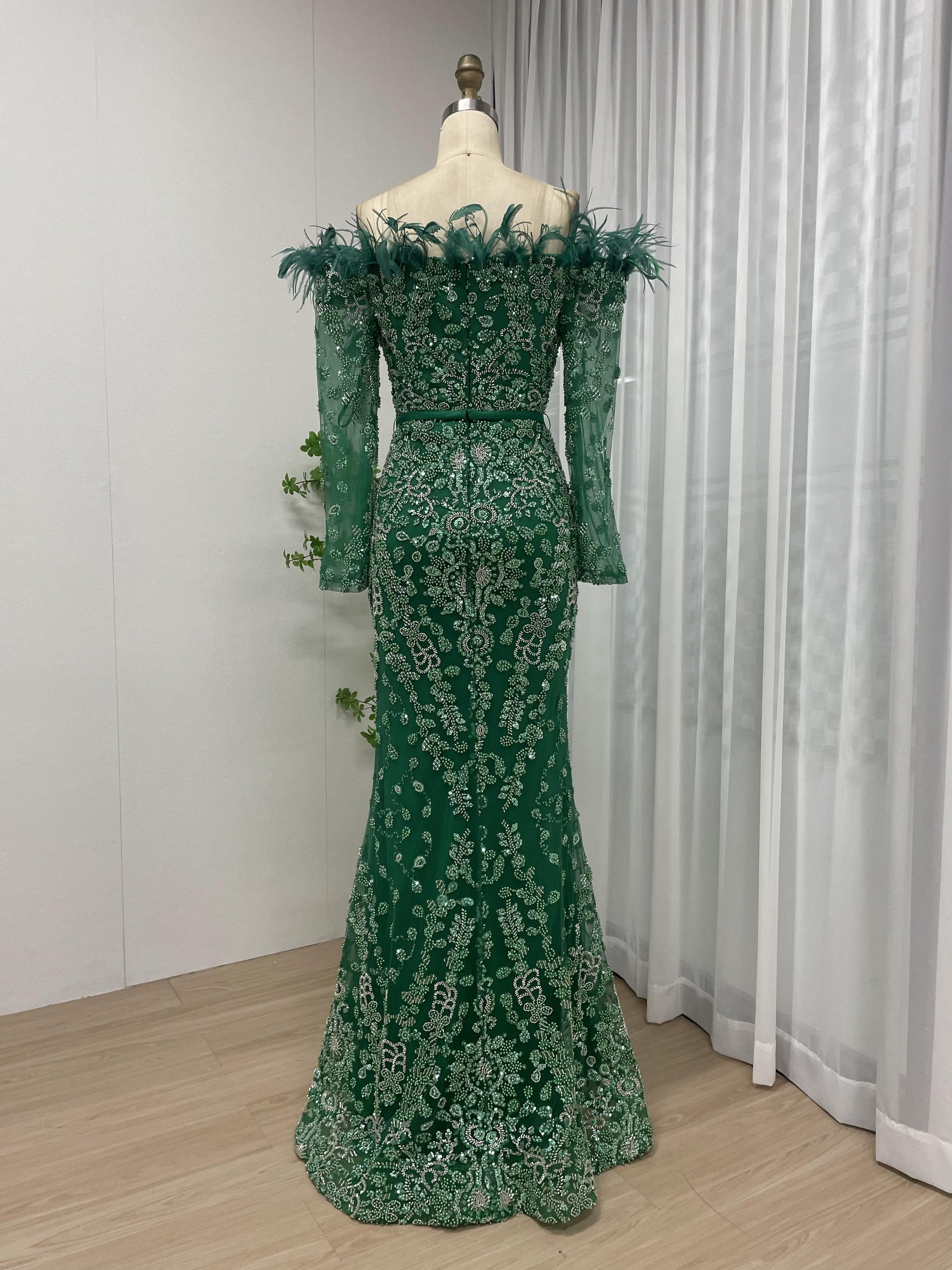 Exclusive Off Shoulder Feather Embelished Green Wedding Party Formal Dress MB40219