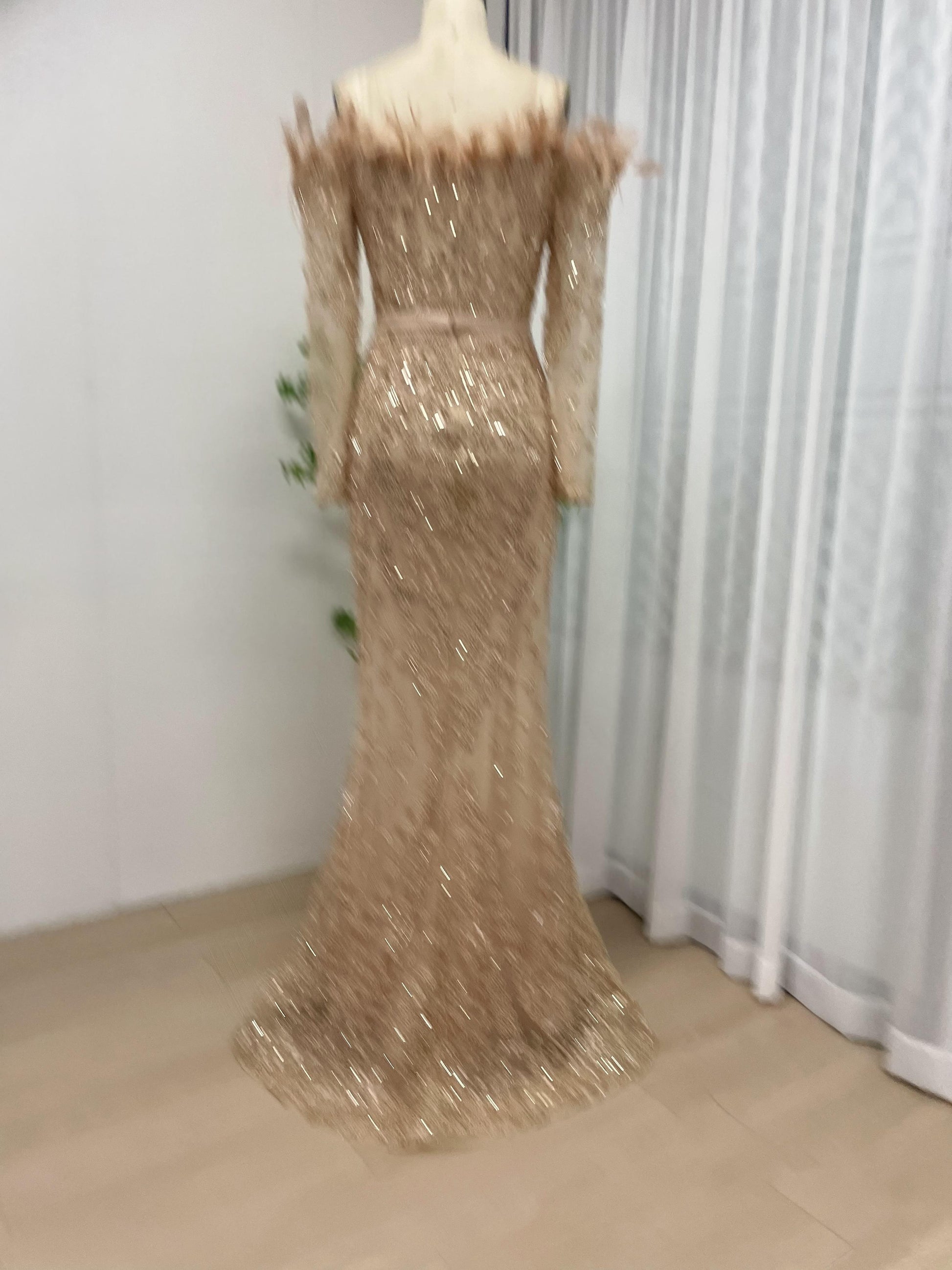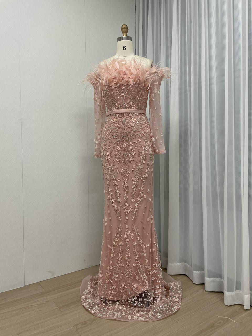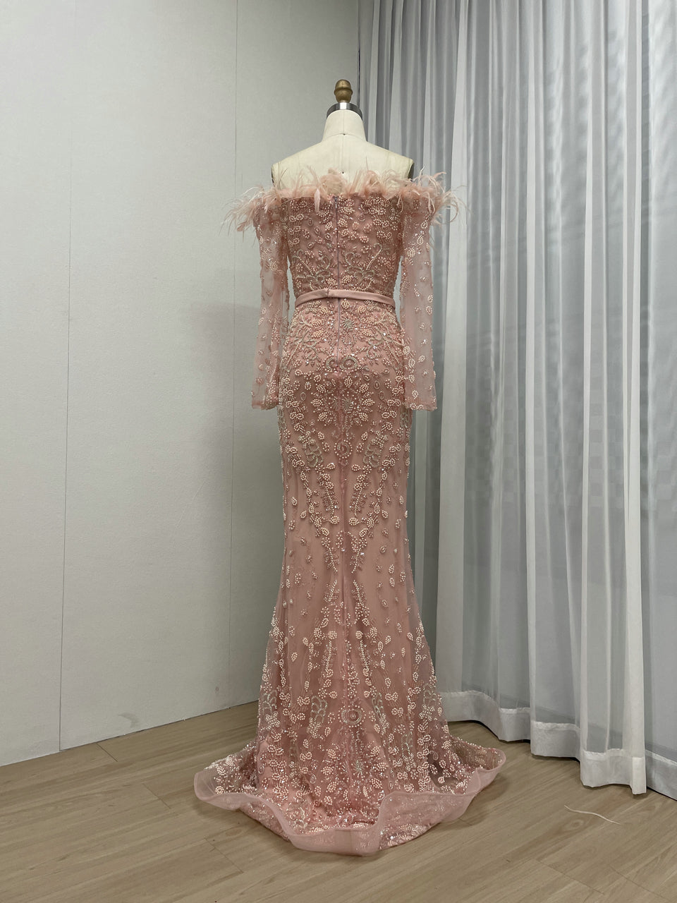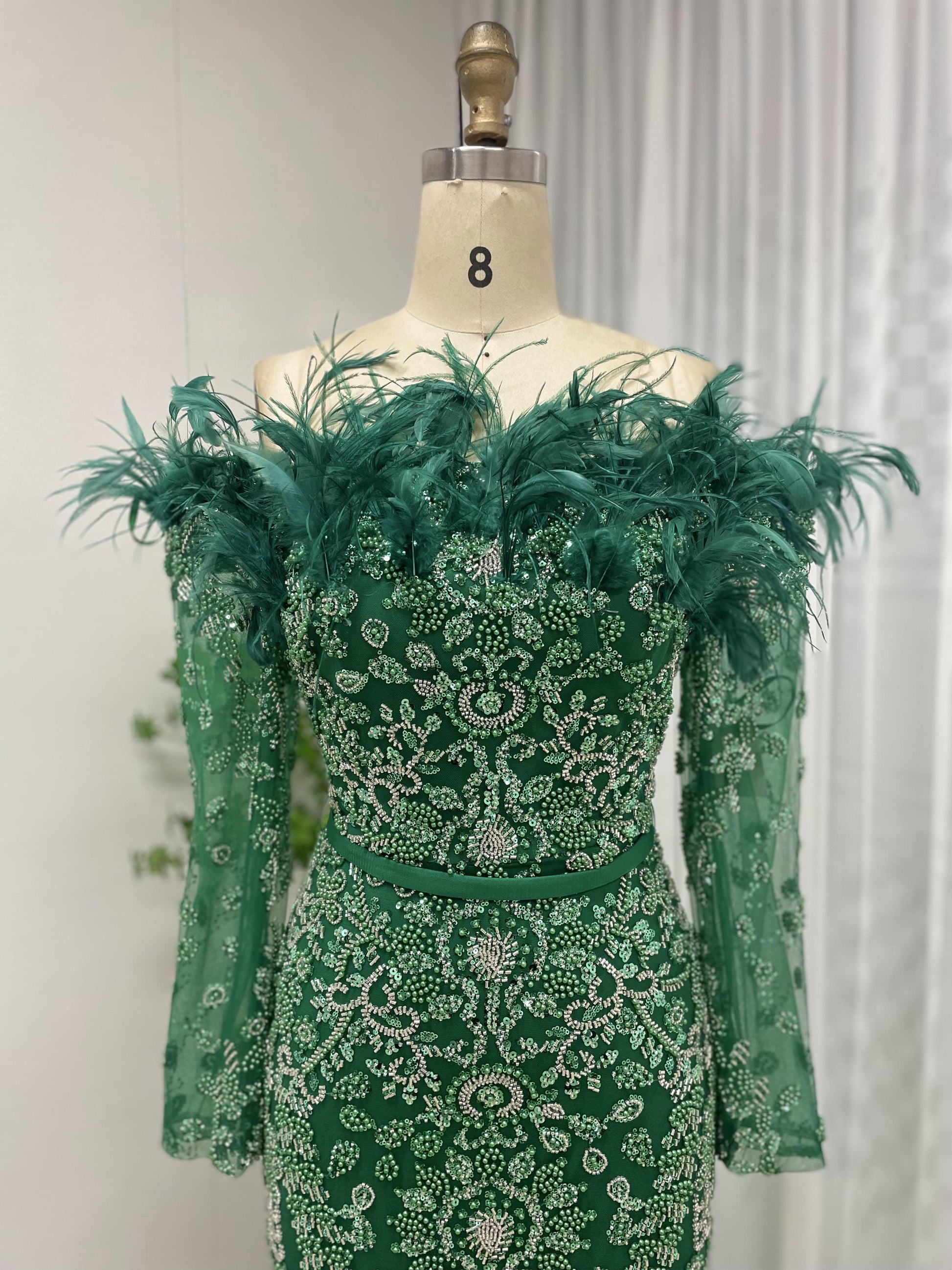 Exclusive Off Shoulder Feather Embelished Green Wedding Party Formal Dress MB40219