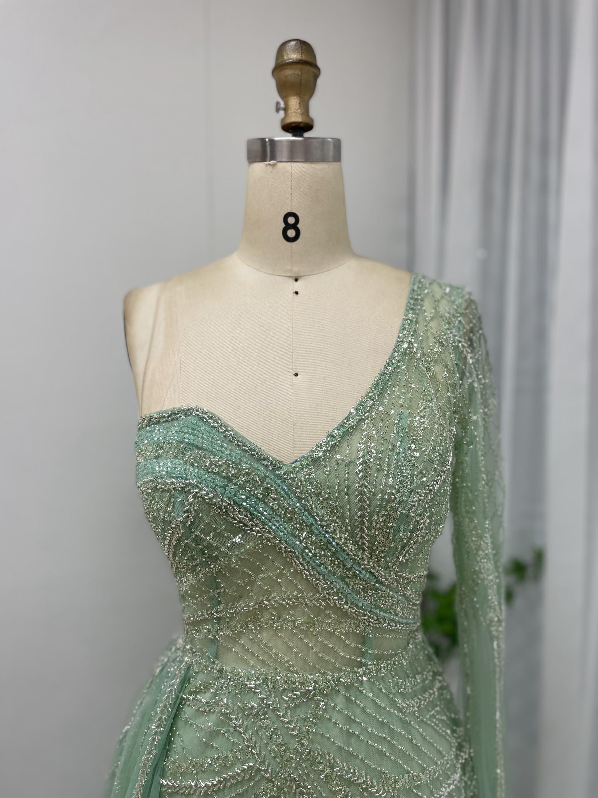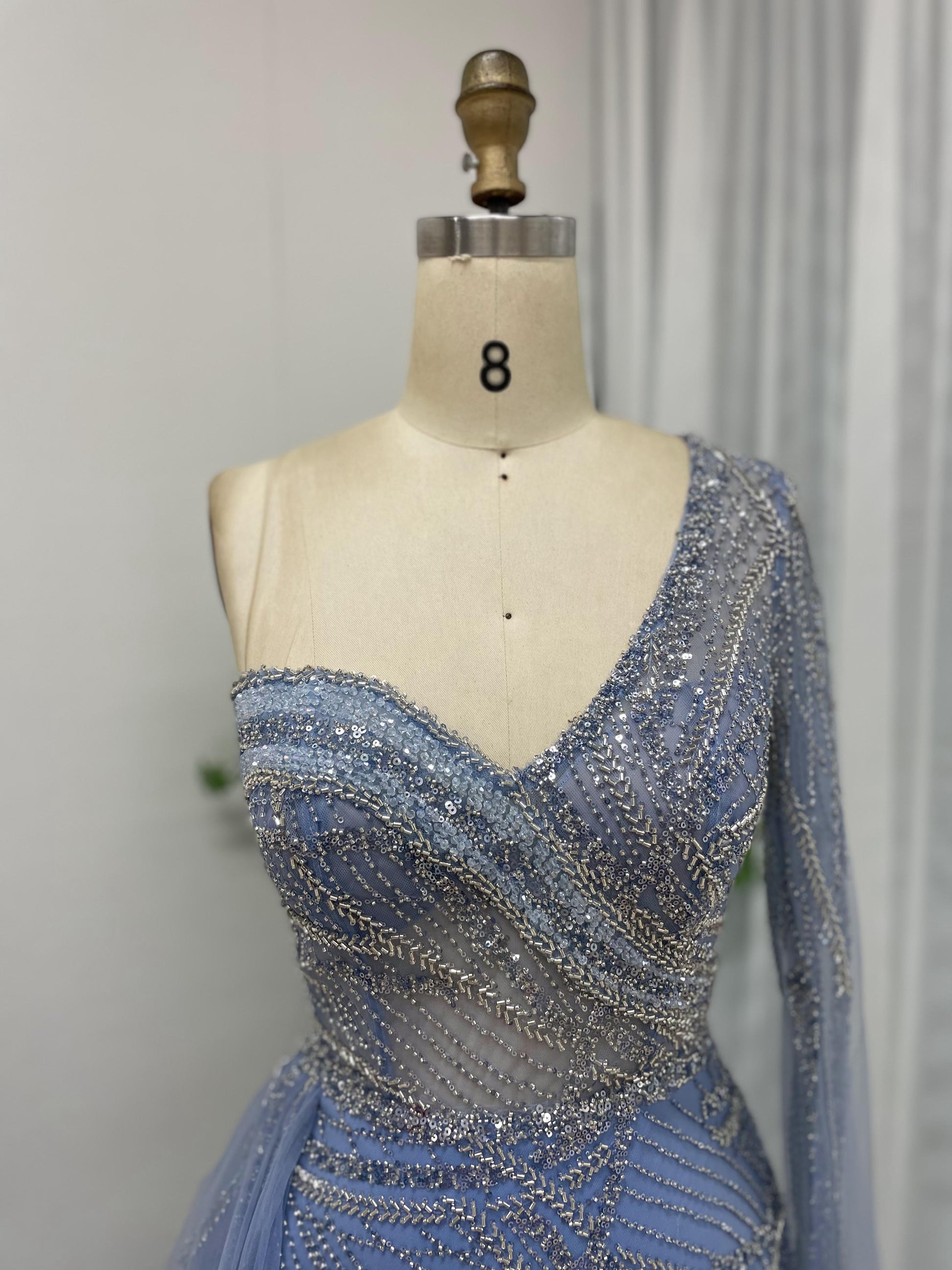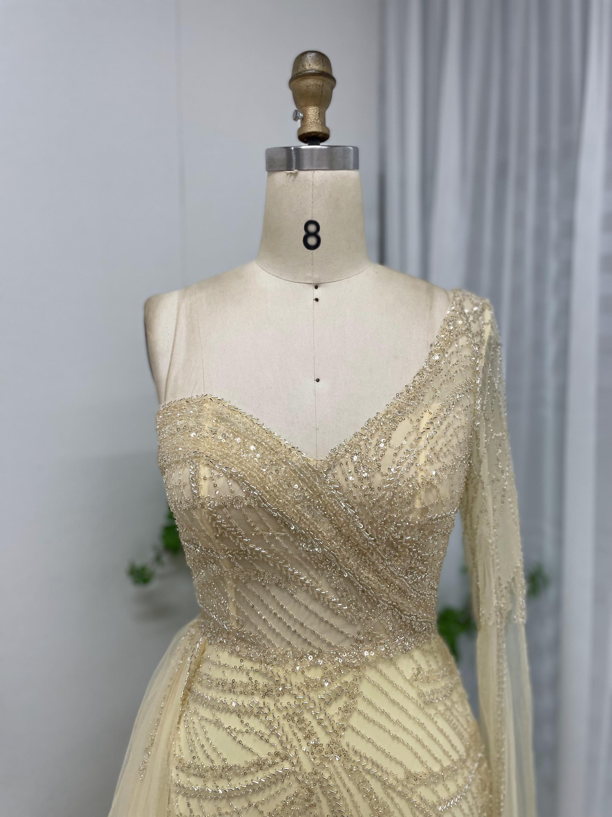 Exclusive One Shoulder Couture Beading Lace Cape Long Sleeve Evening Dress MB40178