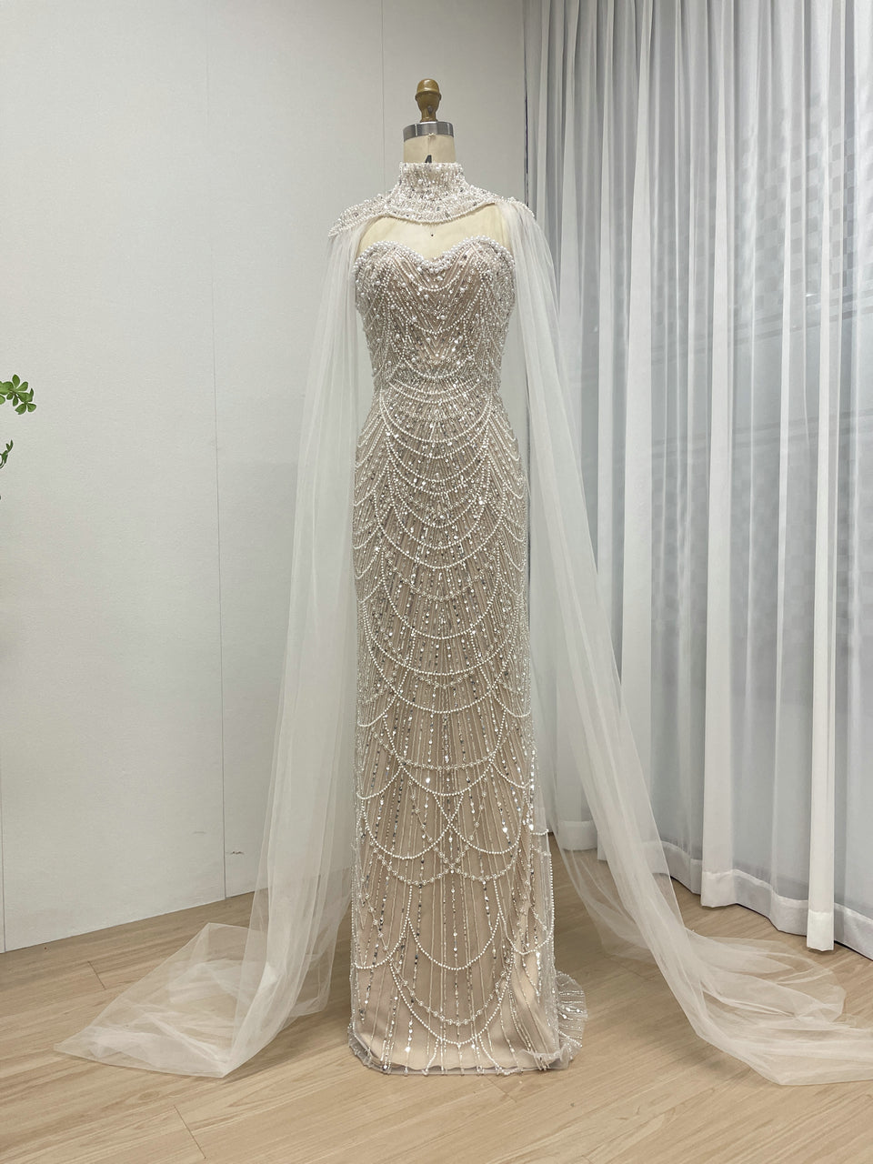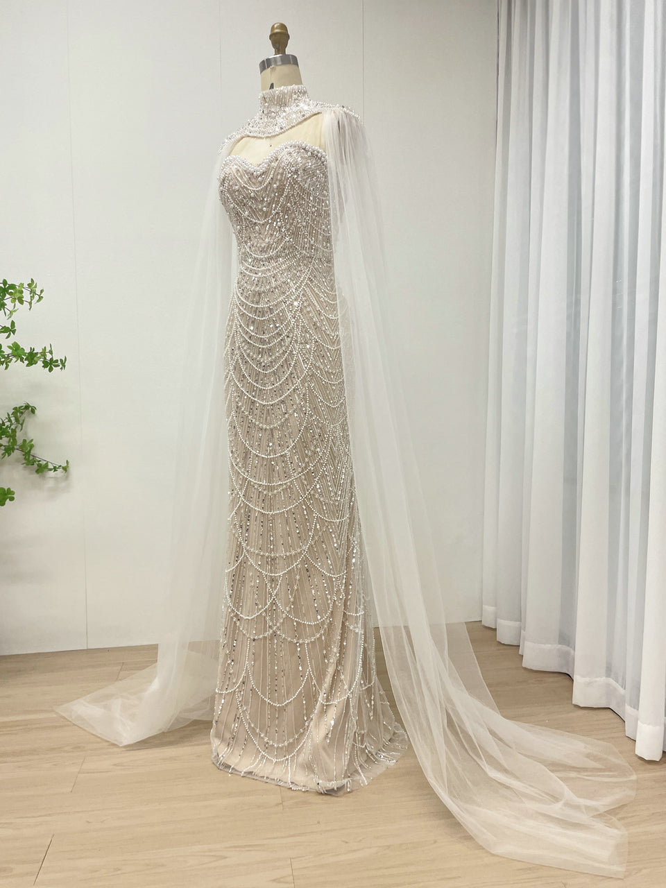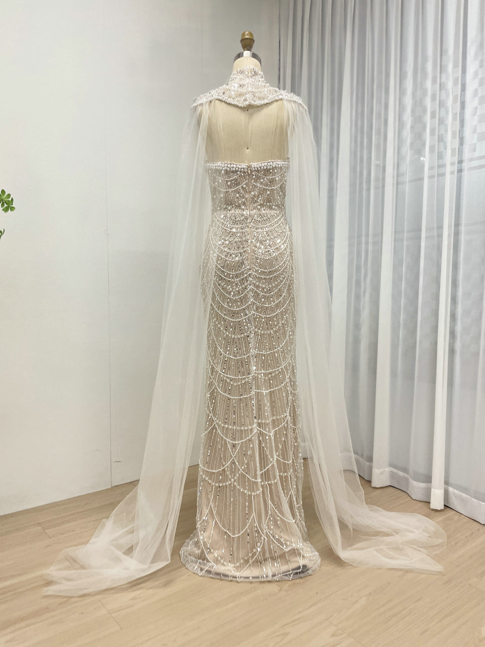 Exquisite White Hand Beaded Evening Dress With Detachable Sheer Cape for Glamorous Occasions MB40368