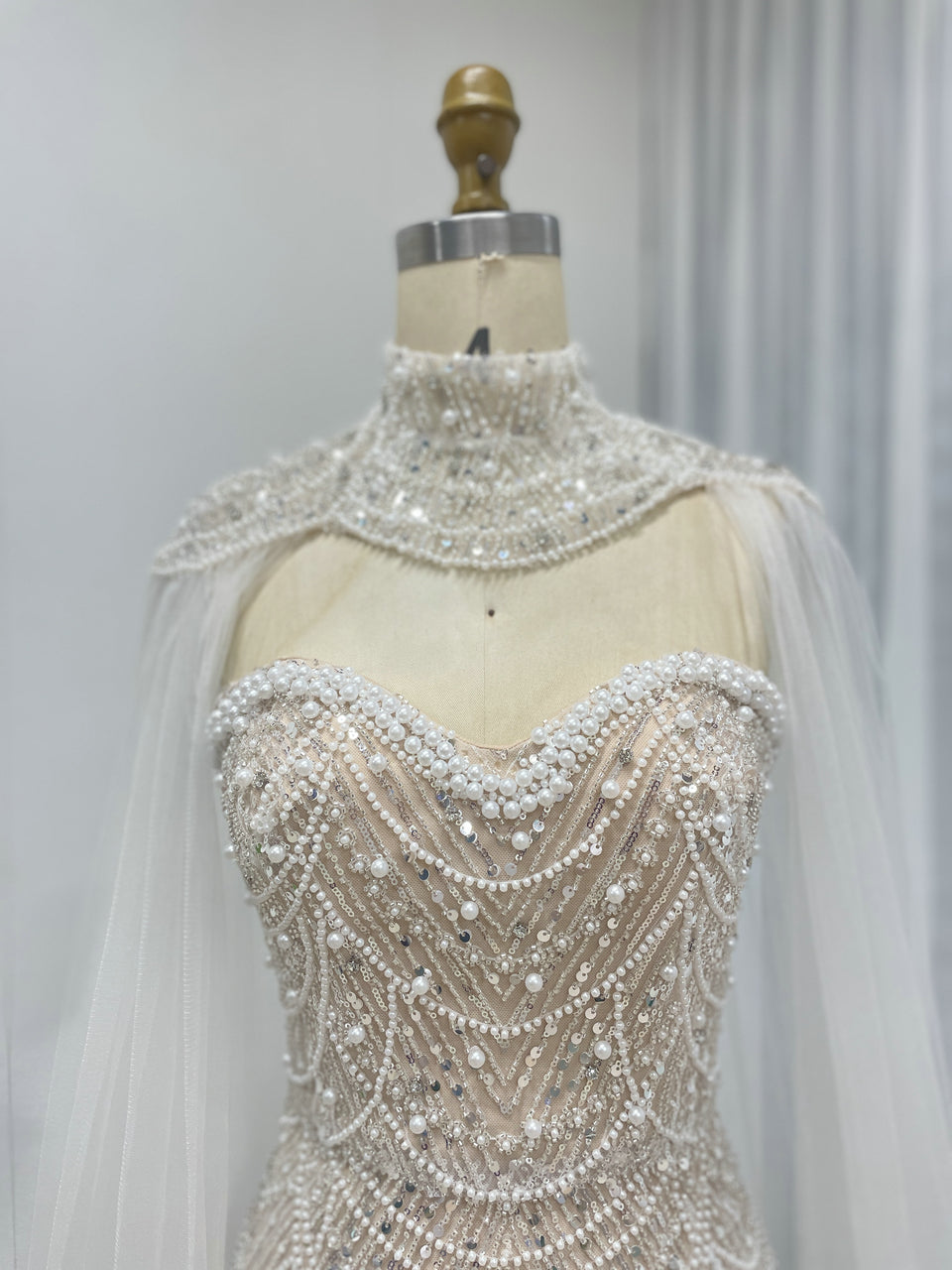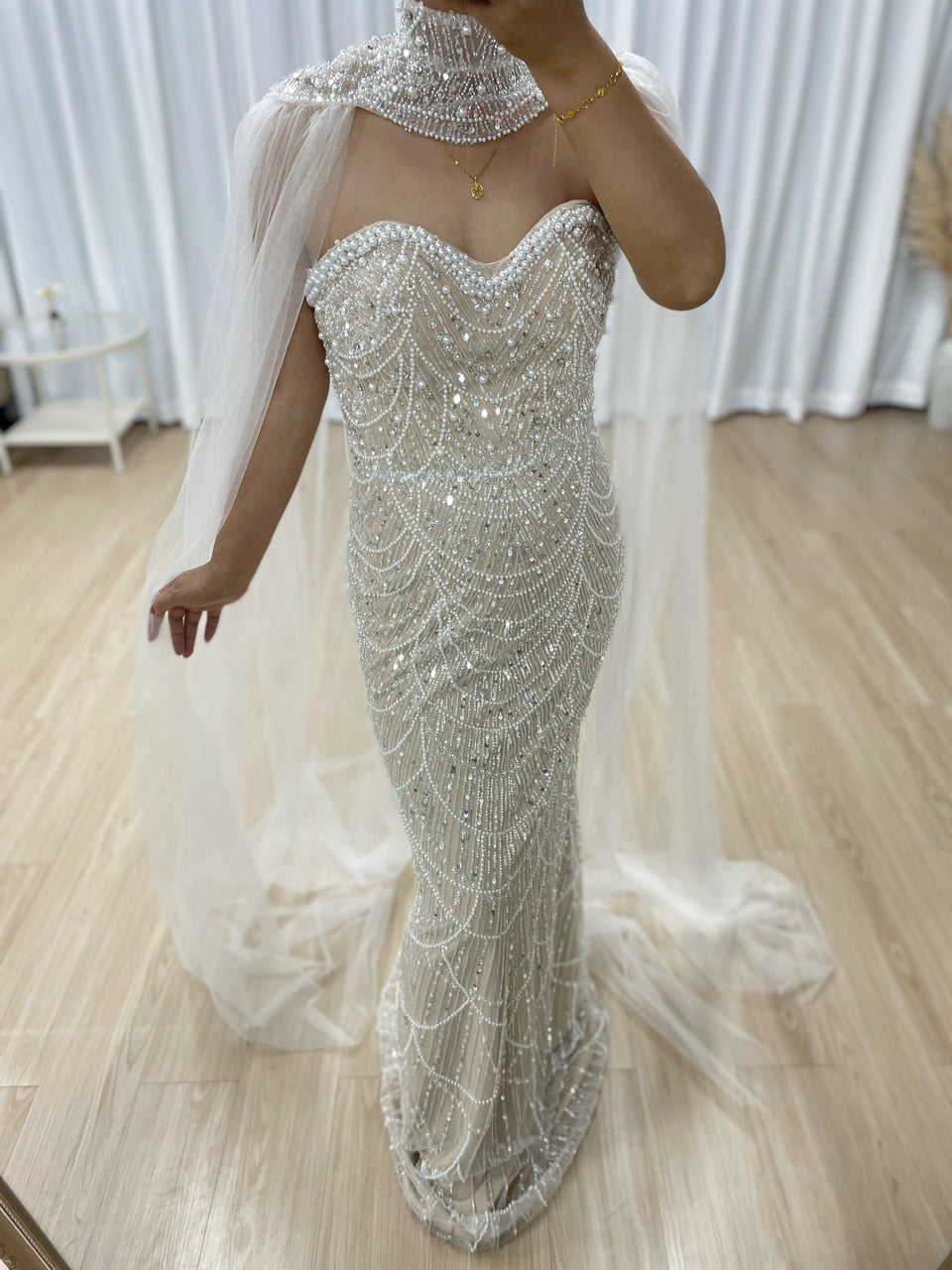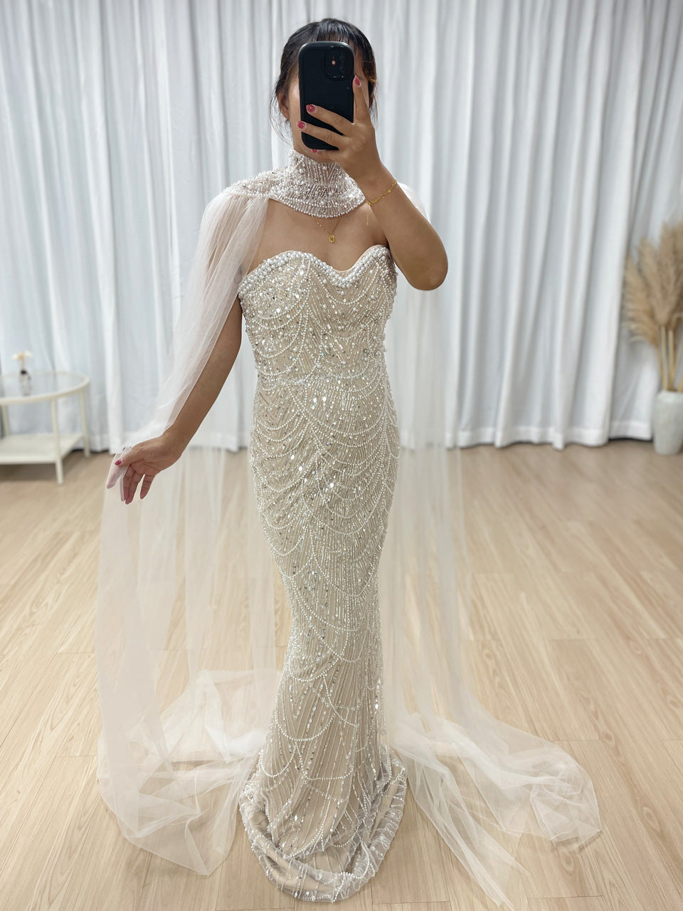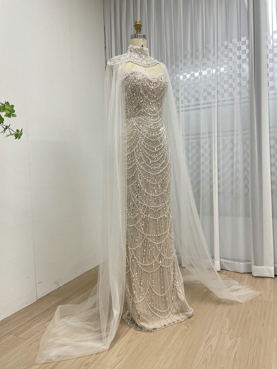 Exquisite White Hand Beaded Evening Dress With Detachable Sheer Cape for Glamorous Occasions MB40368